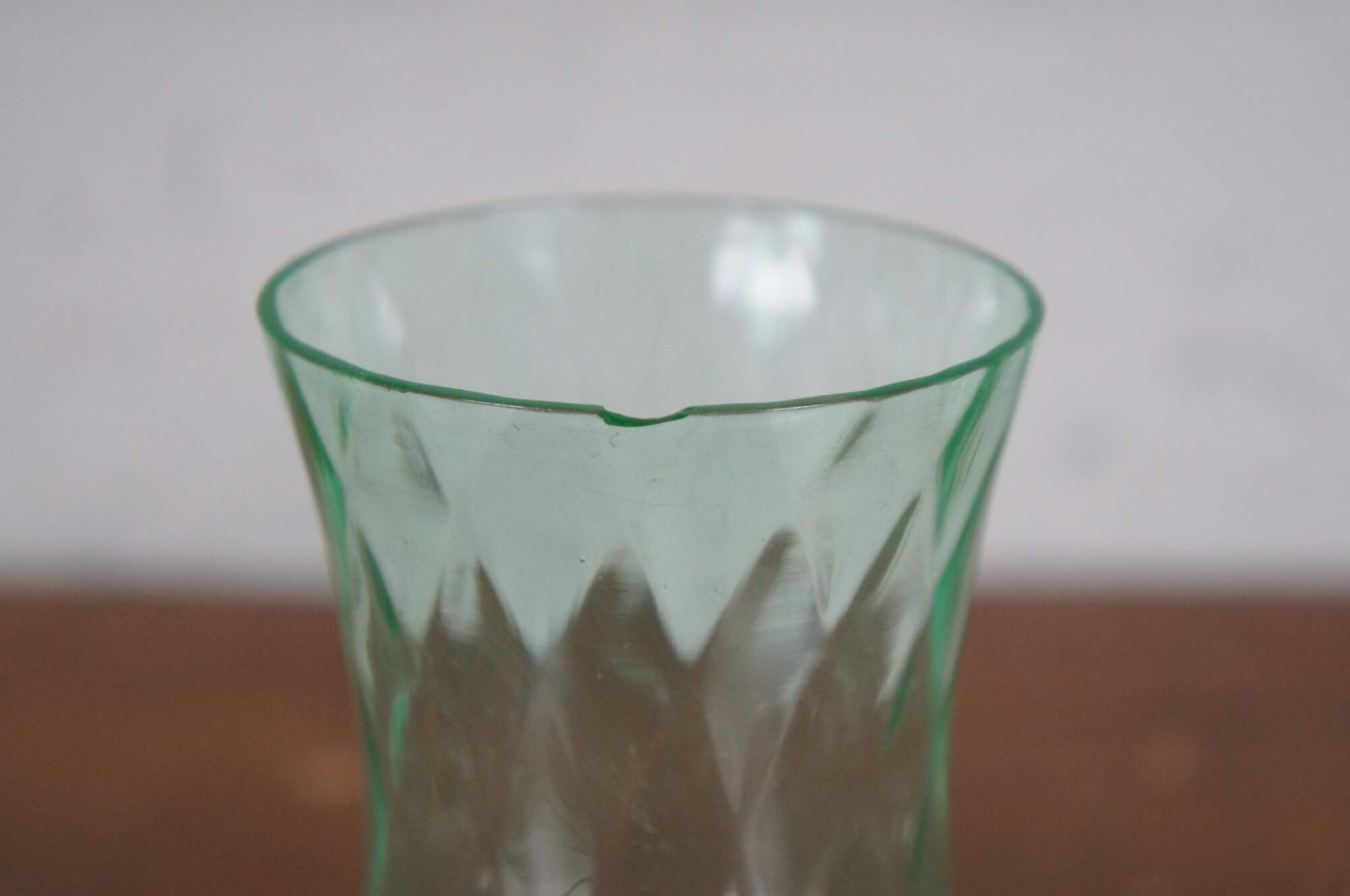 Pair of early to mid 20th century green uranium glass wine goblets with flared mouth and subtle diamond pattern texture. Attributed to Hazel Atlas, harlequin pattern.