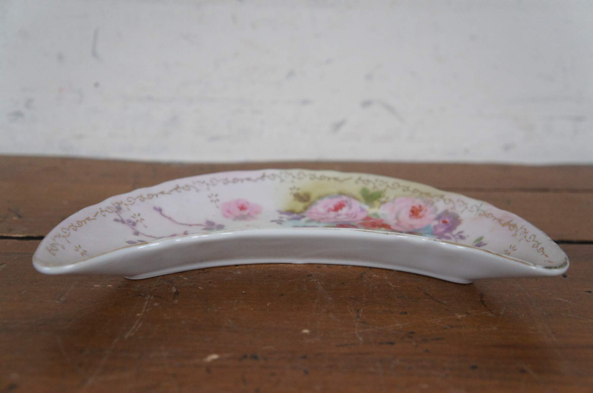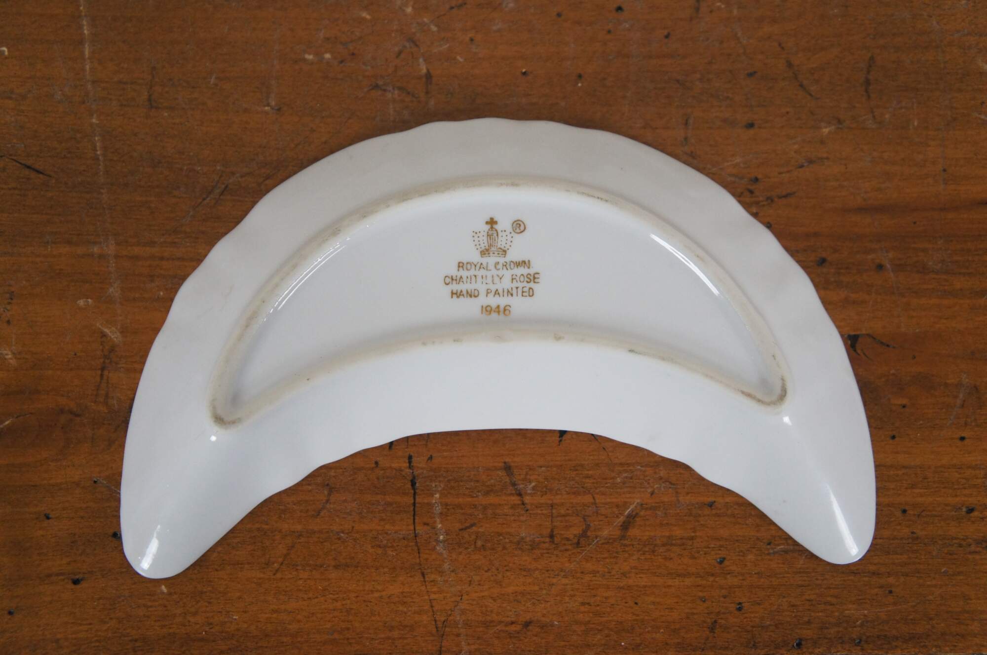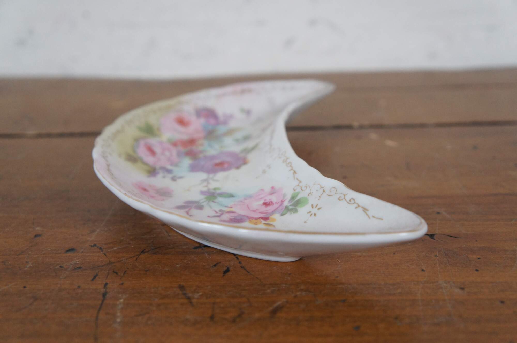 Antique 1946 crescent shaped porcelain salad dish / bone dish / trinket dish by Royal Crown of Japan in the Chantilly Rose pattern. Scalloped edge crescent moon shape, decorated with pink and purple roses in a combination of printed and hand painted details. Signed P. Kent.