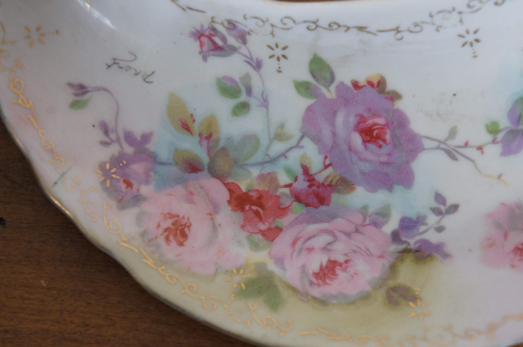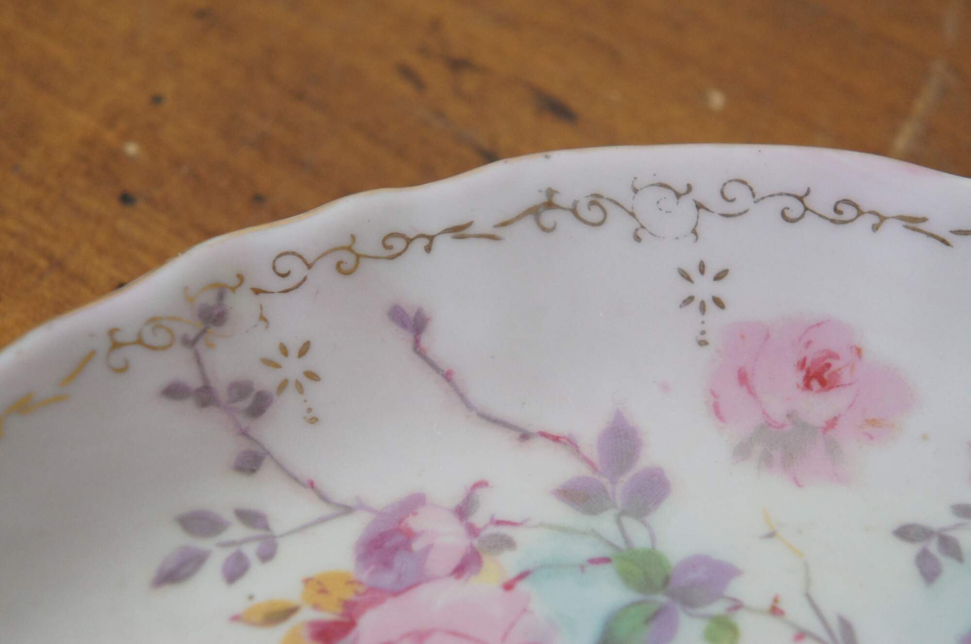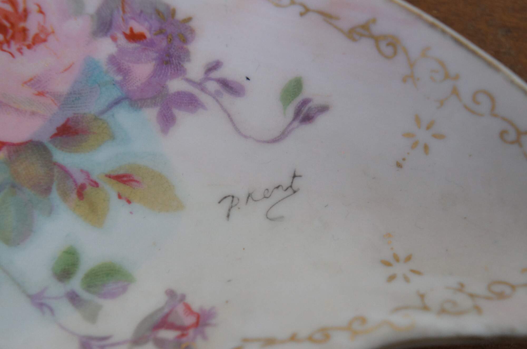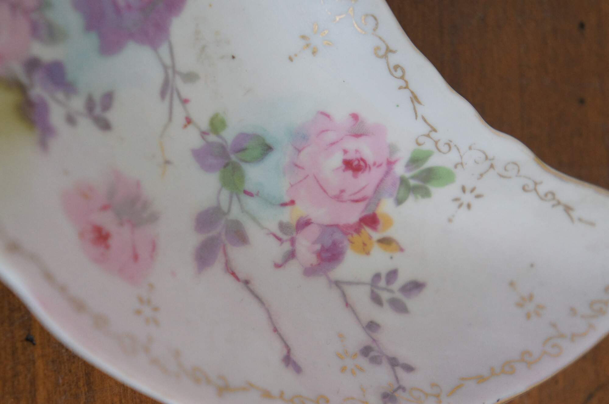 Antique 1946 crescent shaped porcelain salad dish / bone dish / trinket dish by Royal Crown of Japan in the Chantilly Rose pattern. Scalloped edge crescent moon shape, decorated with pink and purple roses in a combination of printed and hand painted details. Signed P. Kent.