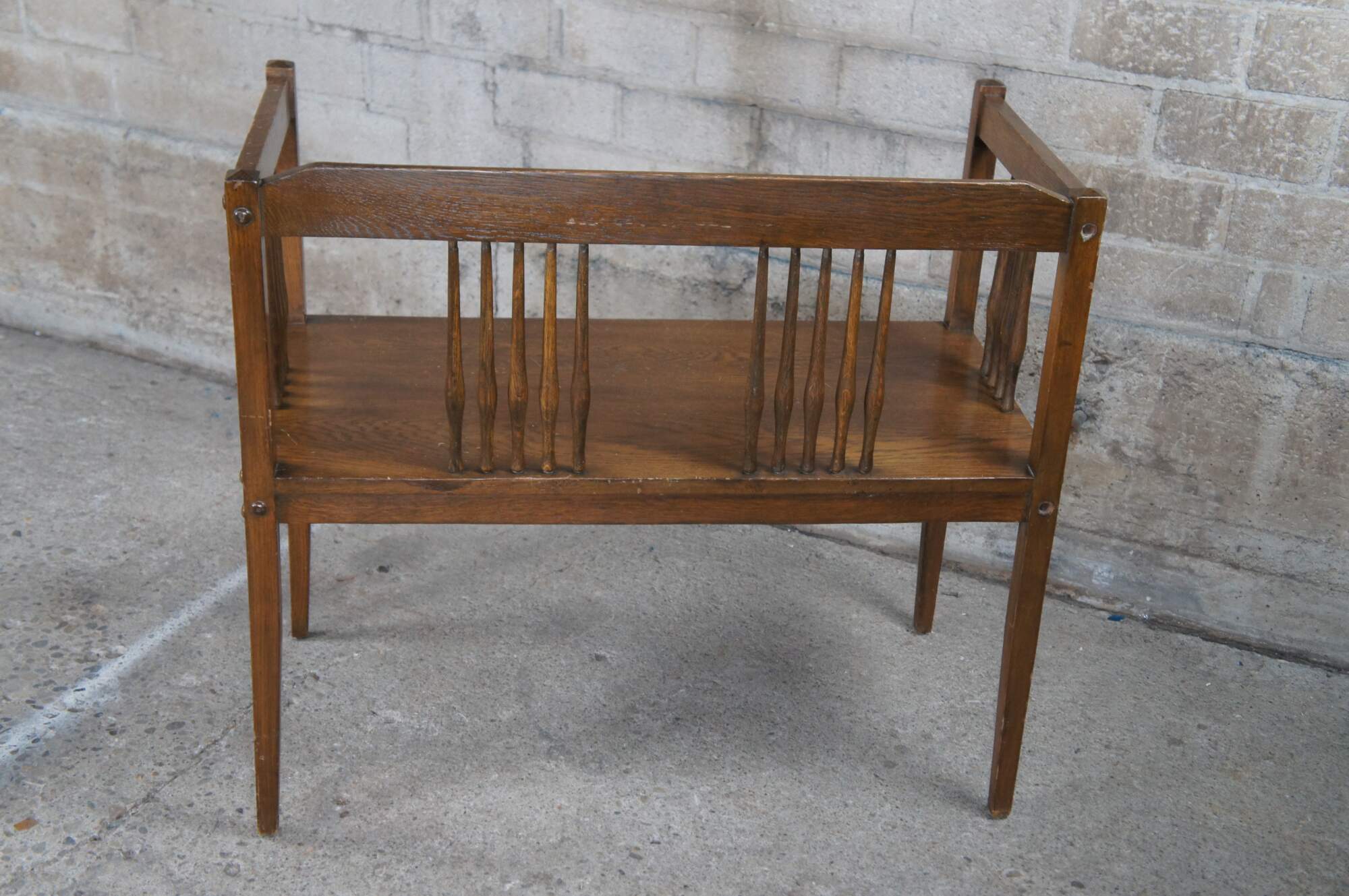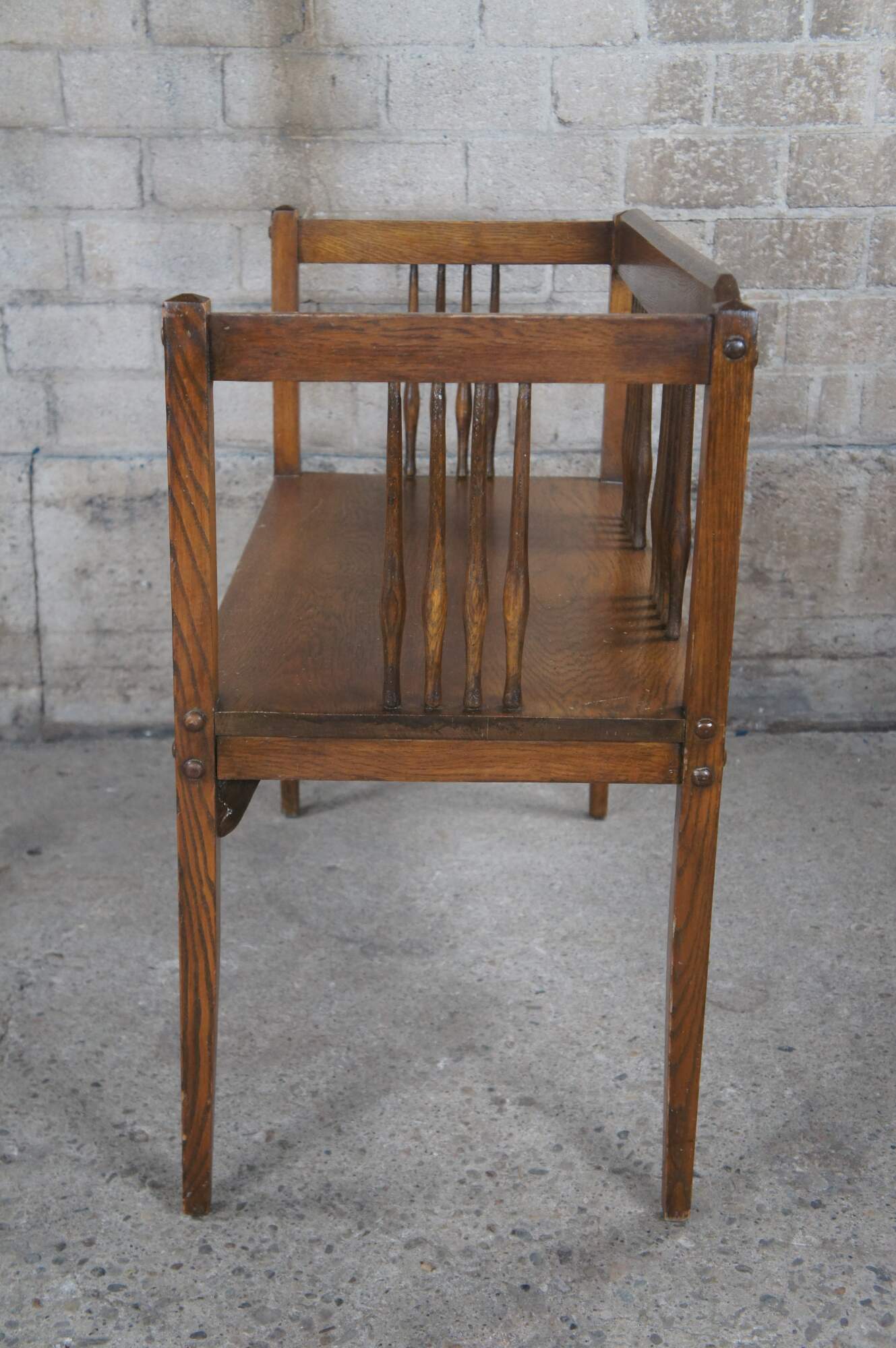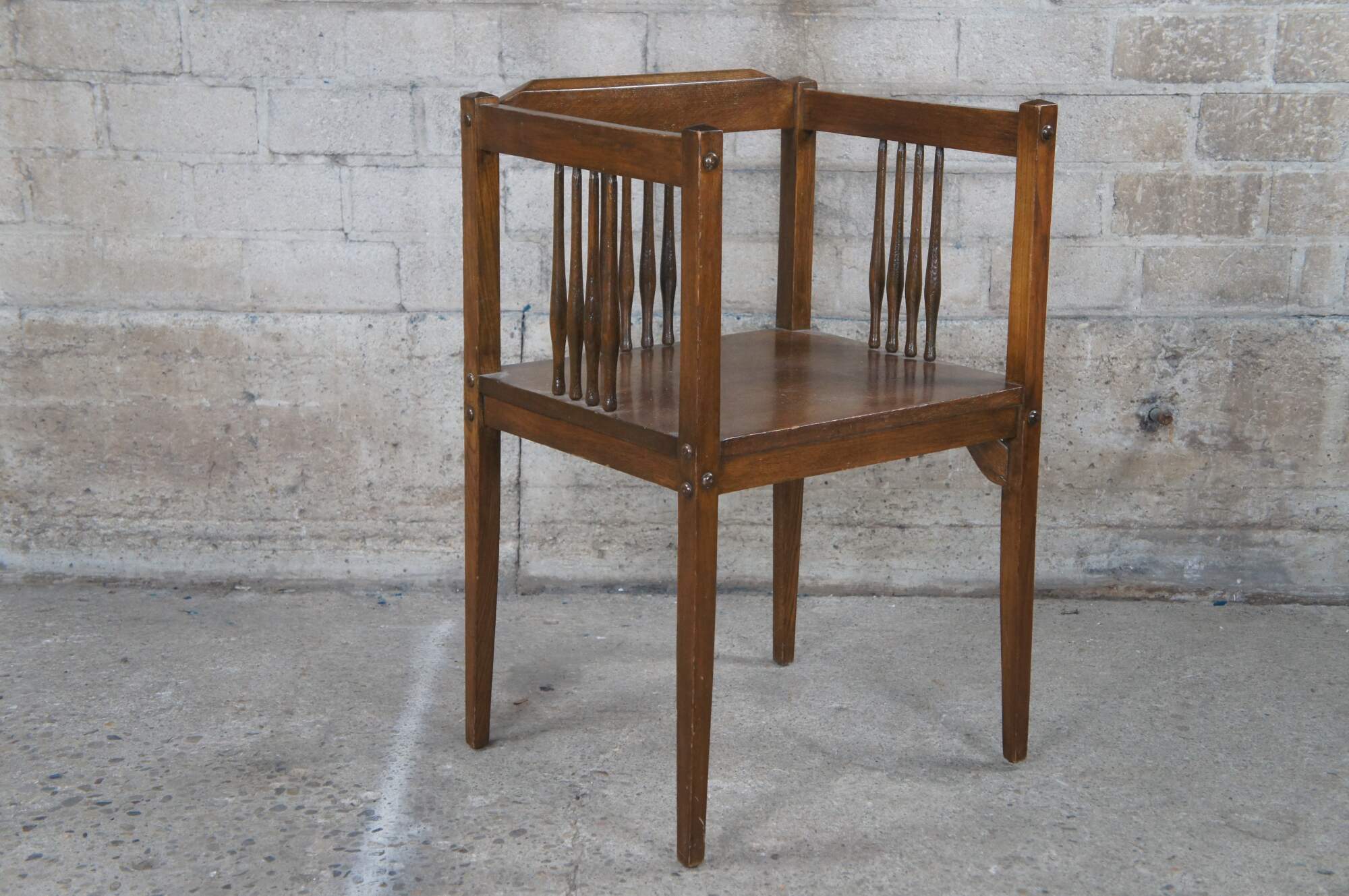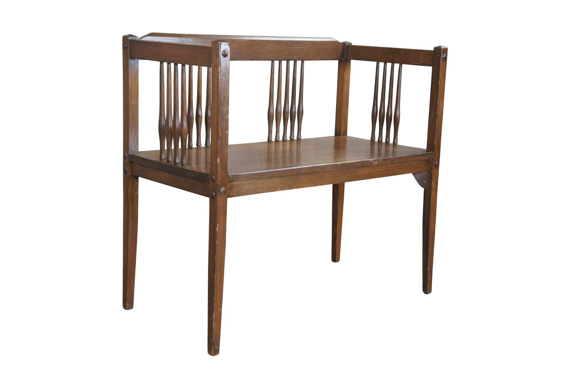 Mid to early 20th century bench / settee and arm chair. Made of oak featuring Mission and arts & crafts styling with squared design, spindles and tapered legs.