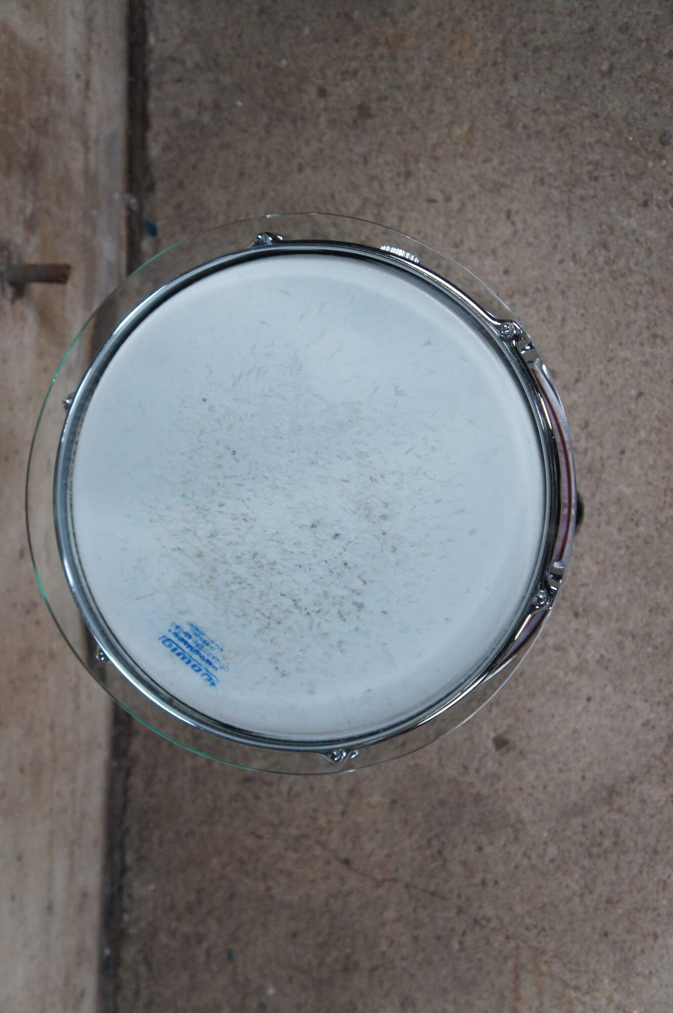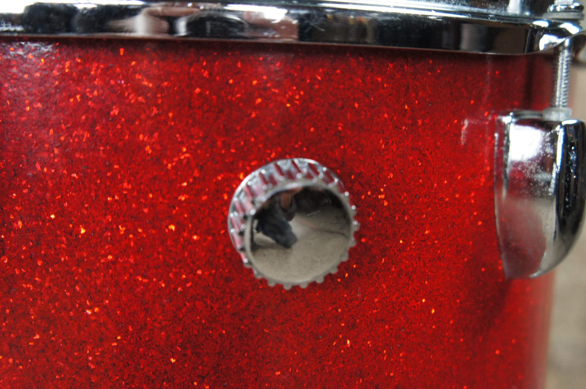 Vintage reclaimed / arts & crafts drum side table. Made from an old Ludwig drum with red sparkle varnish, turned support and cymbal accent base.