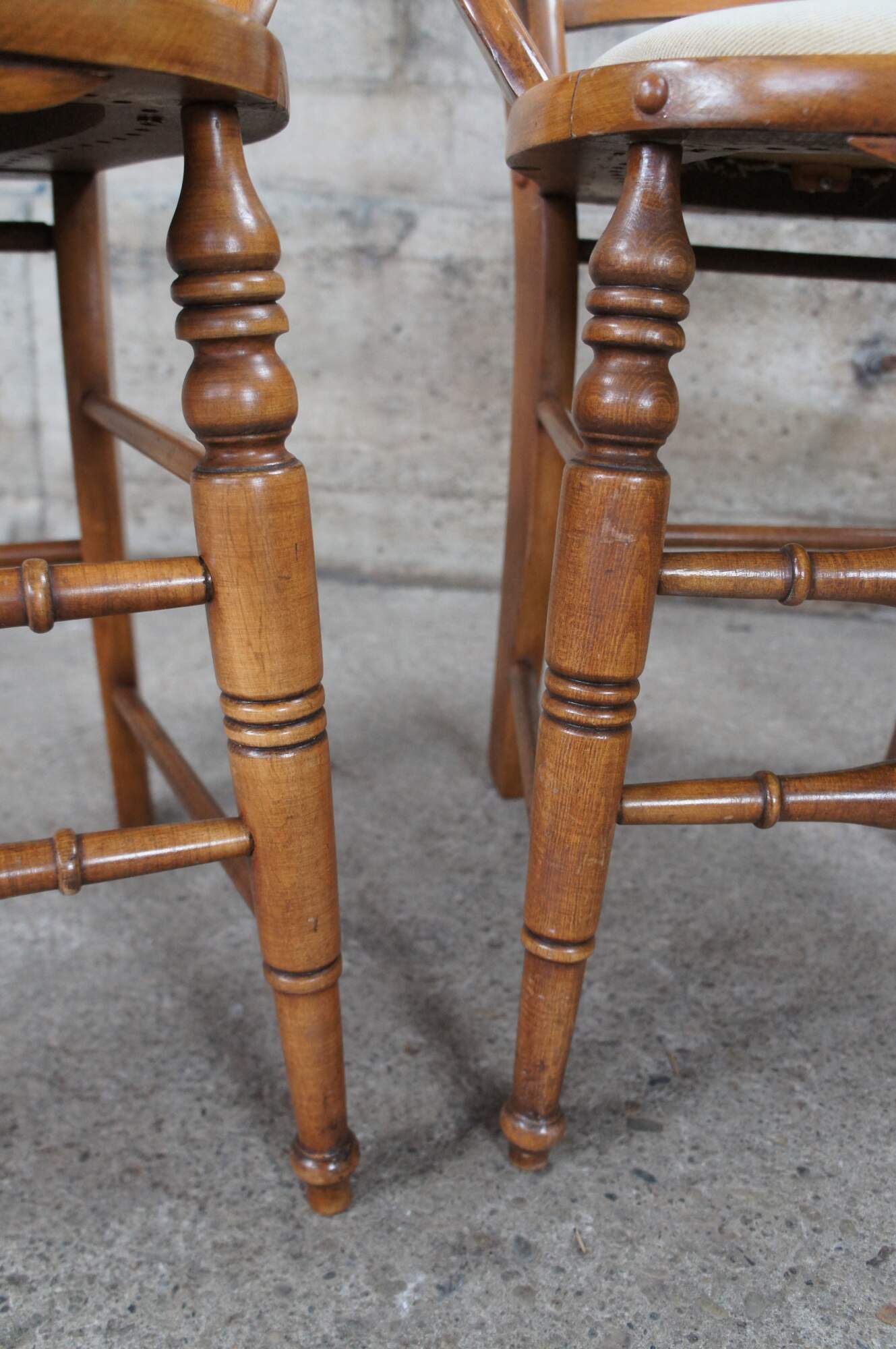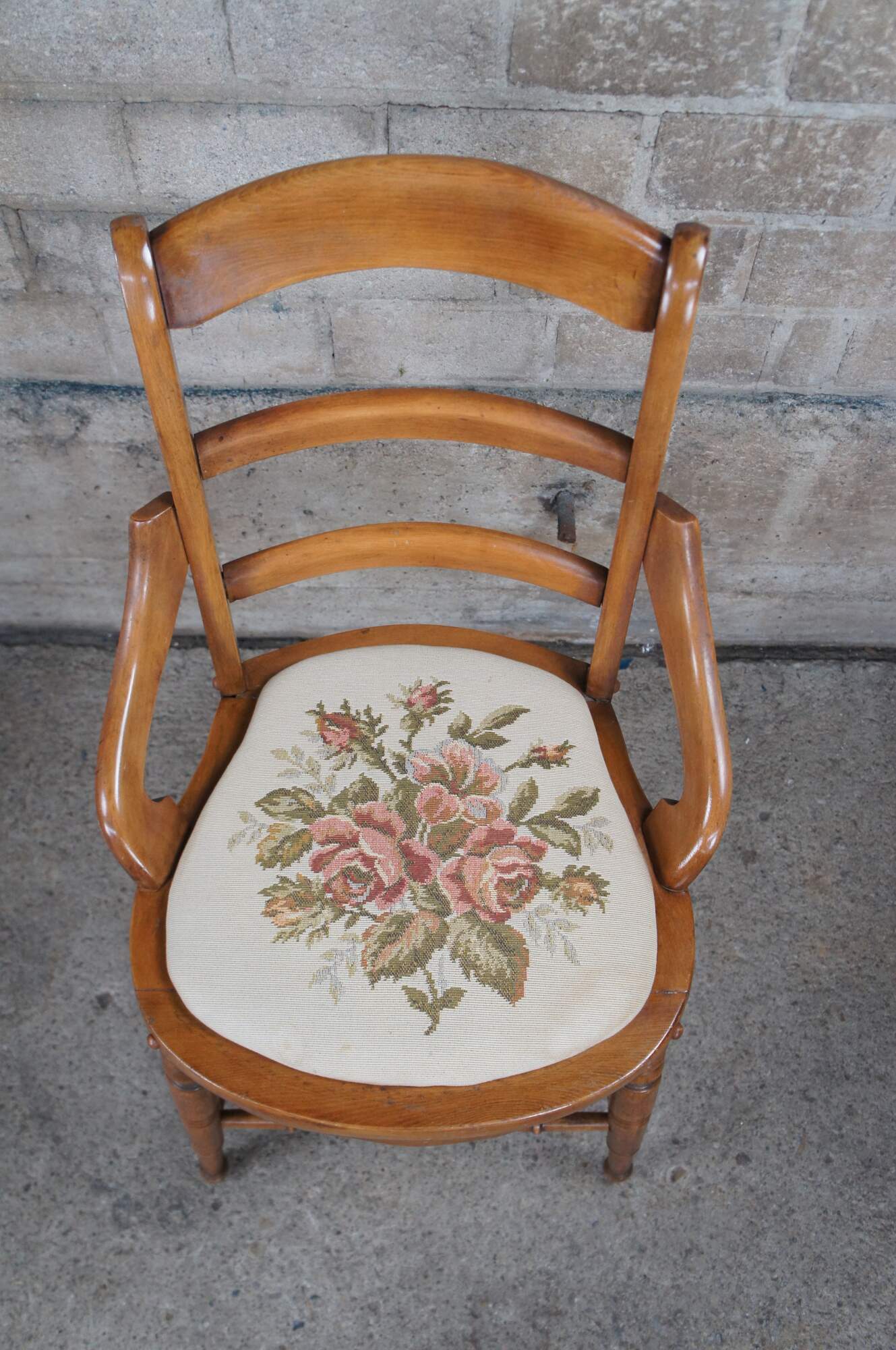 Two antique Victorian Eastlake parlor accent chairs. Made of maple featuring ladderback design with low arm, turned posts, and needlepoint / velvet seats.