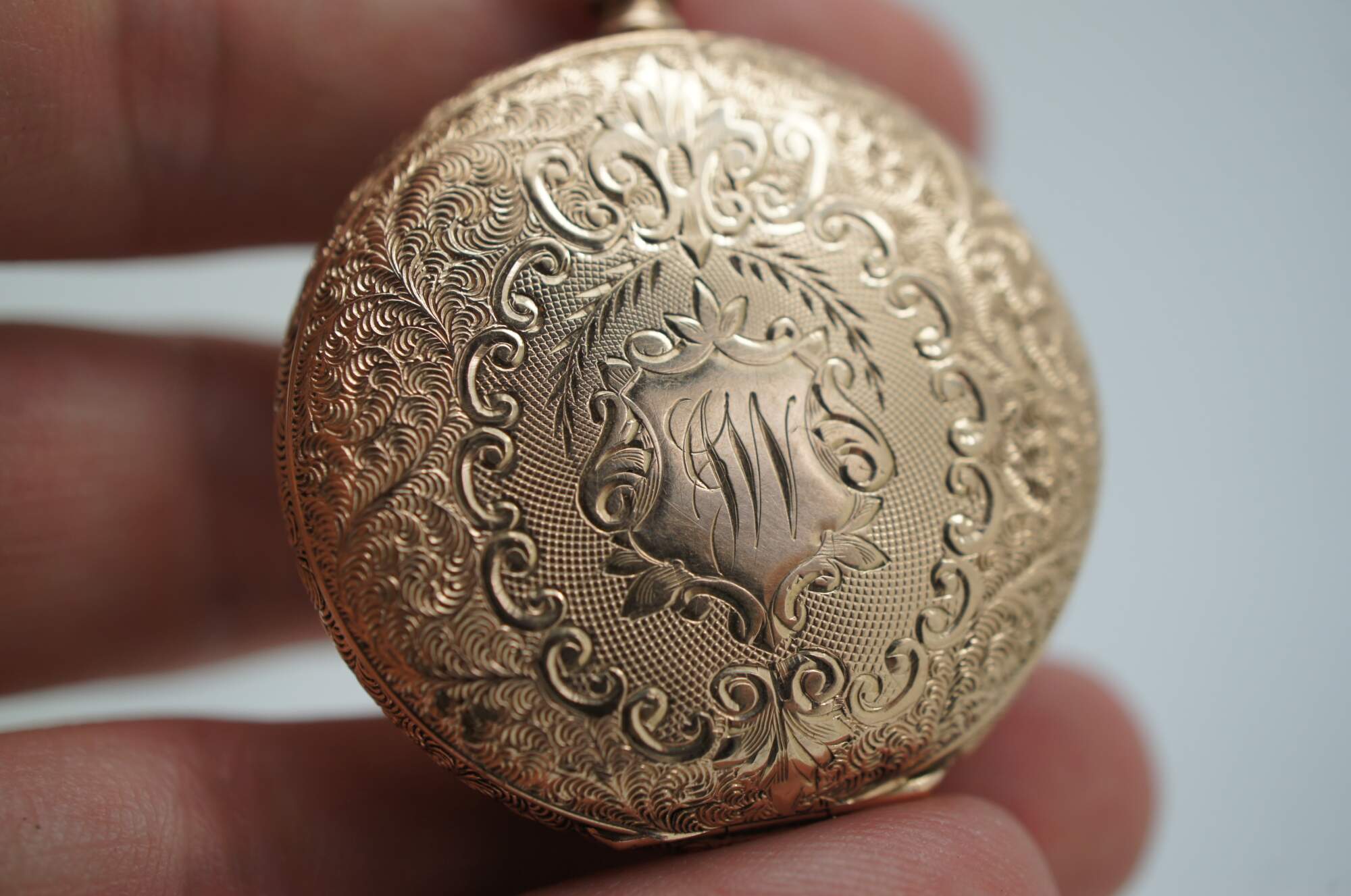 Early 20th century 8K gold pocket watch, intricately etched with swirling foliate motif around a bird and leaves on one side and foliate frame with monogram JW on the other. Case: Brooklyn Watch Case Company - Serial Number: 940416 - 8K Gold (A1 Eagle mark) - Interior of case engraved "Frank Hack / Josephine Woodrick. Movement: Continental Watch Company - Swiss - Number 9029 - White face marked C.W. Co, black and red lettering, Arabic numerals, one minute subdial, blue-black iridescent hands. Mechanical / wind up.