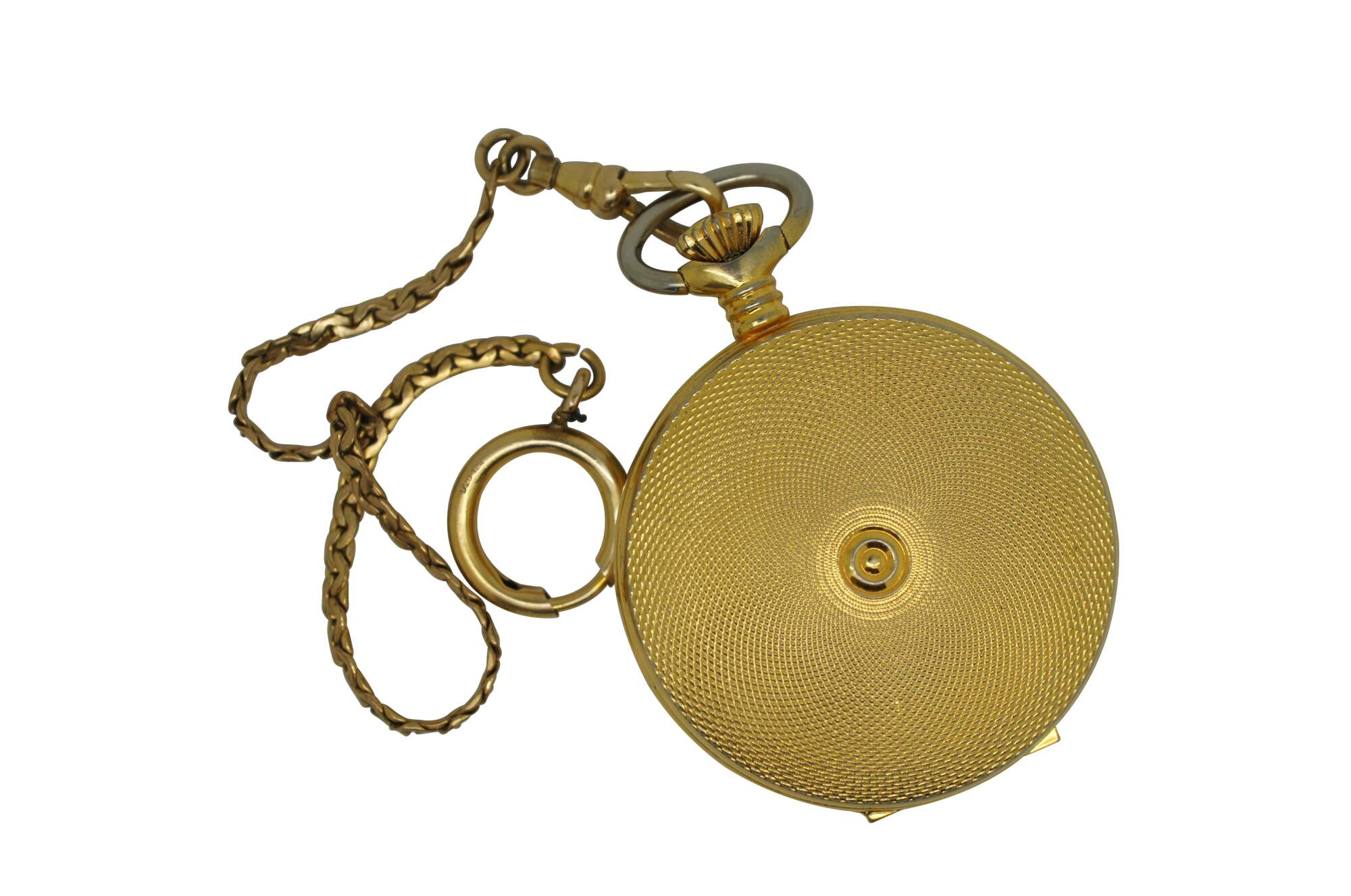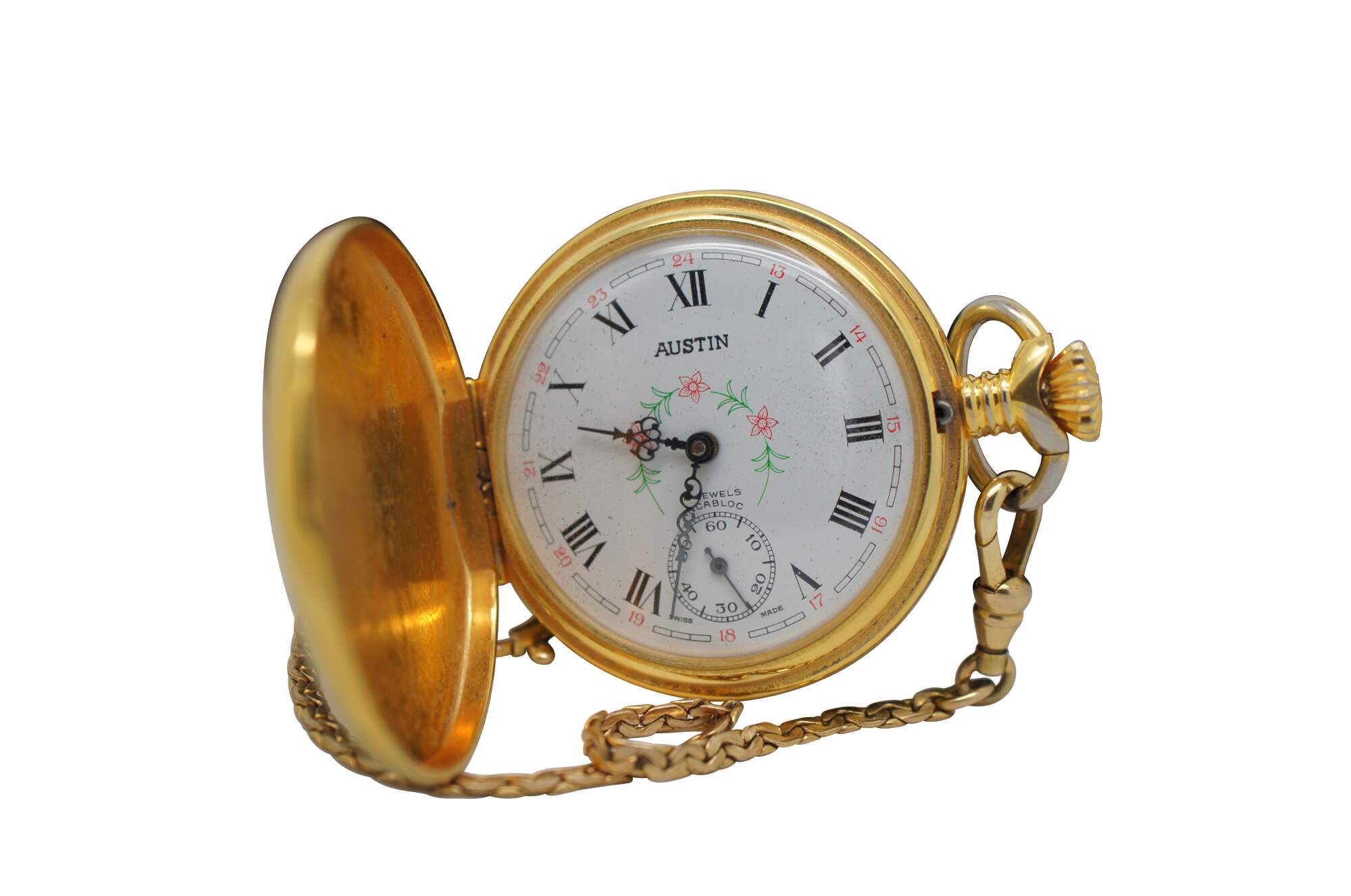Mid to late 20th century Austin Incabloc pocket watch. Case features a tight diamond texture and a blank flower framed shield for monogram. White face with red and green wreath of flowers, black and red lettering, Roman and Arabic numerals, one minute subdial, black scrolled hands. Movement: Villereuse - Swiss - 17 Jewels. Includes 1/20-12K Gold filled C-link watch chain. Mechanical / wind up.