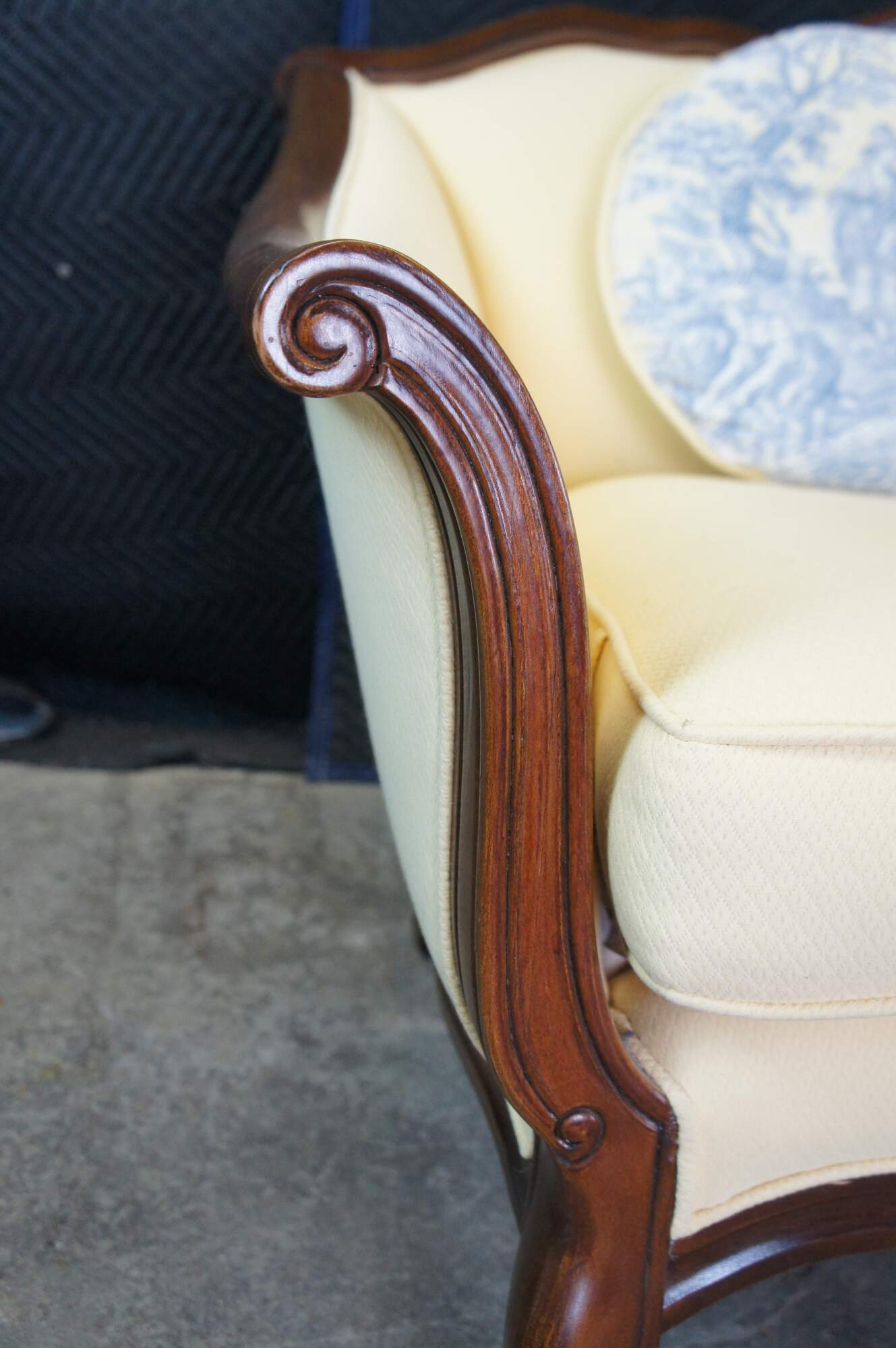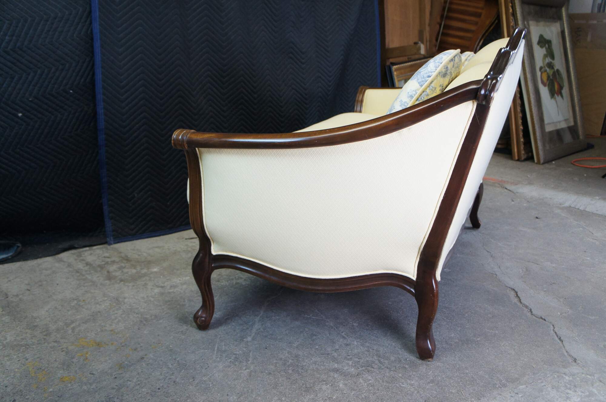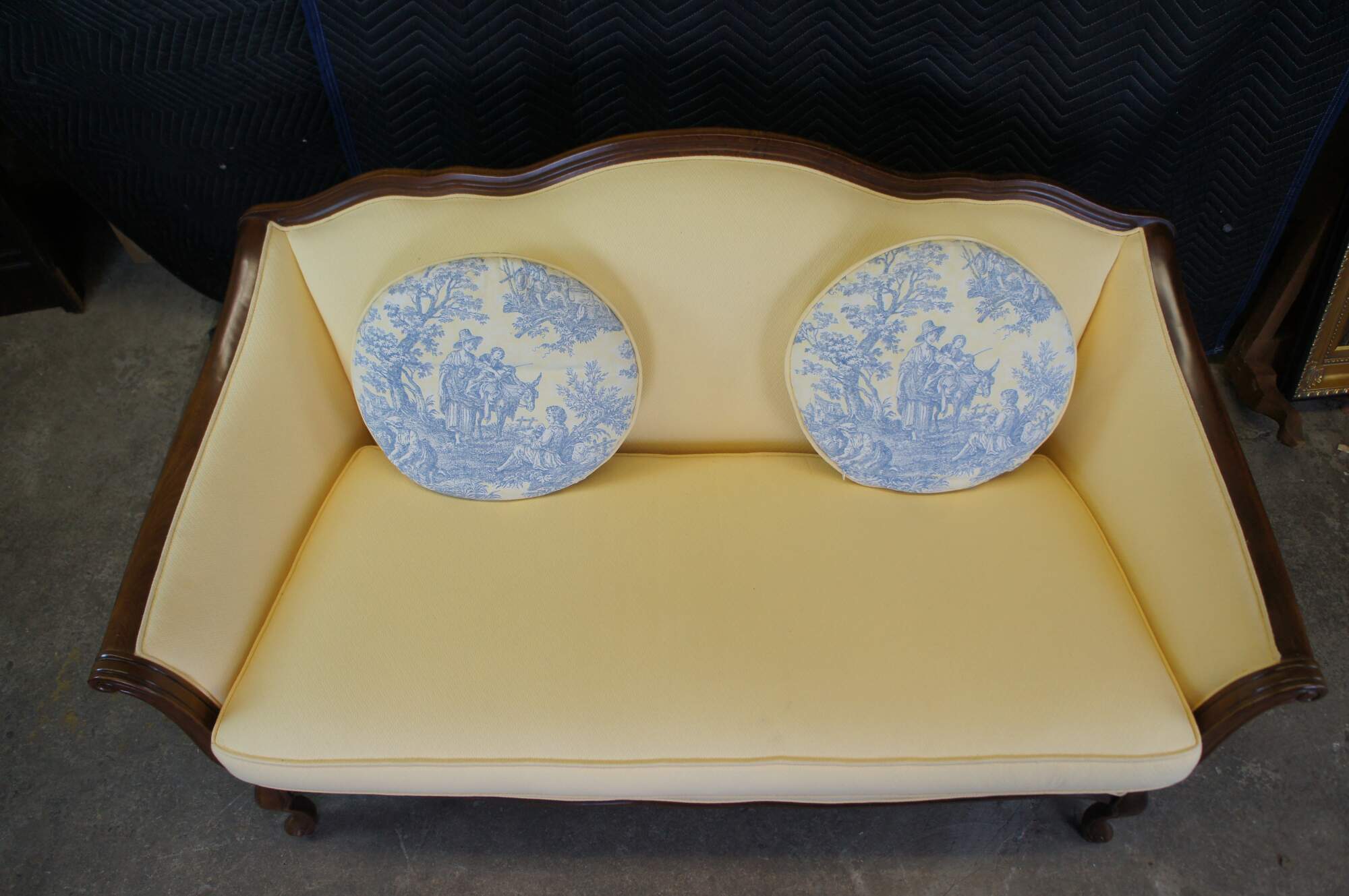 Vintage Queen Anne style bench / love seat / settee. Made of mahogany featuring a serpentine camel back design with flared arms and cabriole legs / feet. Includes two round Victorian scene tole print pillows.