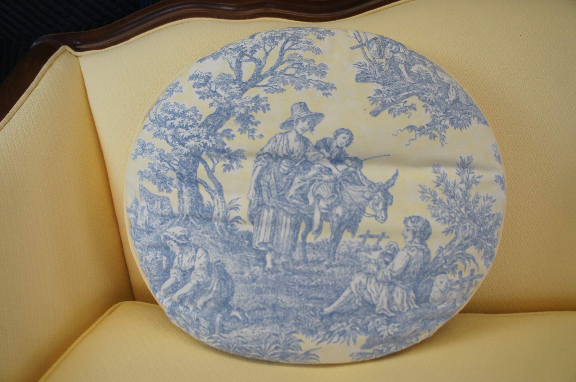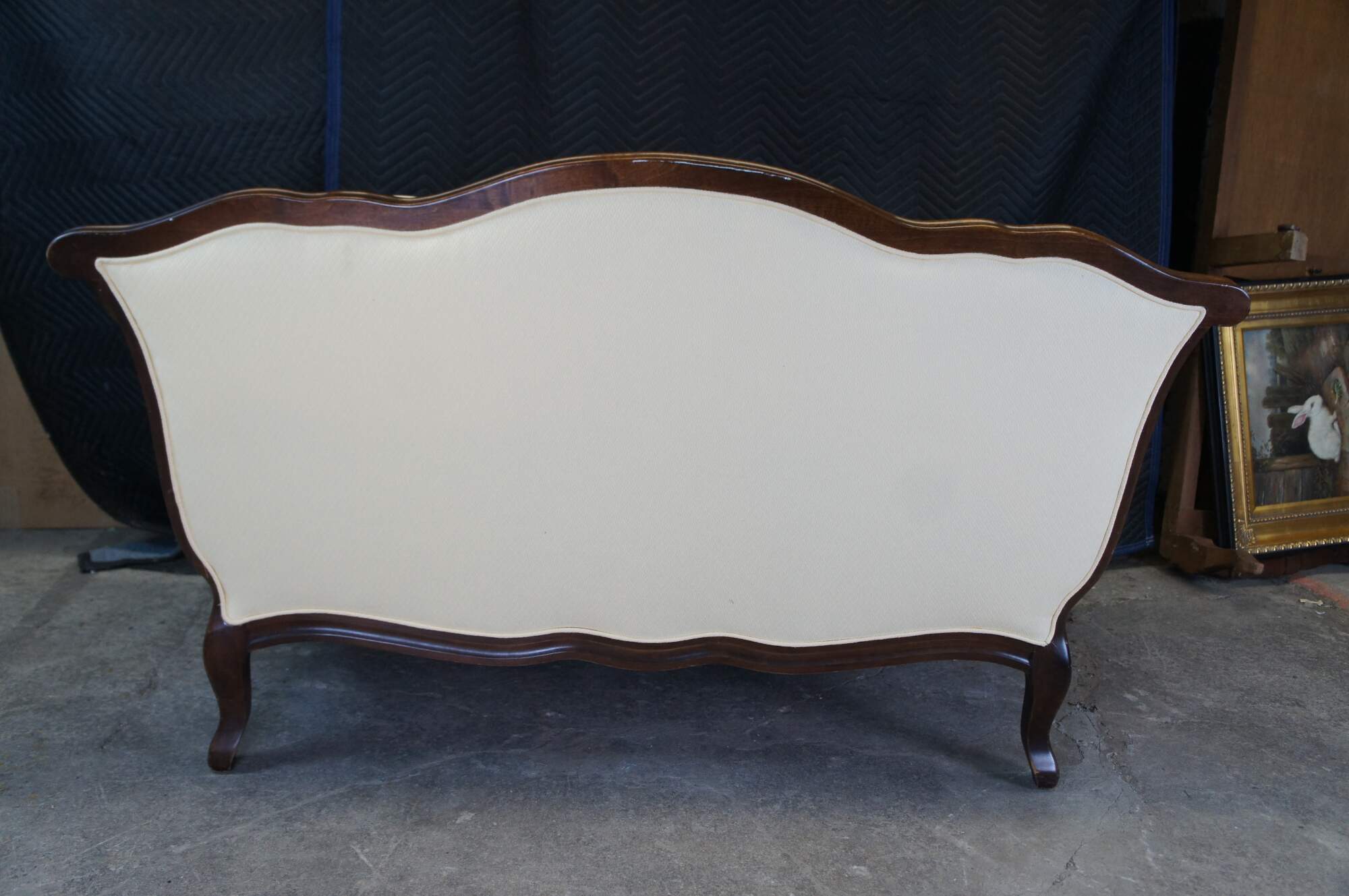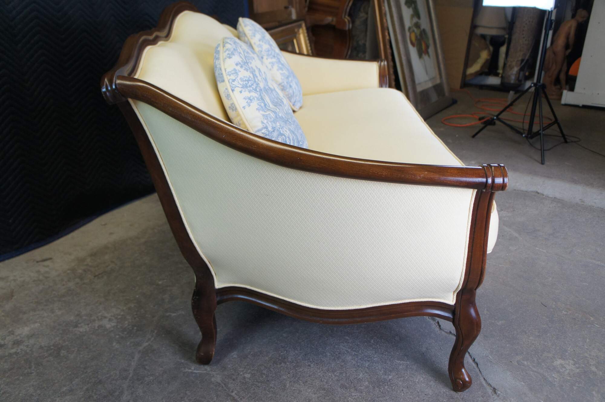 Vintage Queen Anne style bench / love seat / settee. Made of mahogany featuring a serpentine camel back design with flared arms and cabriole legs / feet. Includes two round Victorian scene tole print pillows.