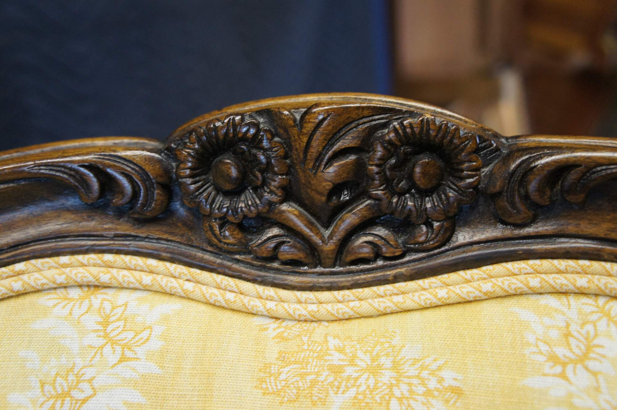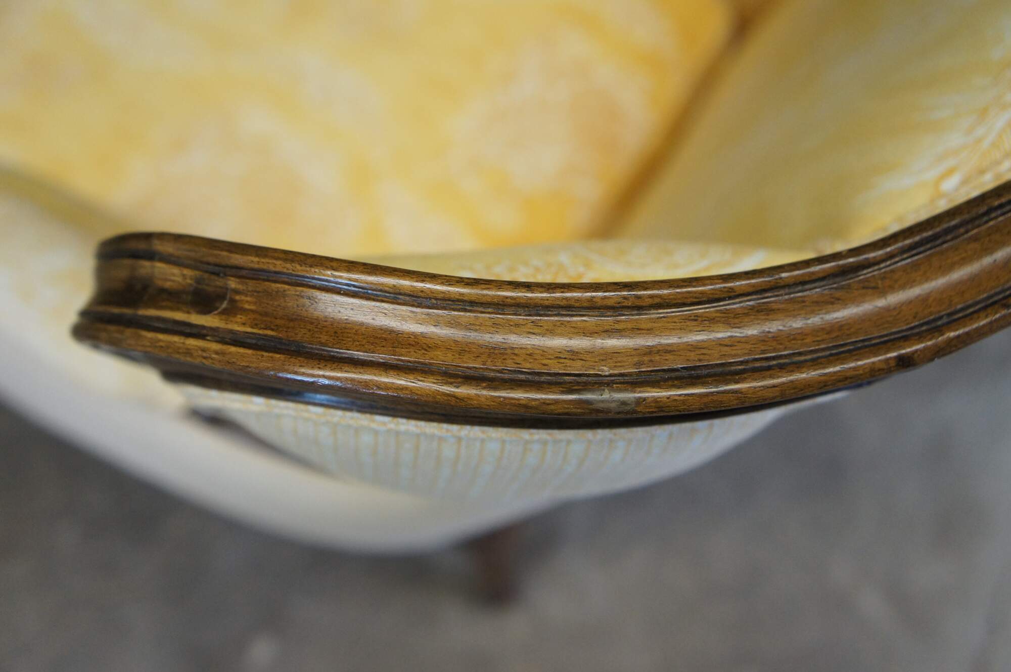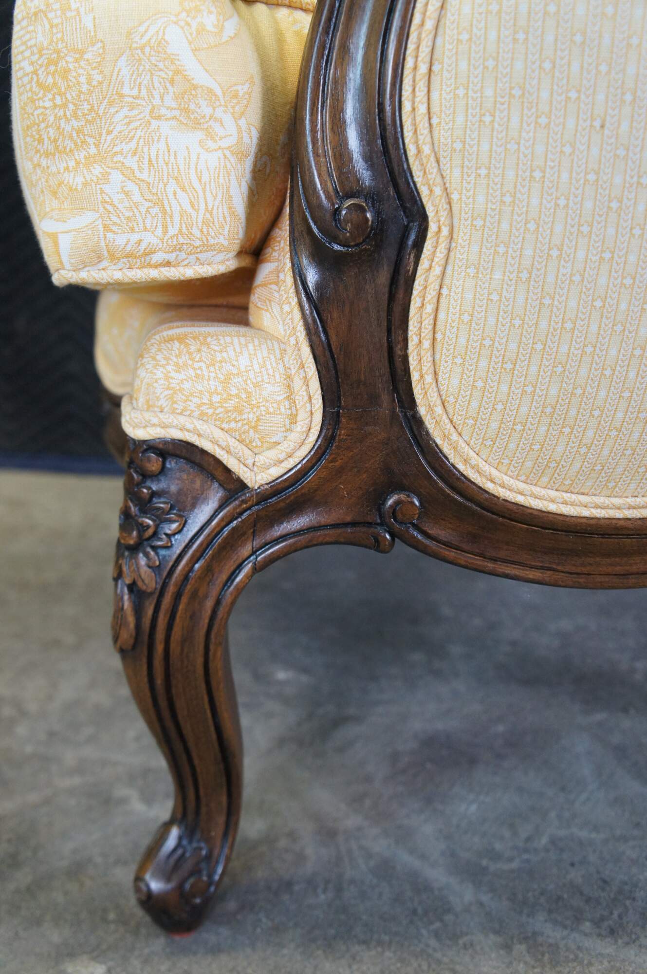 Two vintage French Louis XVI style club / lounge / library arm chairs. Made of walnut featuring wingback design with high arms, carved with floral / foliate accents, Queen Anne legs, cabriole feet and tole upholstery with woman spanking a cherub / putti / angel. Includes two blue Victorian scene pillows.