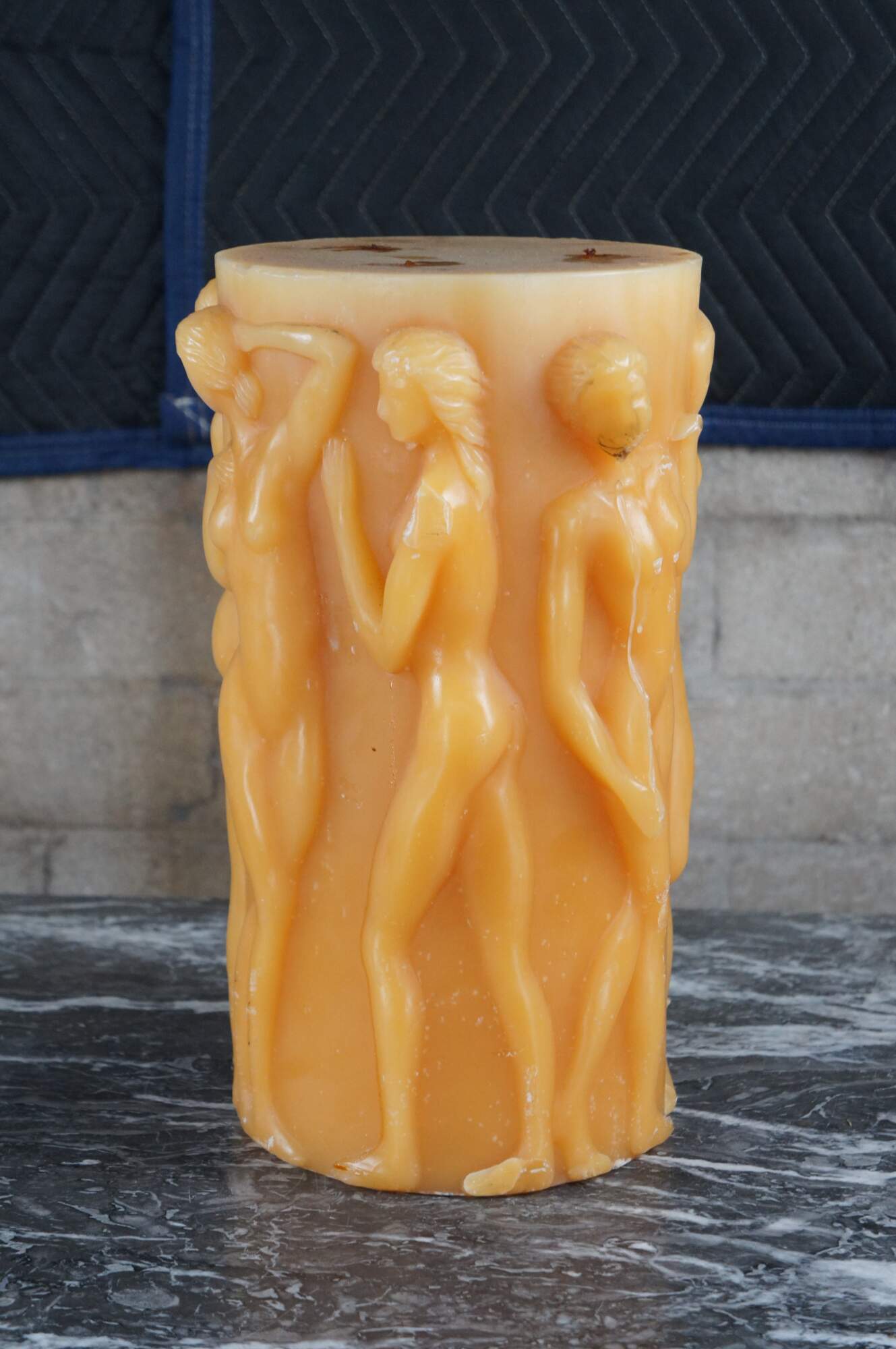 Intira Candle Factory figural nude cylindrical candle. Styled after Lalique "Bacchantes