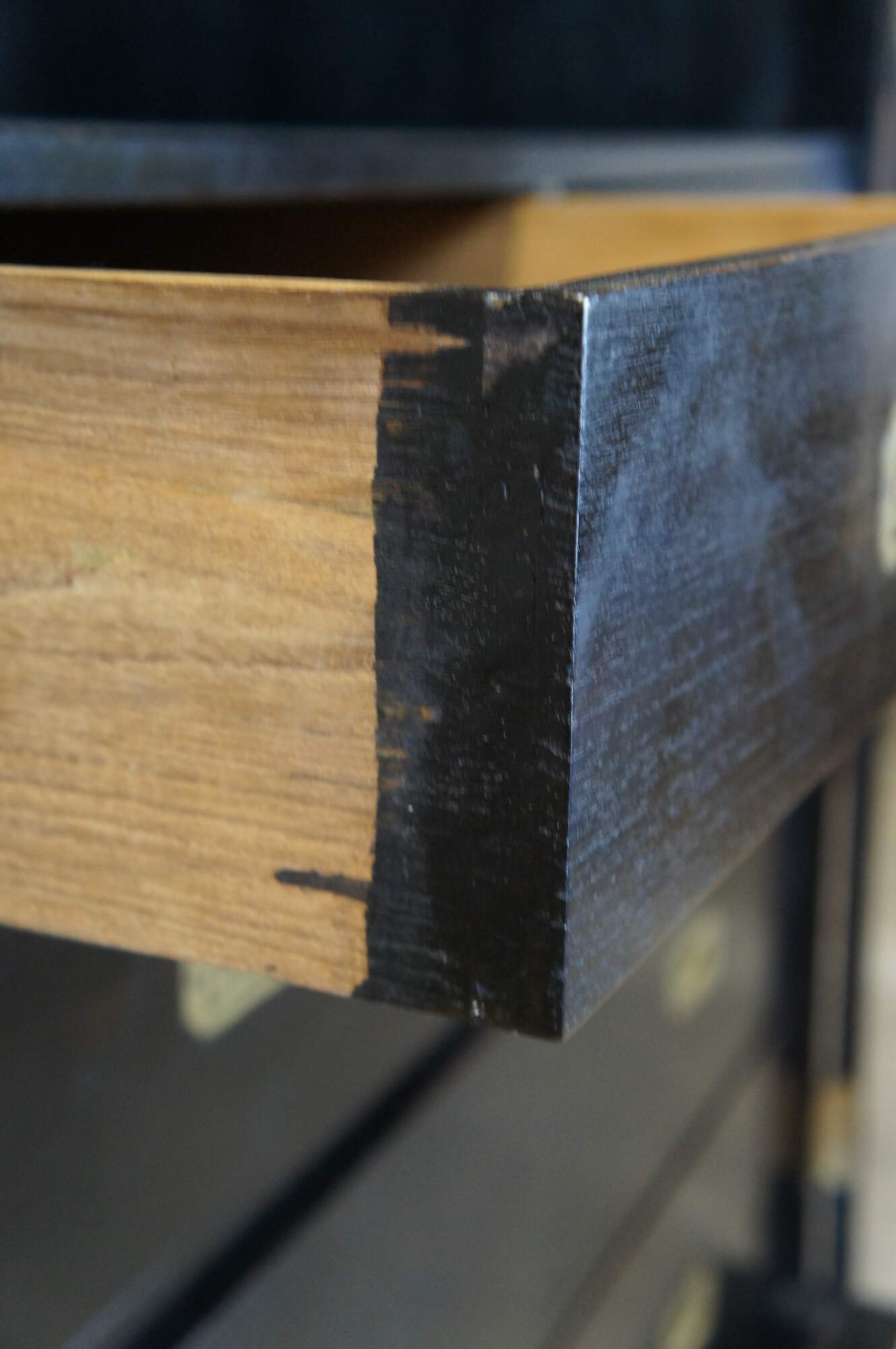 Vintage Robert Lighton British Khaki X armoire / wardrobe / TV console / cabinet. Made of teak featuring dark ebonized finish with double jointed doors that open to campaign style eight drawer dresser or chest with brass hardware.