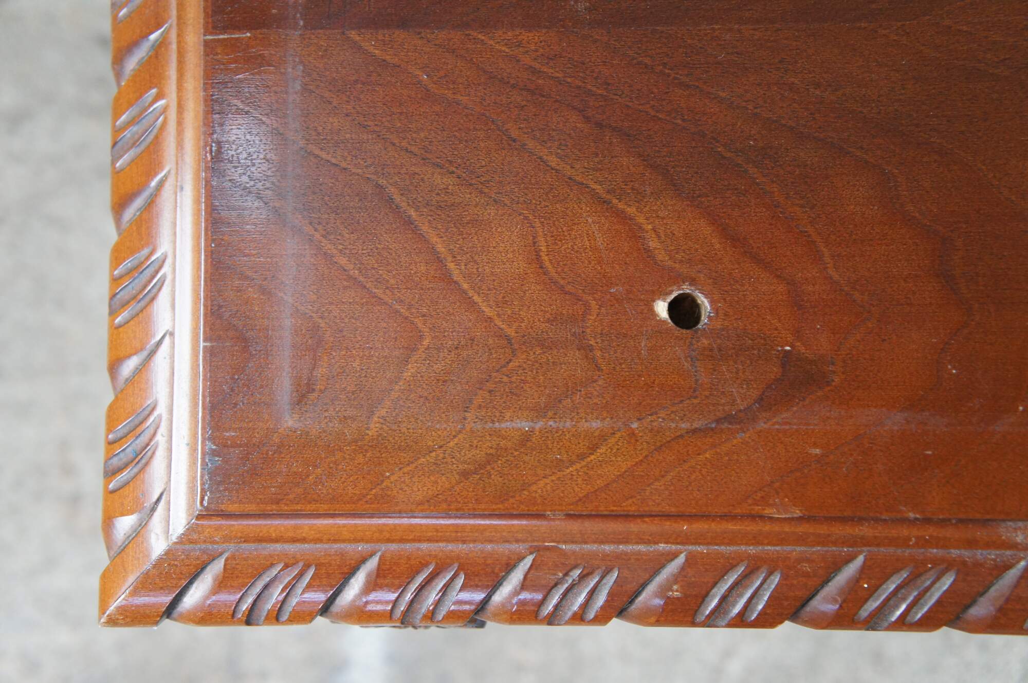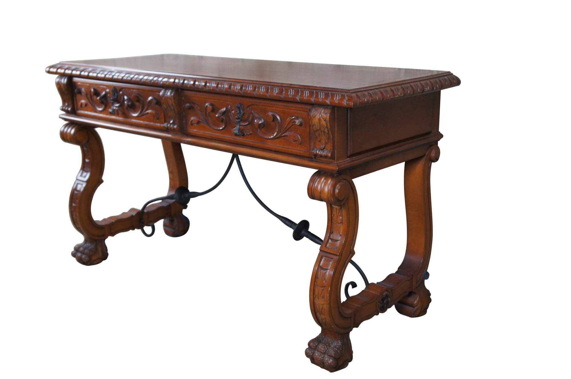Vintage Jesus Ballester Marco of Valencia, Spain sideboard, library console or writing desk. Made of mahogany featuring rectangular form with scrolled iron and acanthus accents over harp shaped legs and hairy lion paw / claw feet.