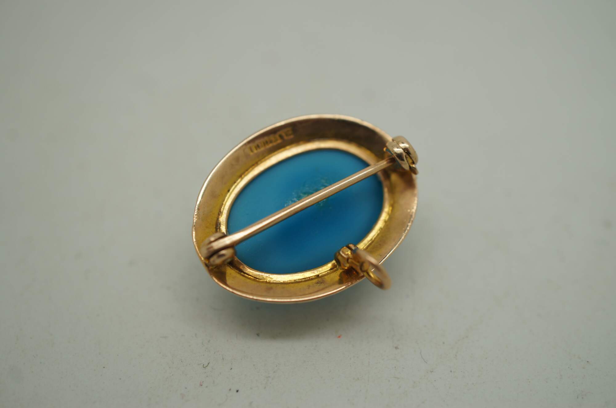 Antique early 20th century pin / brooch by George L Paine and Company, featuring an oval Sleeping Beauty turquoise cabochon framed in 10K yellow gold with etched scalloped texture and ribbon details. Swiveling ring on back allows piece to be hung as a pendant.