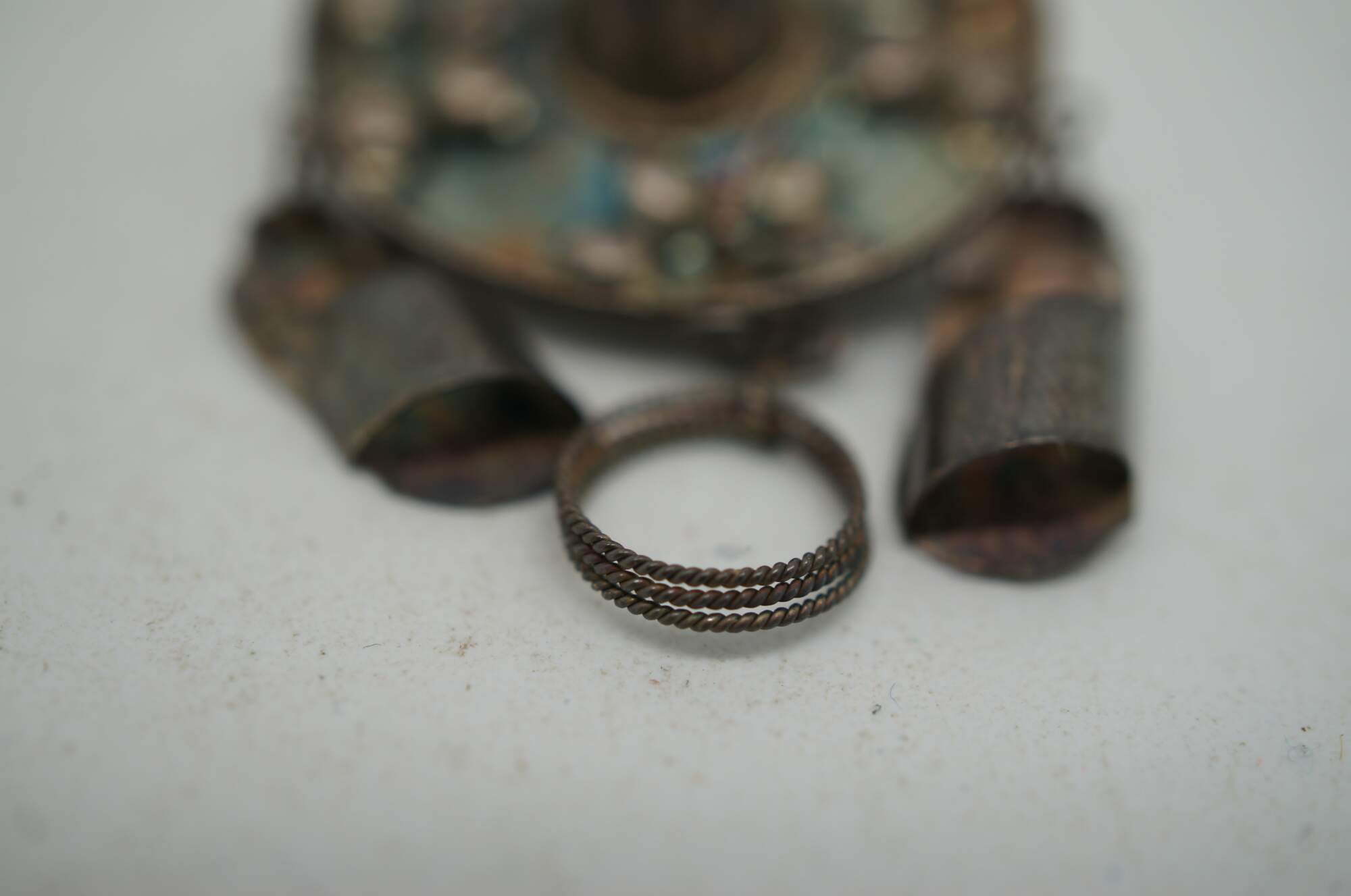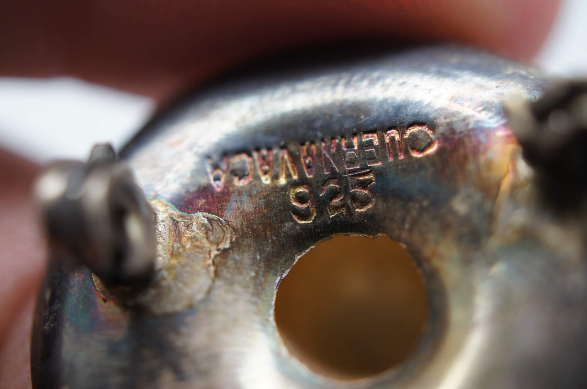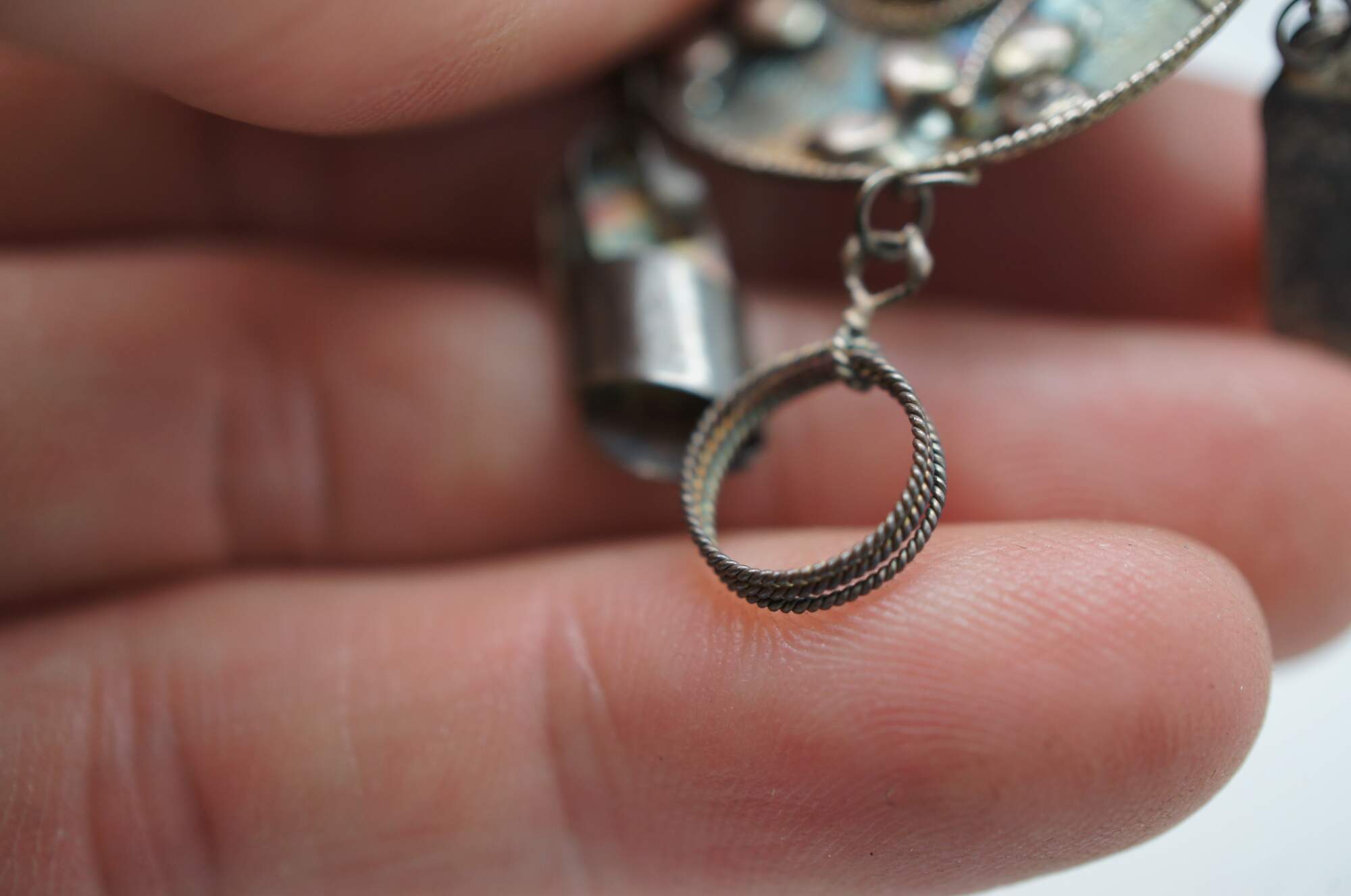Mid to late 20th century 925 sterling silver pin / brooch in the shape of a sombrero decorated with cord and baubles, with charms in the shape of a pair of sandals and a coil of rope dangling from it. Made in Cuernavaca, Mexico.