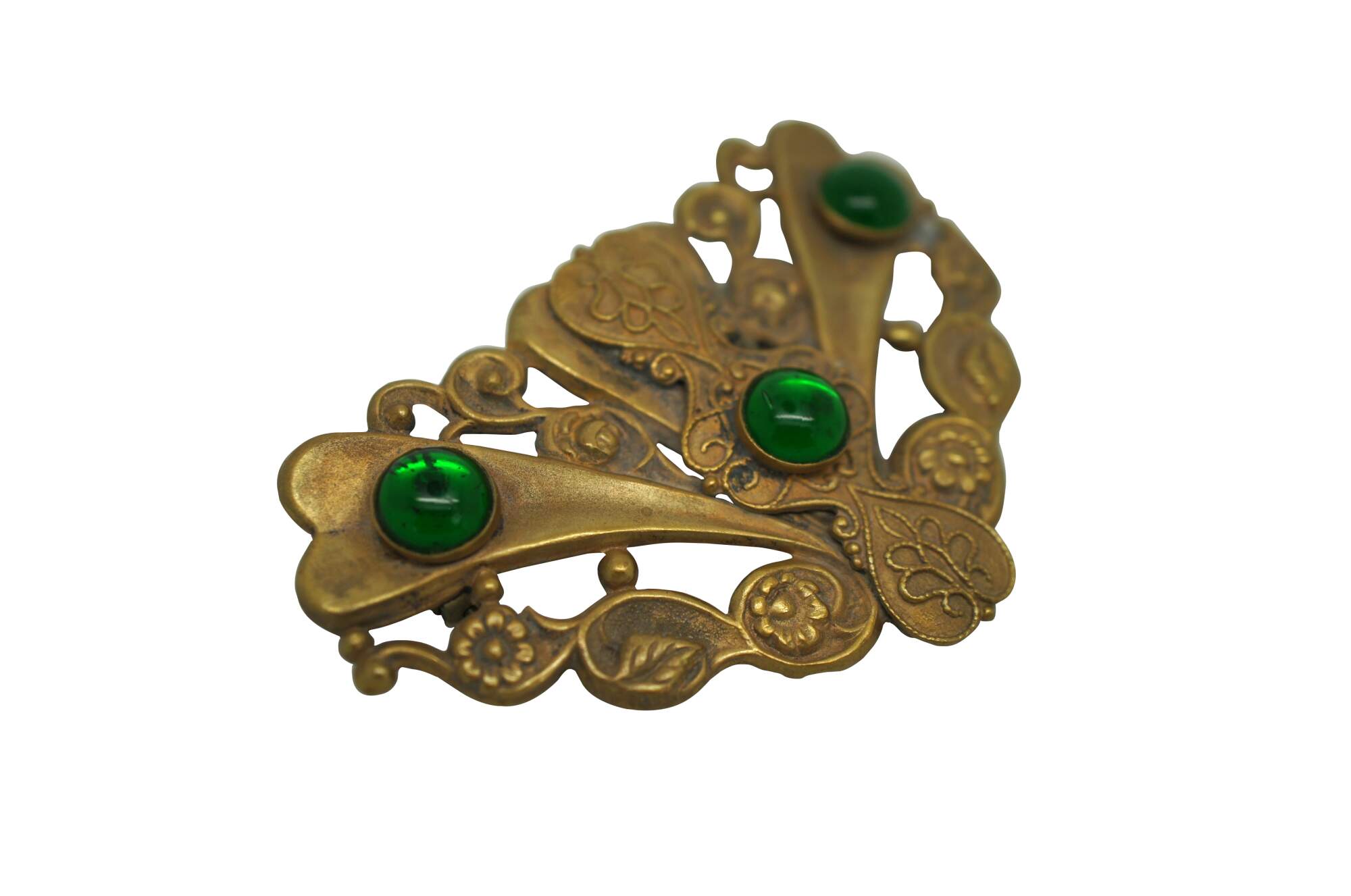 Late 19th century Art Nouveau brass sash pin / brooch featuring a trangular shield-like shape decorated with flowers and foliate motifs, accented with a trio of round green glass stones.