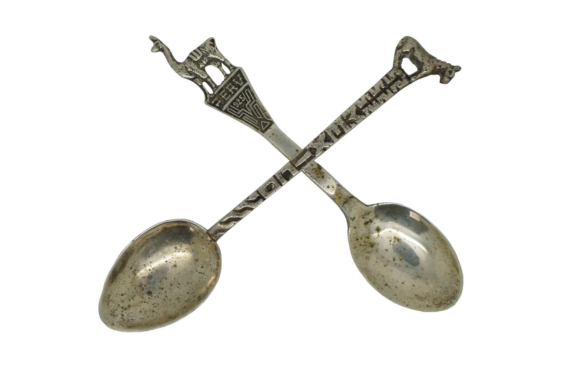 Lot of six mid to late 20th century 925 sterling silver souveir items. Mexico coffee spoon with aburro at the top. Peru coffee spoon with a llama at the top. Ring with design of folk art birds. And three llama / camel pins / brooches of various sizes.