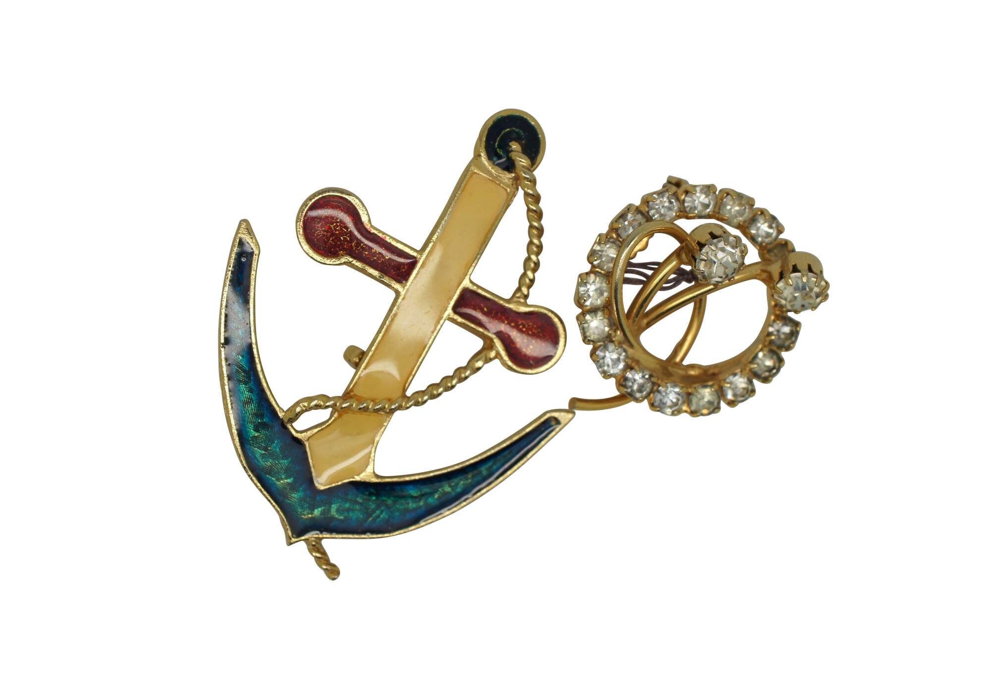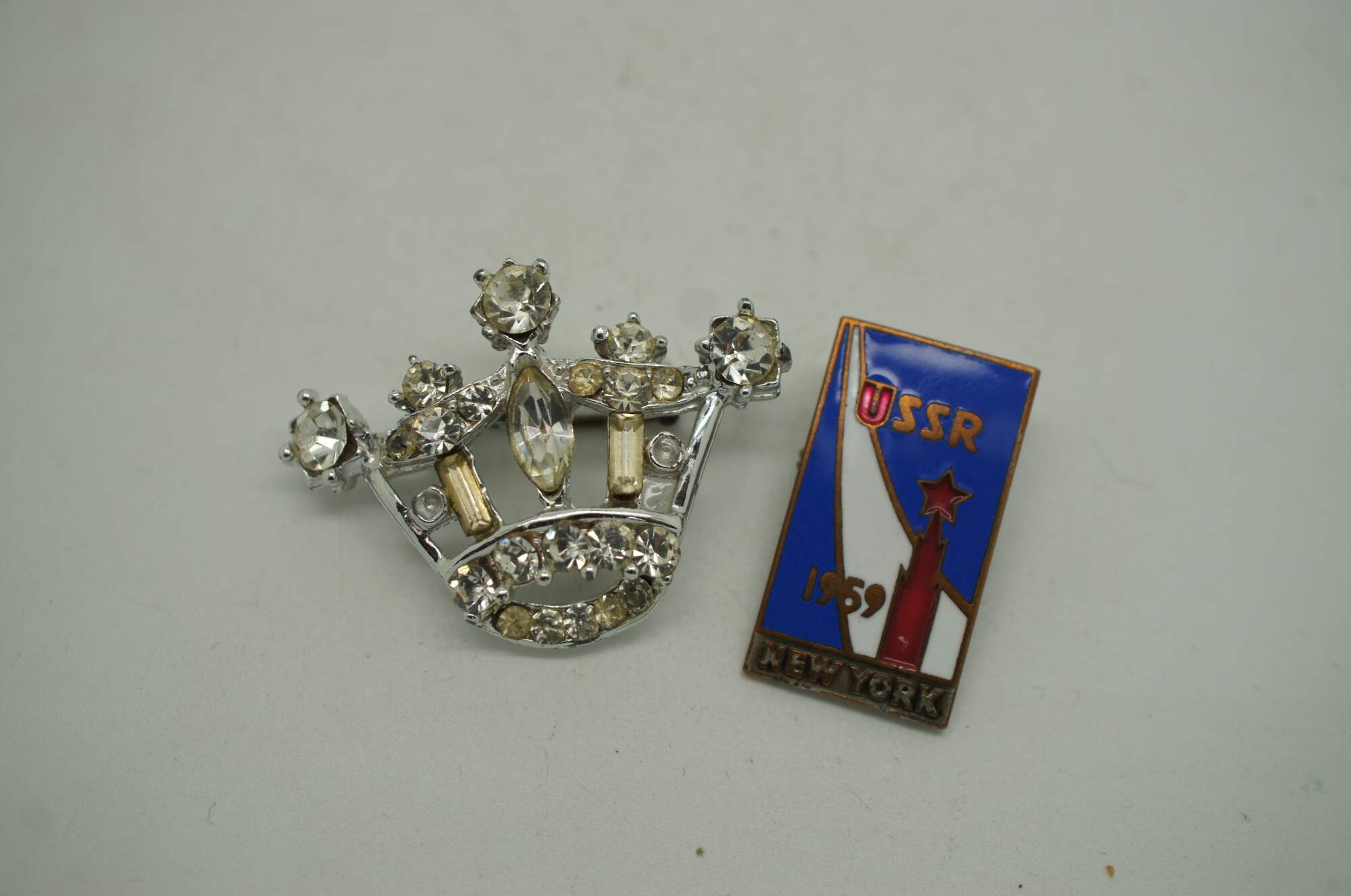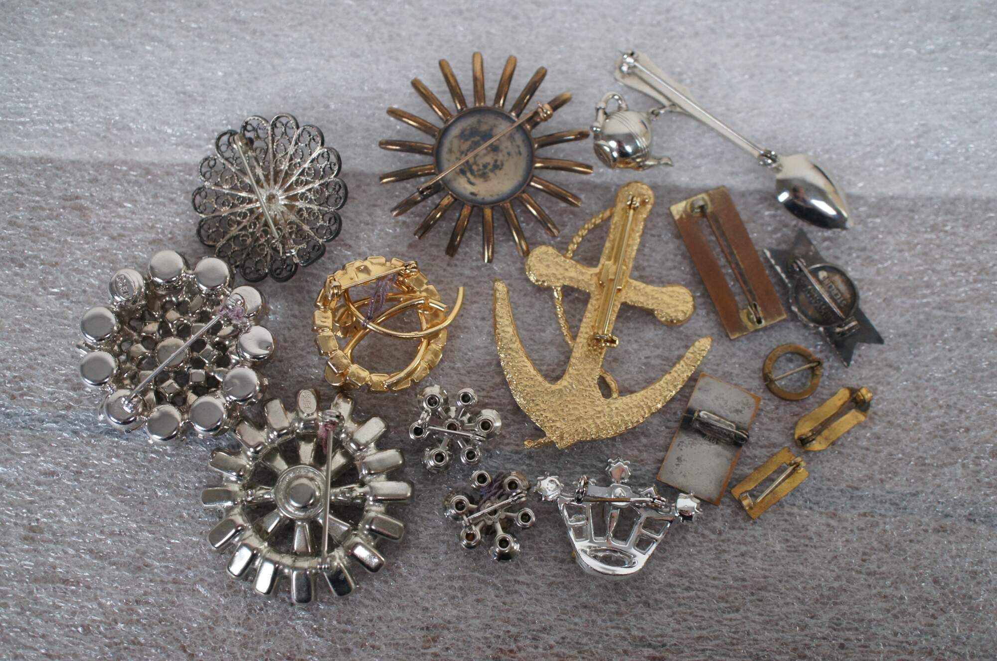 Lot of 16 mid to late 20th century pins / brooches in a variety of styles. Rhinestones, mother of pearl, enamel. One Army-Navy Production Award. Souvenir pin from USSR / Soviet 1959 exhibition in New York City. Marked brands include Weiss, AMA.