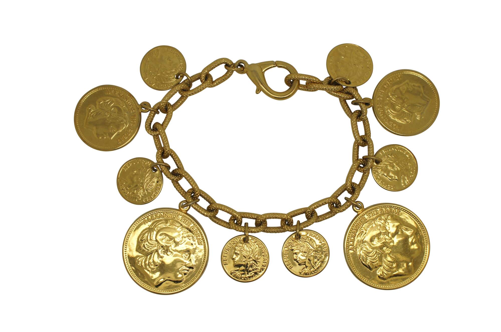 Lot of 7 mid to late 20th century bracelets. silver tone, gold tone, rhinestone, enamel, coins, love. Marks includes Weiss, Trifari, Kramer.