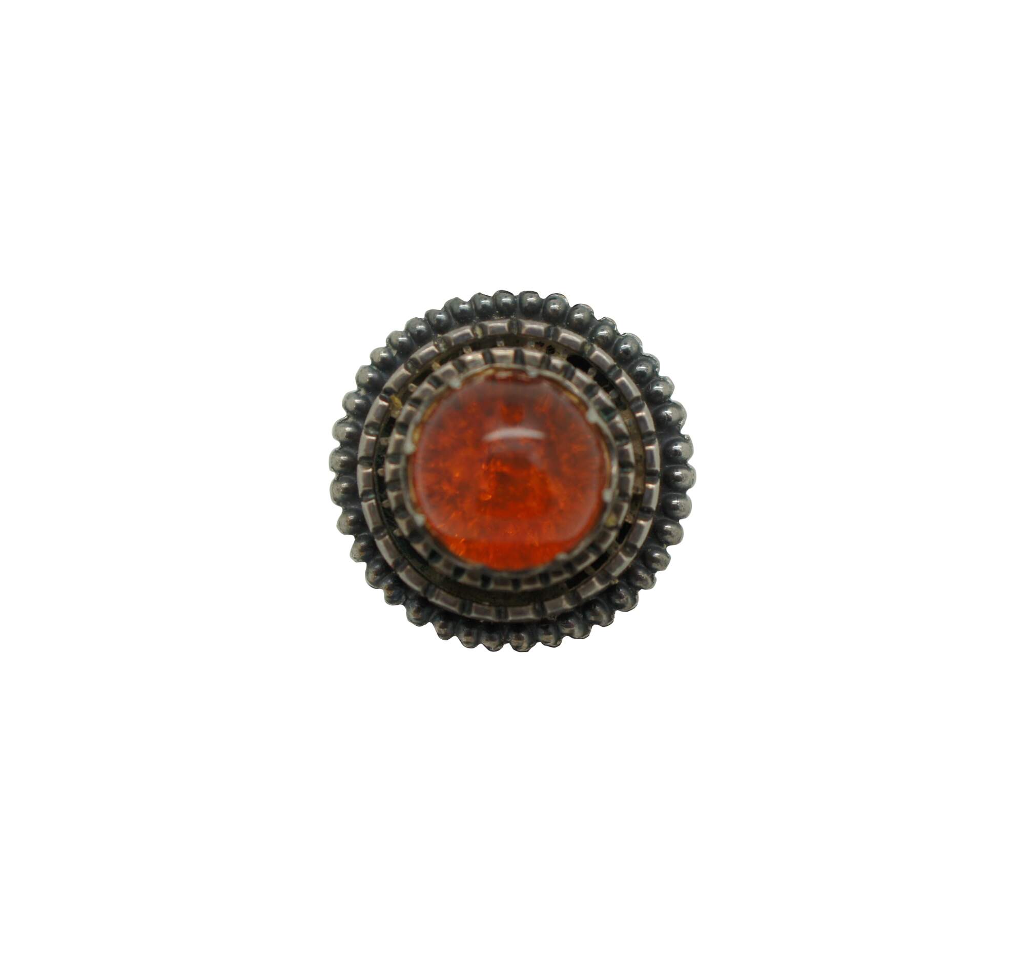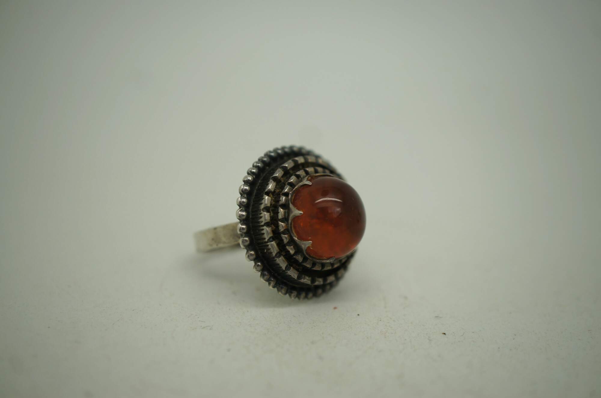 Set of 4 mid to late 20th century rings. Silver tone metal; un-marked. Two with amber cabochon stones. One filigree flower. One pair of hearts with turquoise chip.