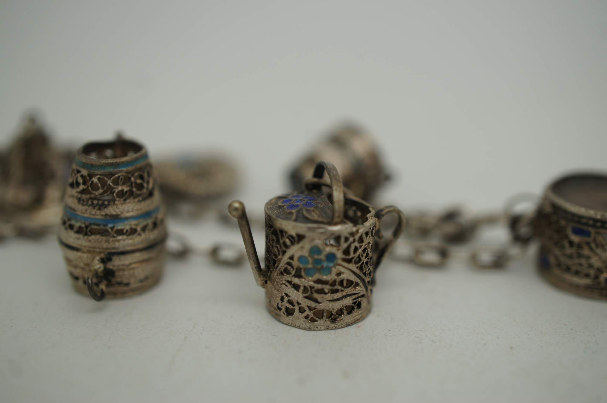 Small lot four early to mid 20th century silver tone metal charm bracelets - one assorted charms, one British coins, two Portugese filigree and enamel charms.