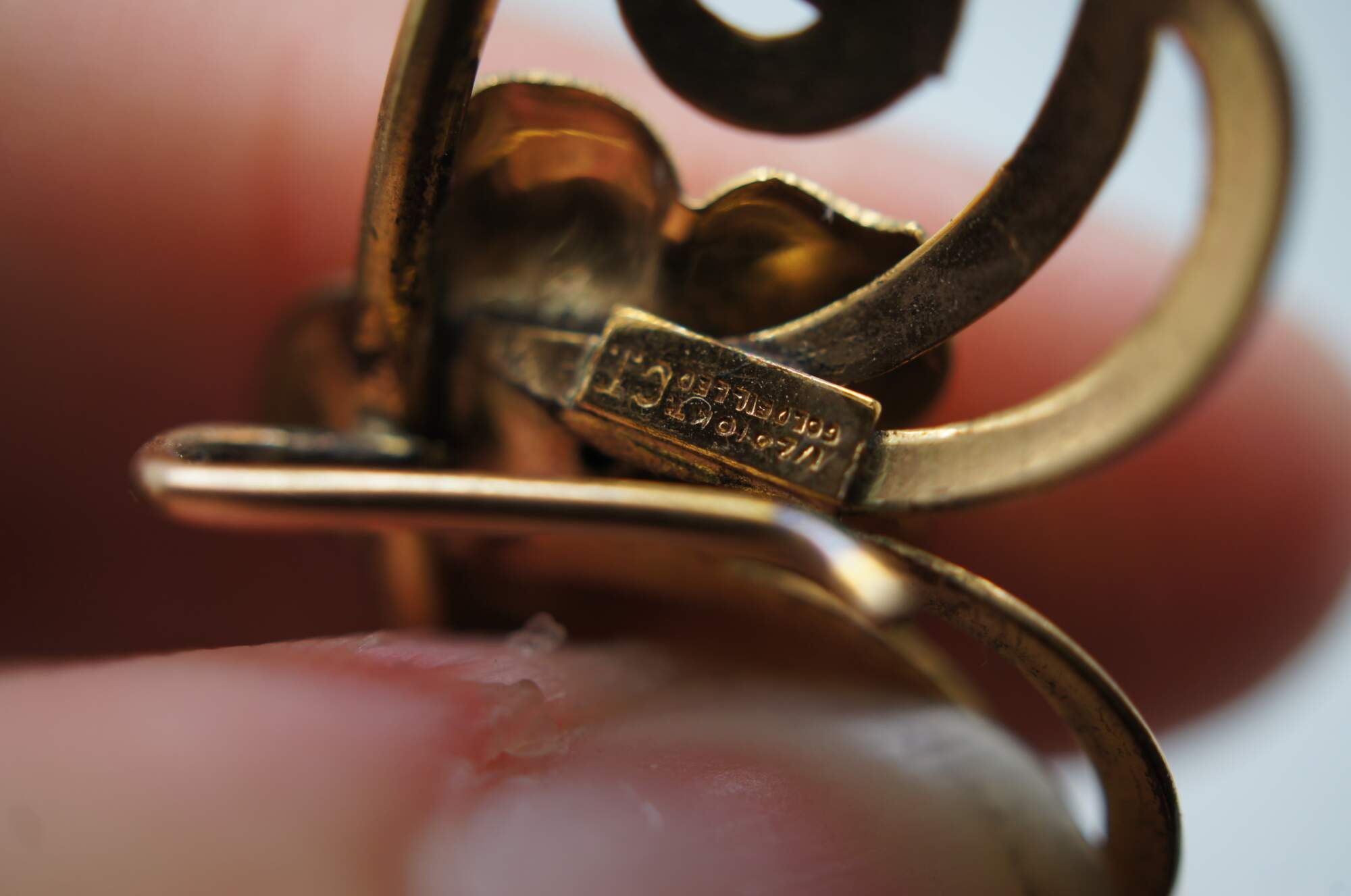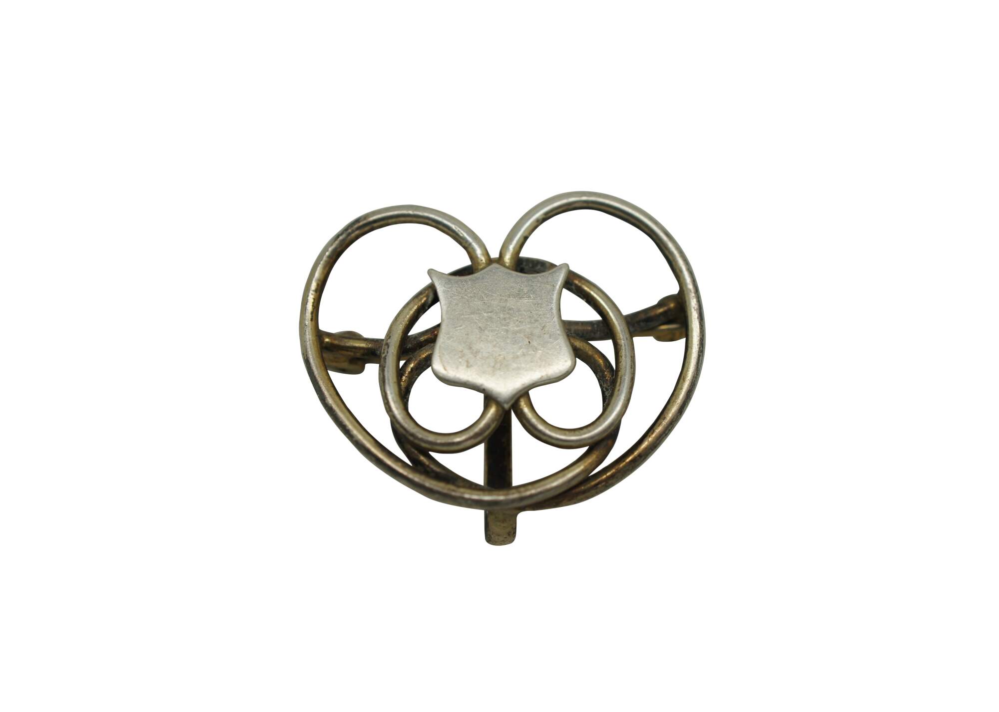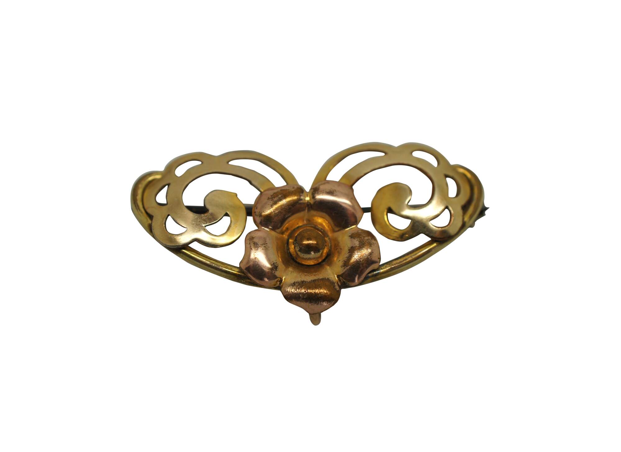 Set of three early to mid 20th century pins / brooches. Flower framed with paisley type leaves marked Dorson 1/20 10KT gold filled - C.T. Pretzel shaped sterling silver with shield - no monogram. Geometric gold tone with monogram R.