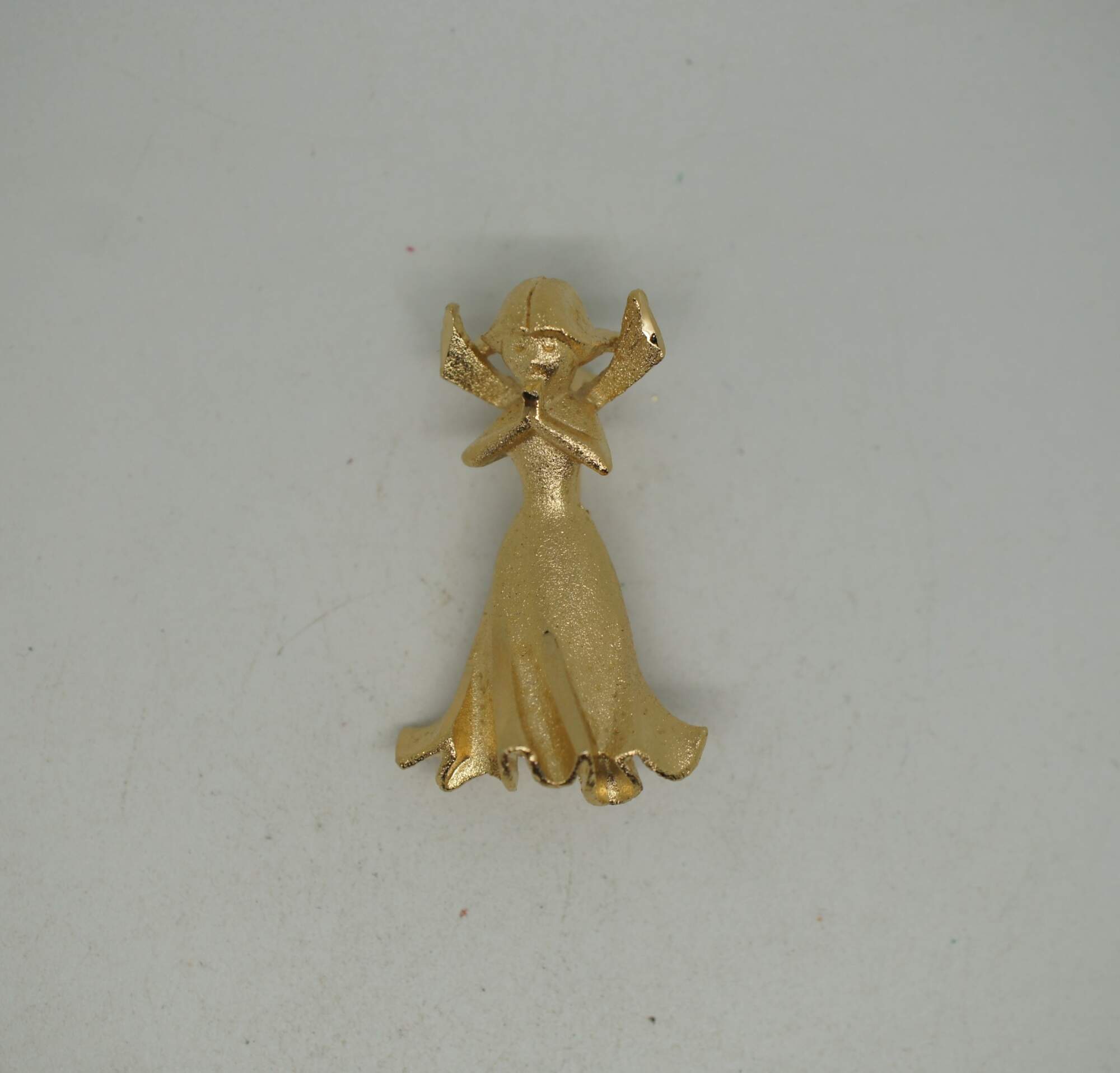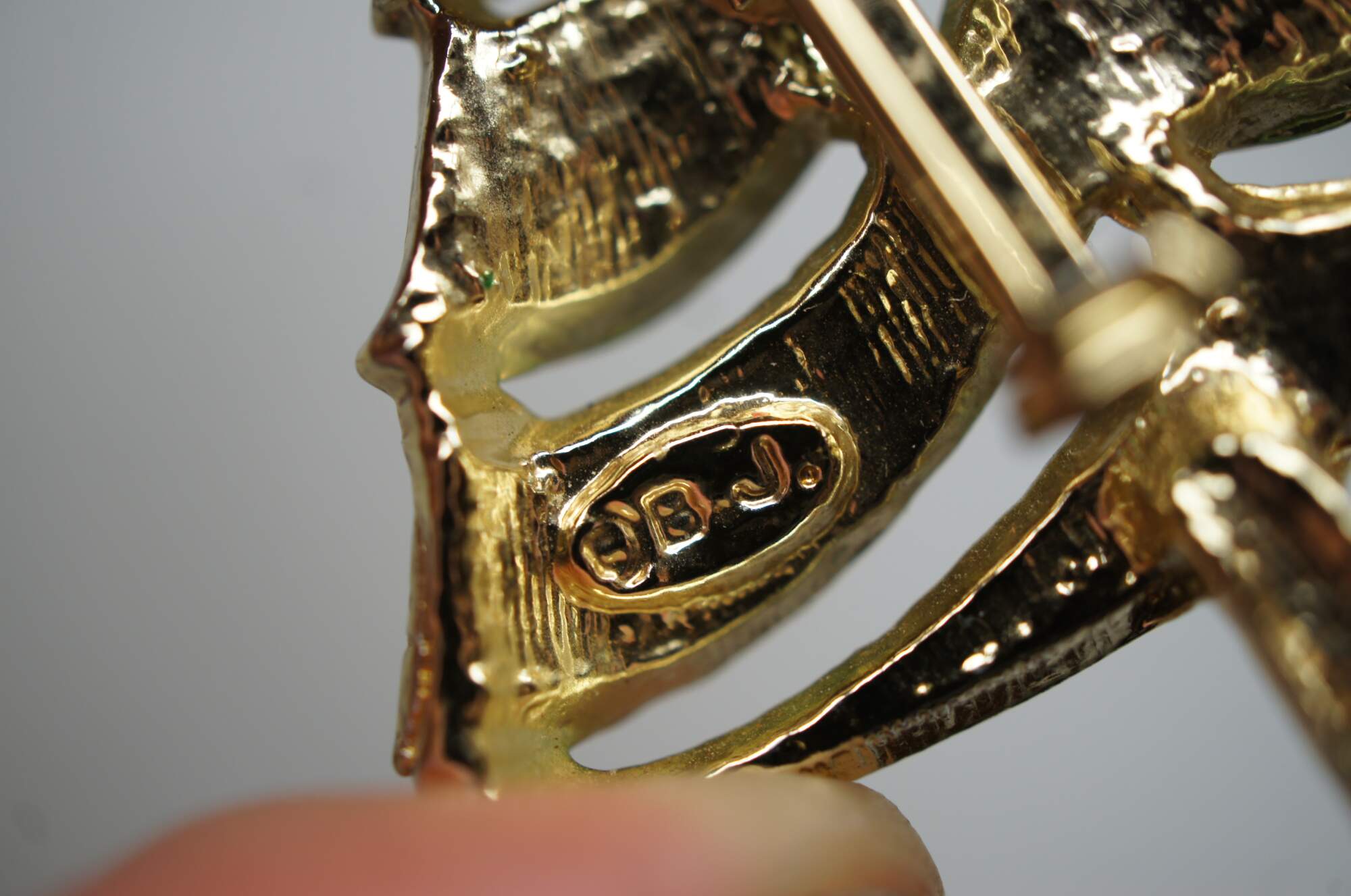 Lot of 8 late 20th century Christmas / holiday pins / brooches. Gold tone metal with enamel and rhinestones. Three Christmas trees, reindeer with holly, wreath with bell, wreath with candles, angel. Marks: Eisenberg, BJ.