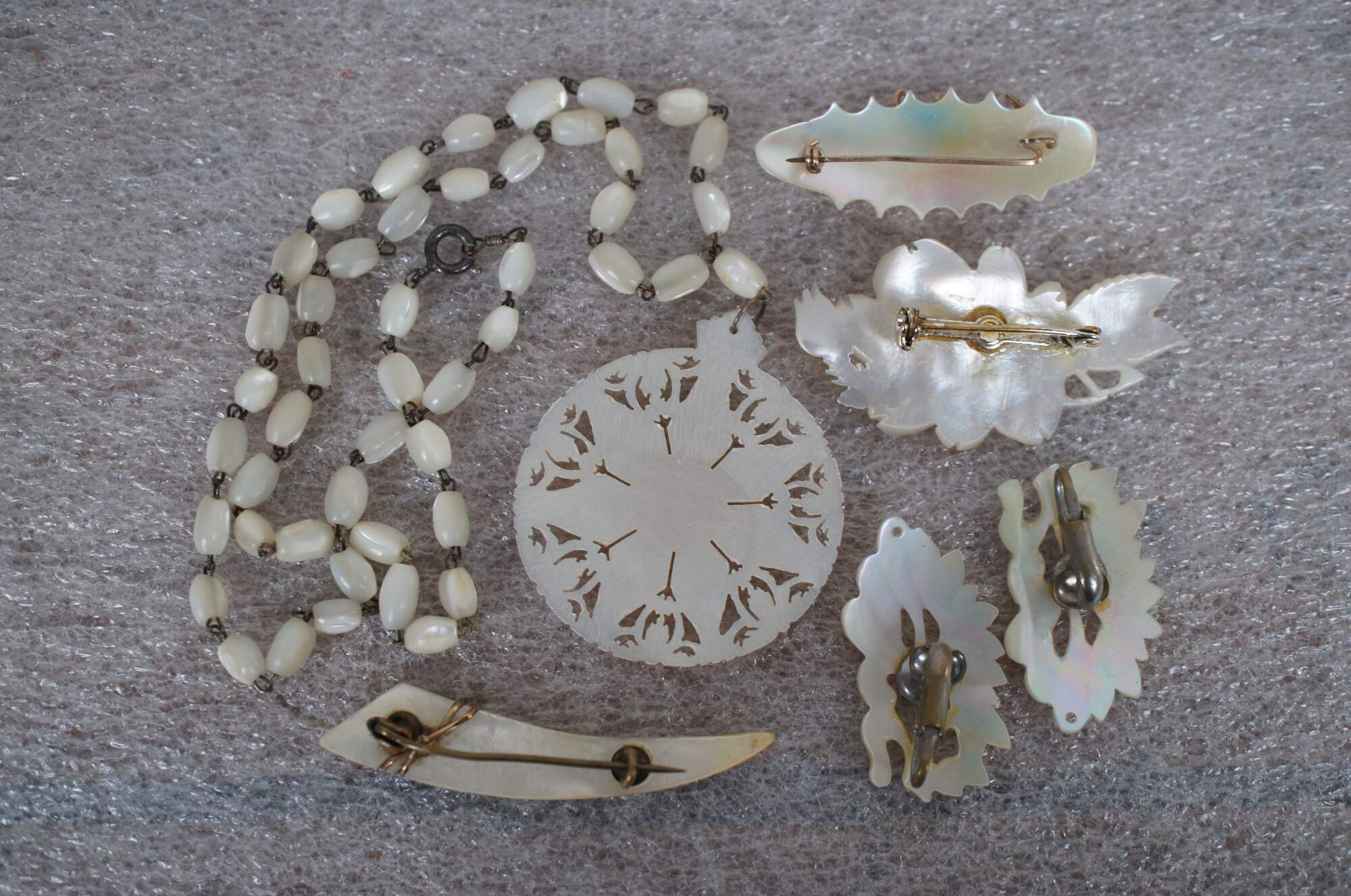 Set of six piece of mid to late 20th century mother of pearl jewelry. Star pendant necklace with beaded chain, matching floral leaf pin pair, rose pin, carved horn shaped pin, leaf pin reading Mother in brass wire.