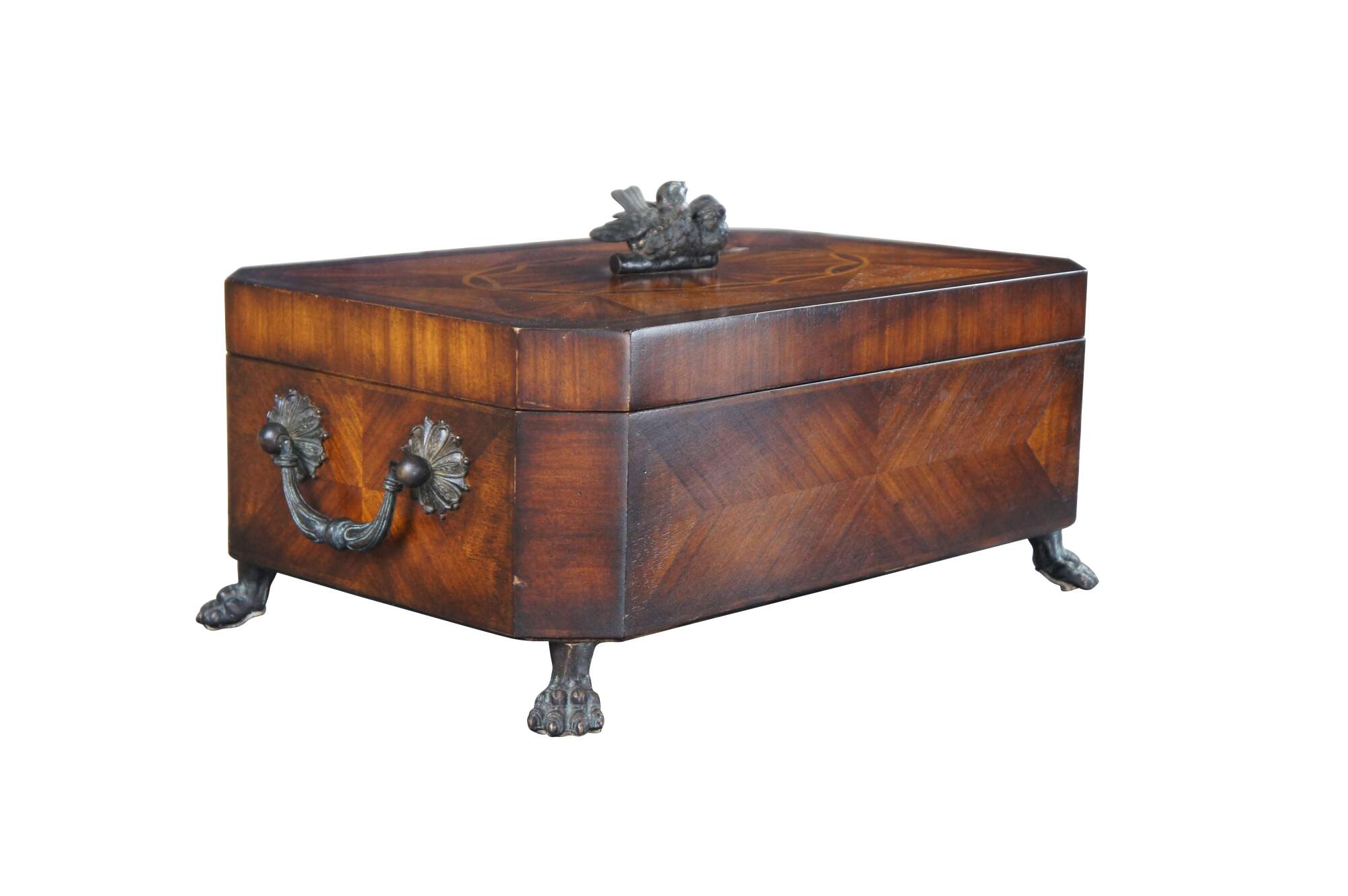 Theodore Alexander keepsake, trinket box or casket. Features a matchbook veneer mahogany frame with parquetry top and dove finial. Includes two handles along the sides and claw feet. The marquetry inlay top is inspired by the meticulous inlays from the Federal and Sheraton era. A nice display piece that will look great on any desk, table or bookcase.