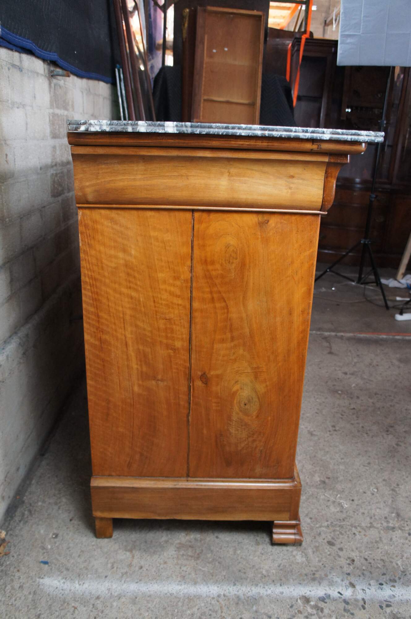 A Louis Philippe Walnut Commode, c. 1840. Features a rectangular form made from walnut with matchbook veneer burled drawer fronts and Saint Anne Des Pyrenees Marble top. Features an ogee-molded frieze drawer over three drawers with ornate gilt foliate pulls and matching escutcheon plates. The chest of drawers is supported by a plinth base on shaped block feet