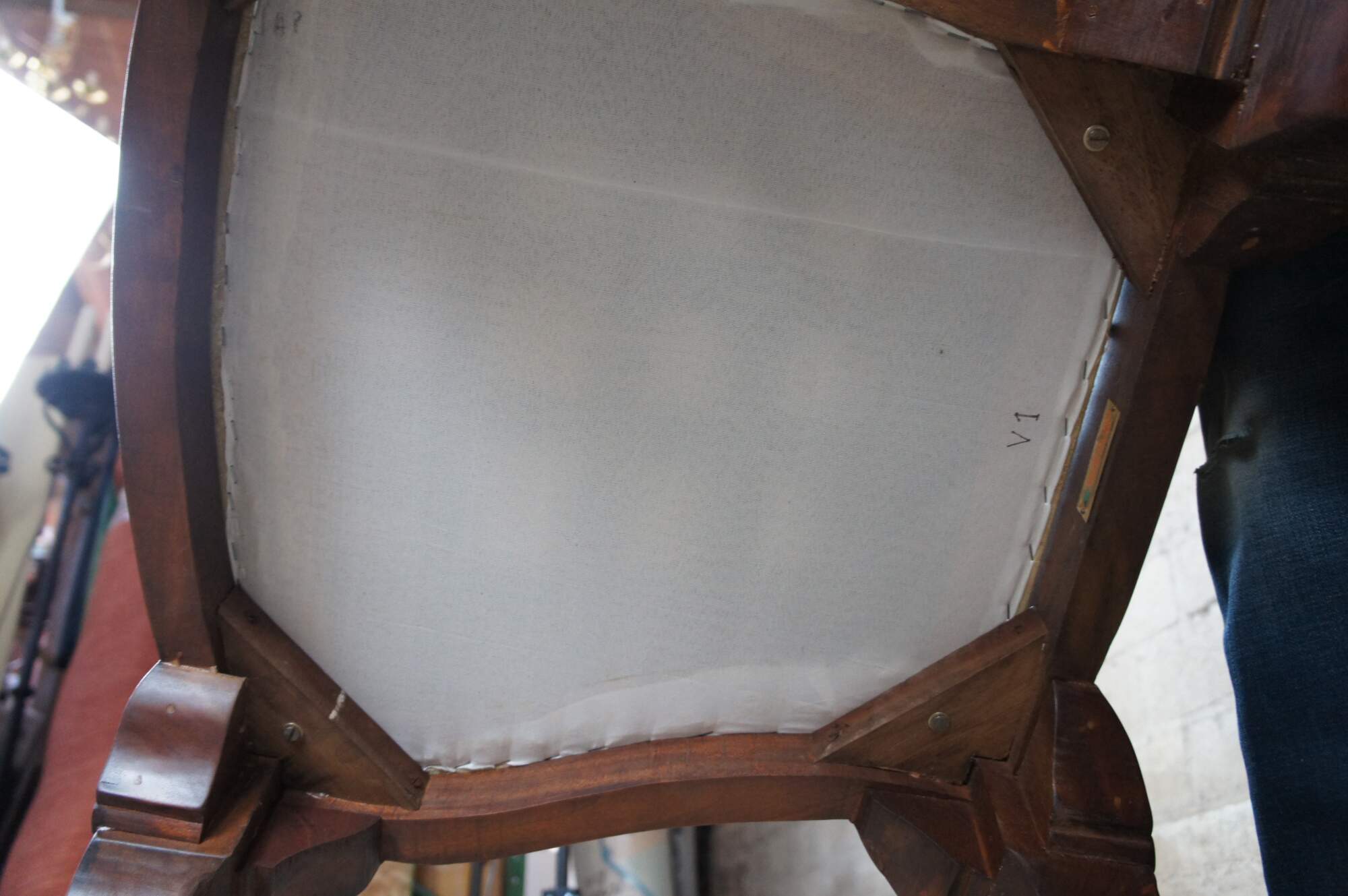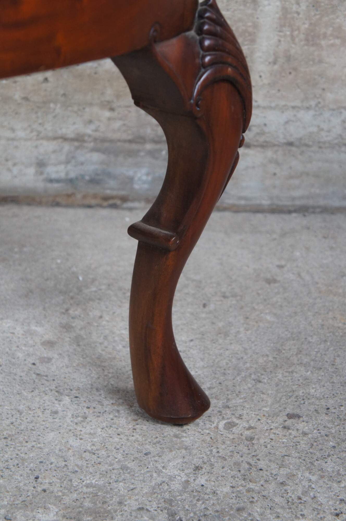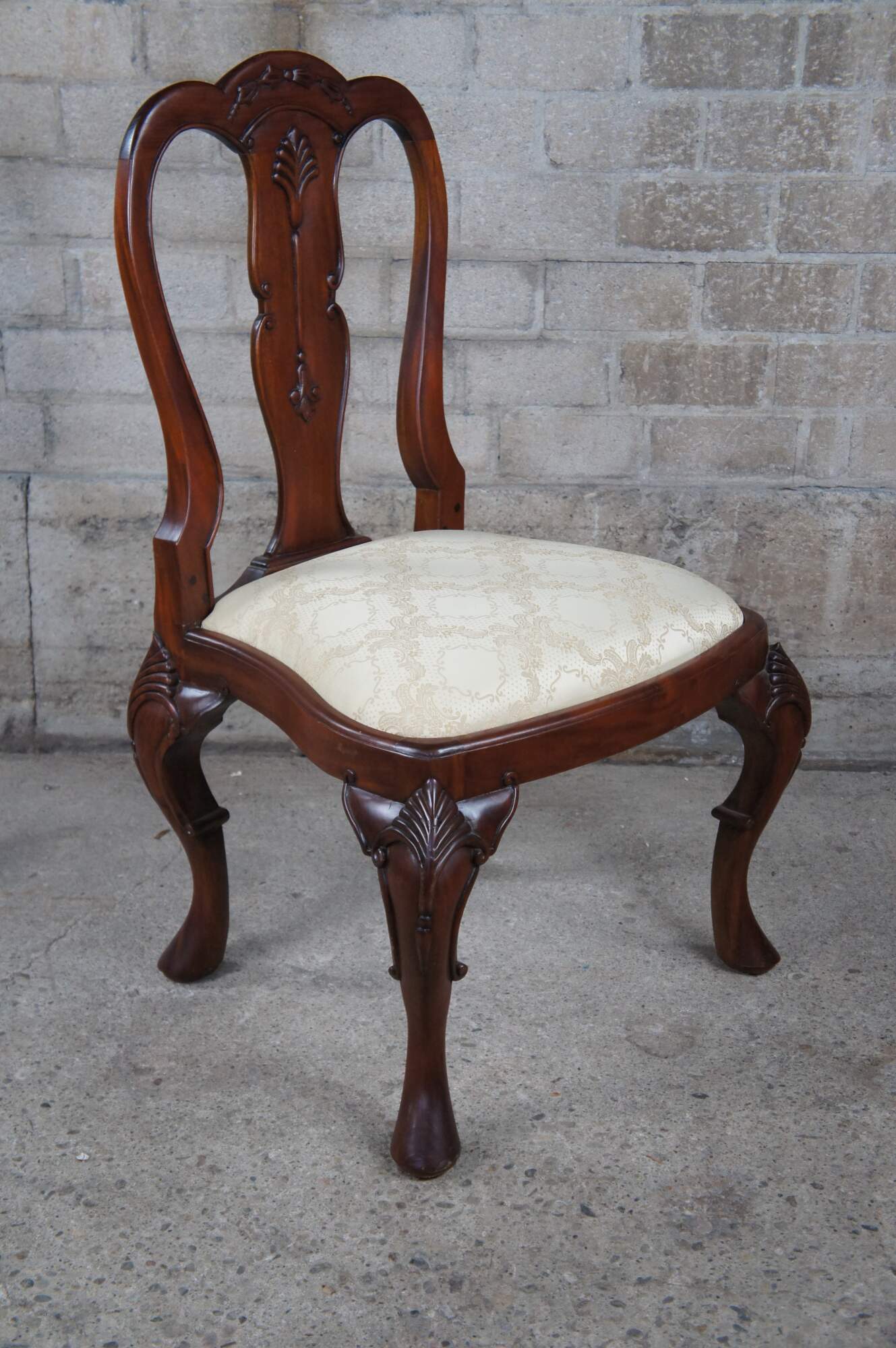 An ornately carved mahogany Georgian style side chair. Features a sarved back splat, silk brocade seat and pronounced cabriole legs with scalloped knees.