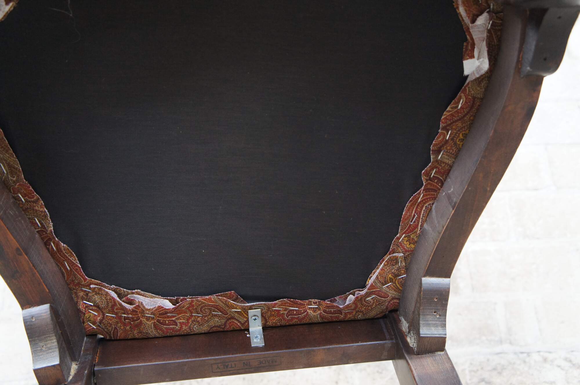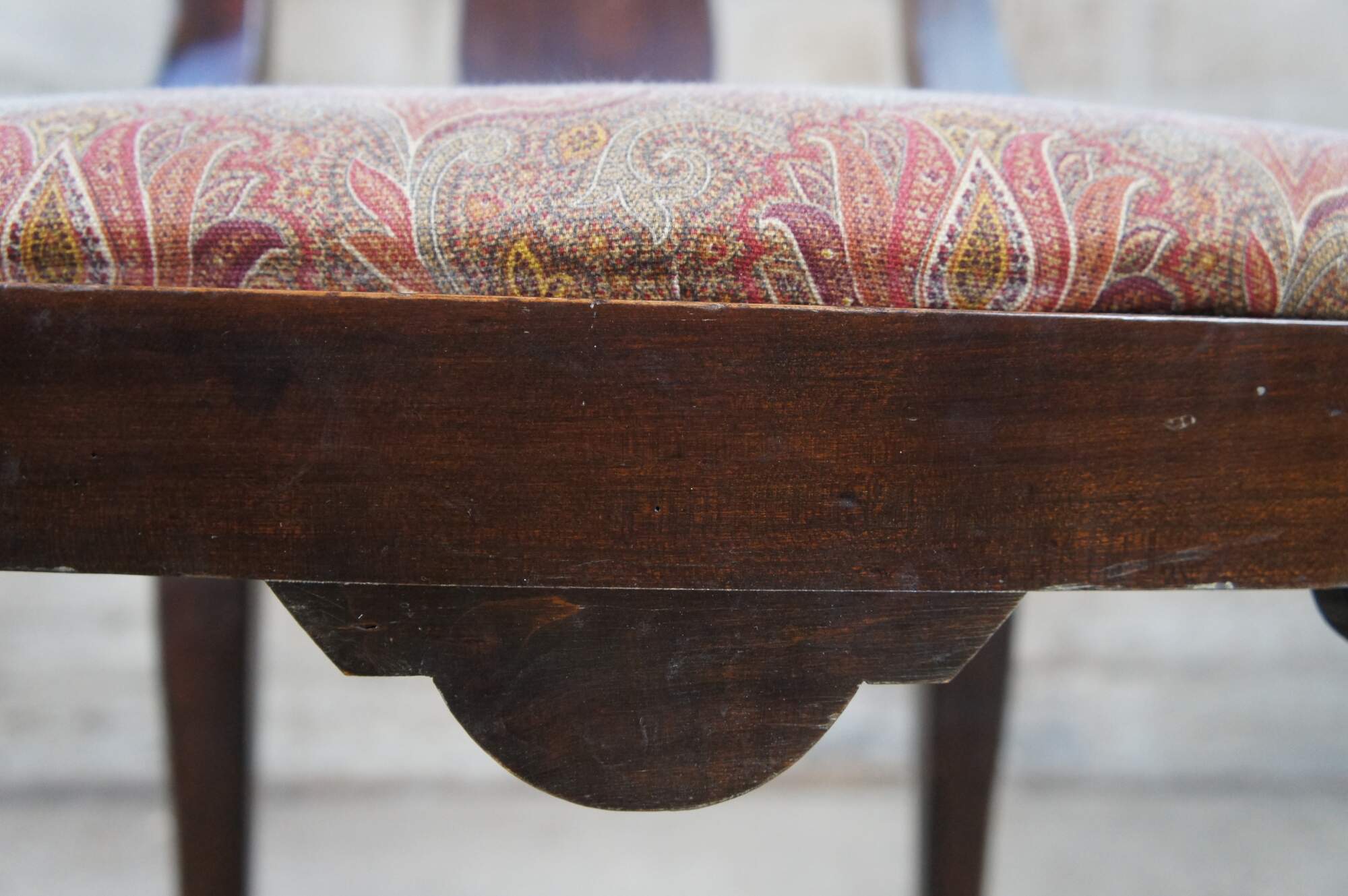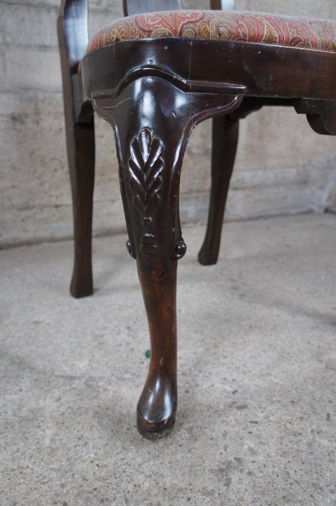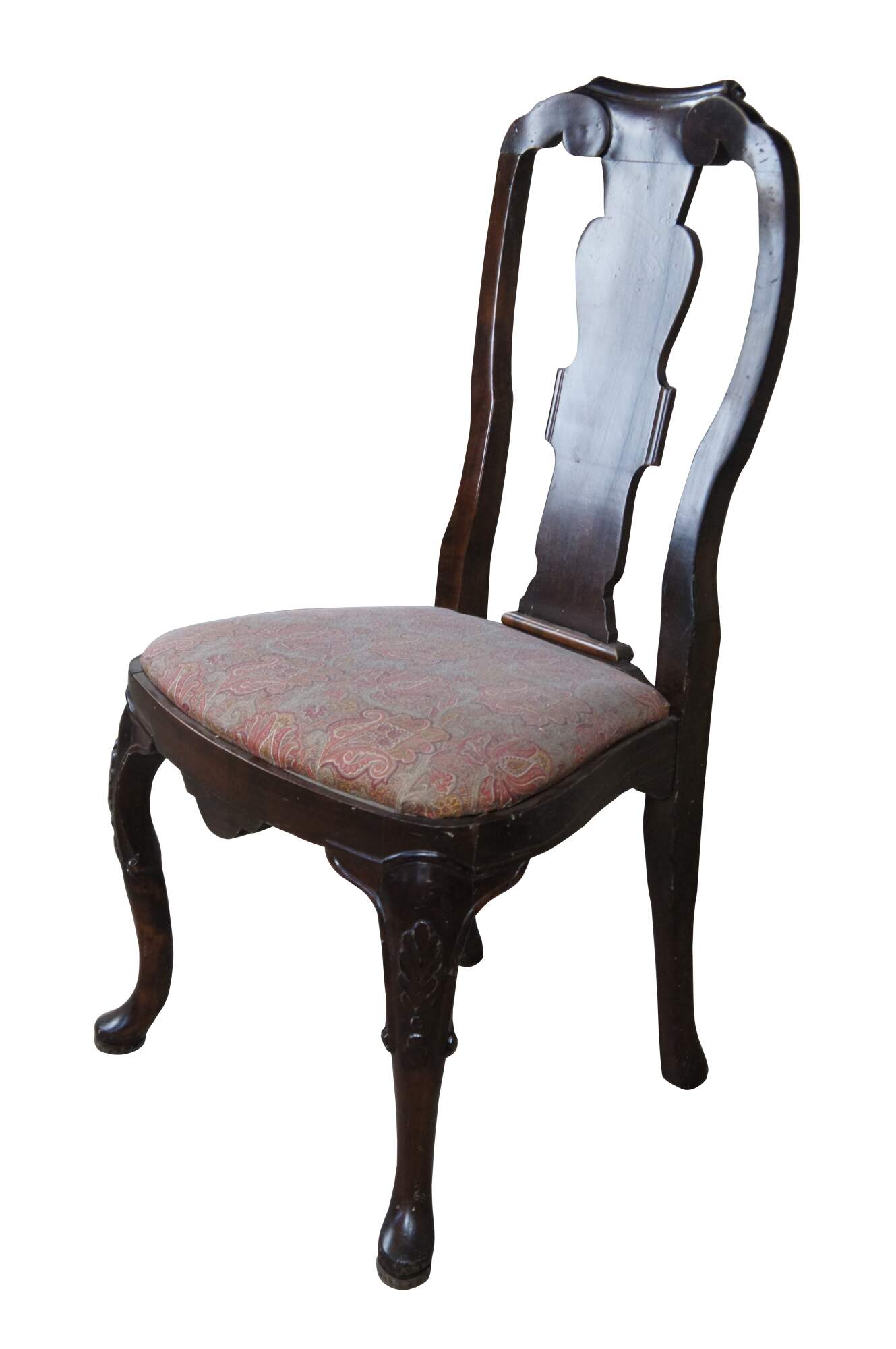Italian side chair, circa last quarter 20th century. Featured an aged appearance in Queen Anne styling with long slender back featuring scrolled accents. Seat is upholstered with paisley design over cabriole legs with carved knees.