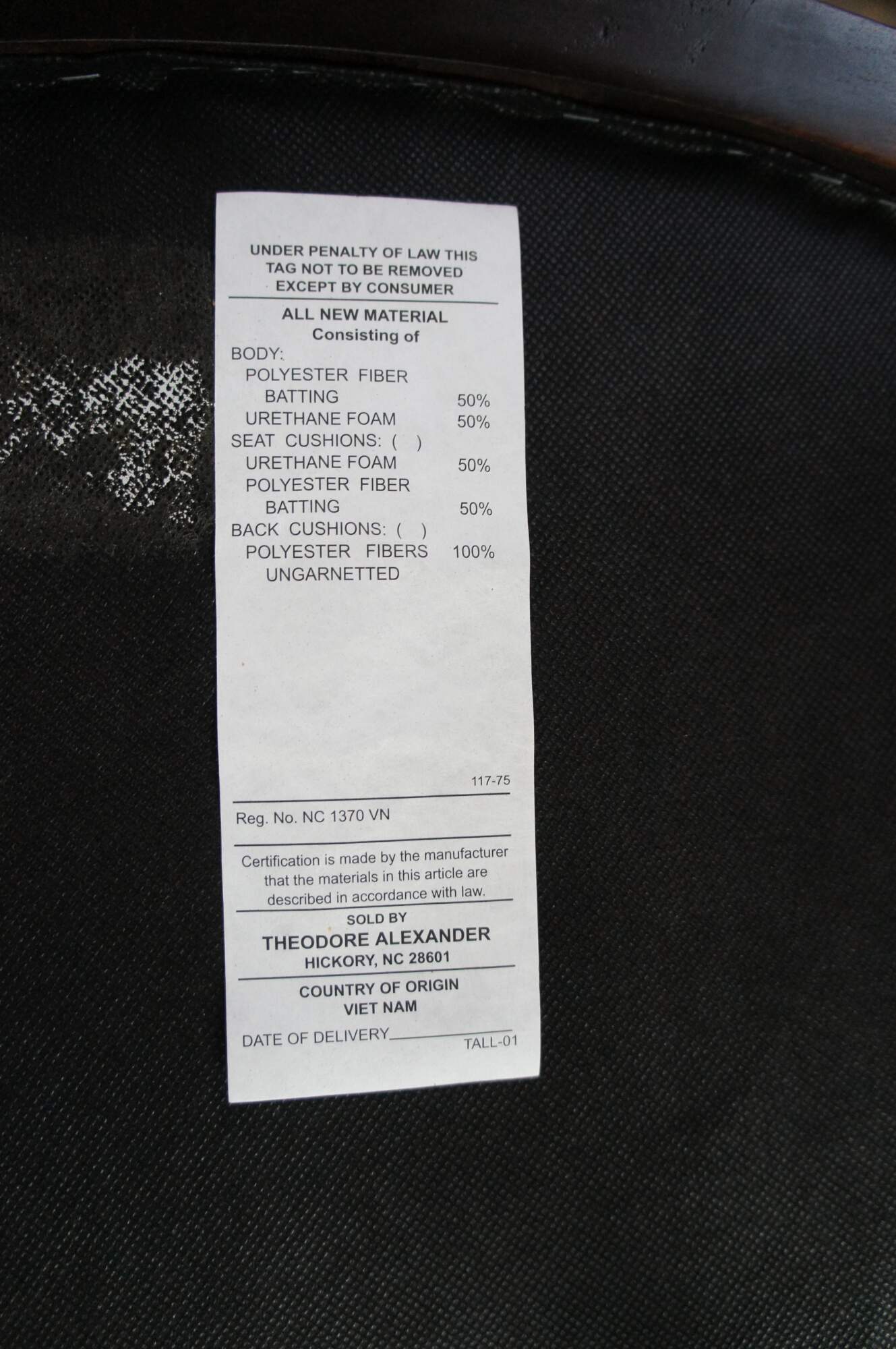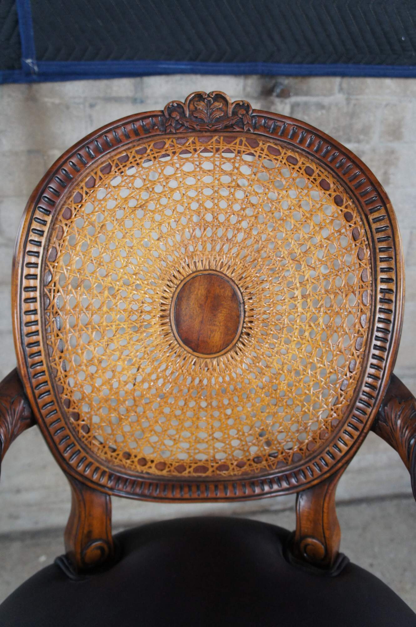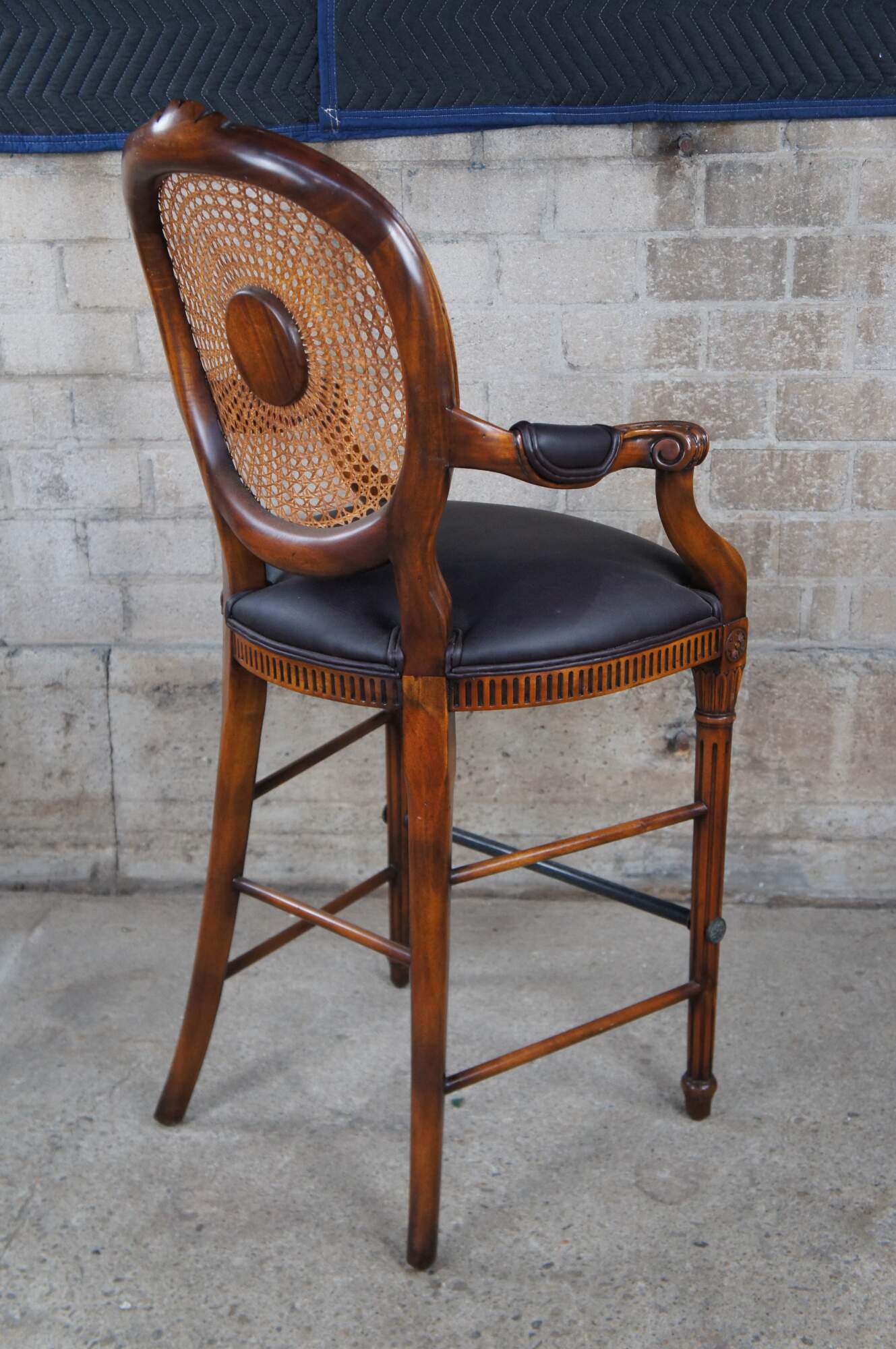 Theodore Alexander French Louis XV Bar Stool. Made from mahogany with cane back, padded arms, brown leather seat and turned fluted legs leading to foot rest and turnip feet. The chair is carved with traditional french medallions, fluting and foliate detail.