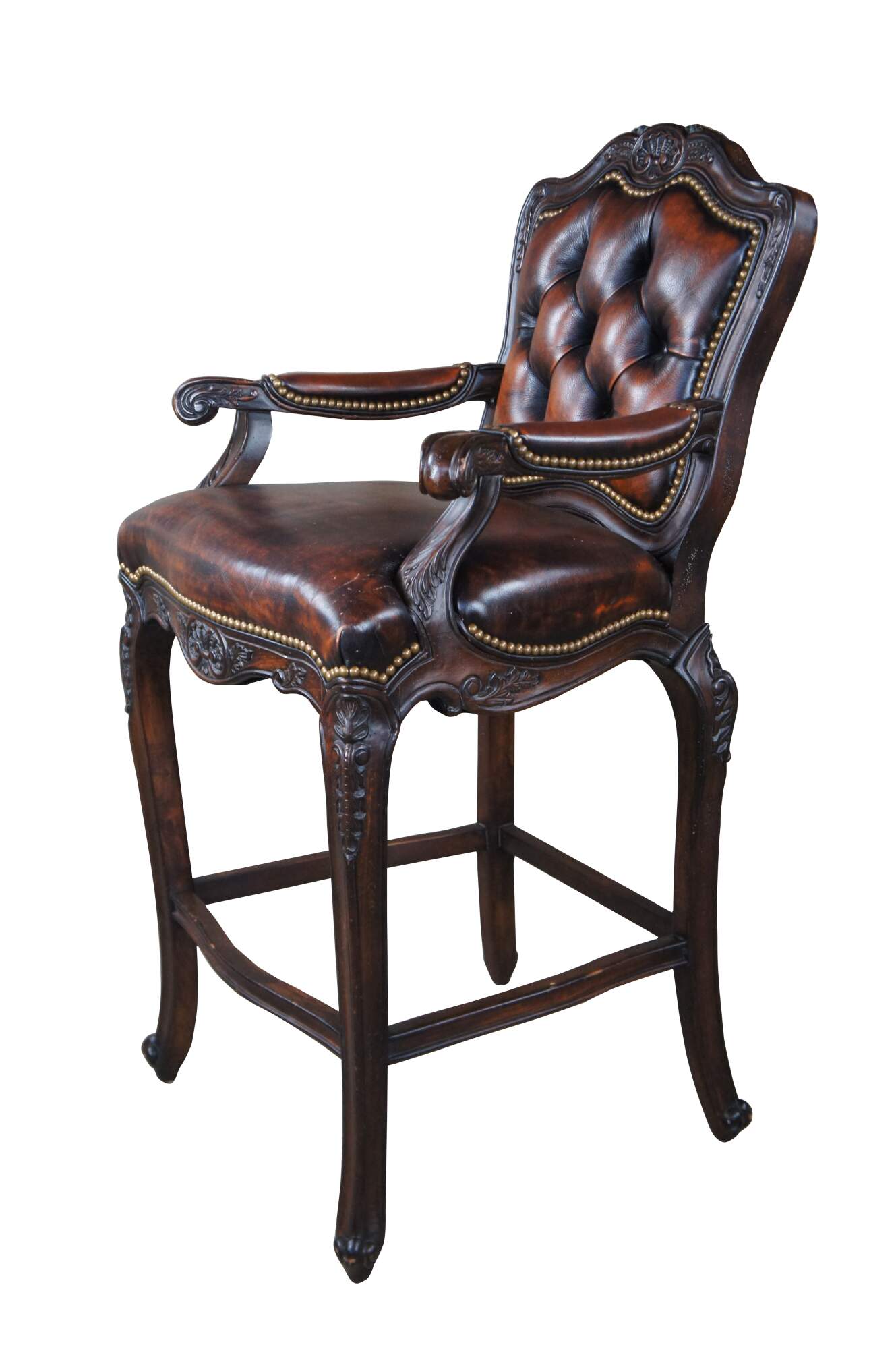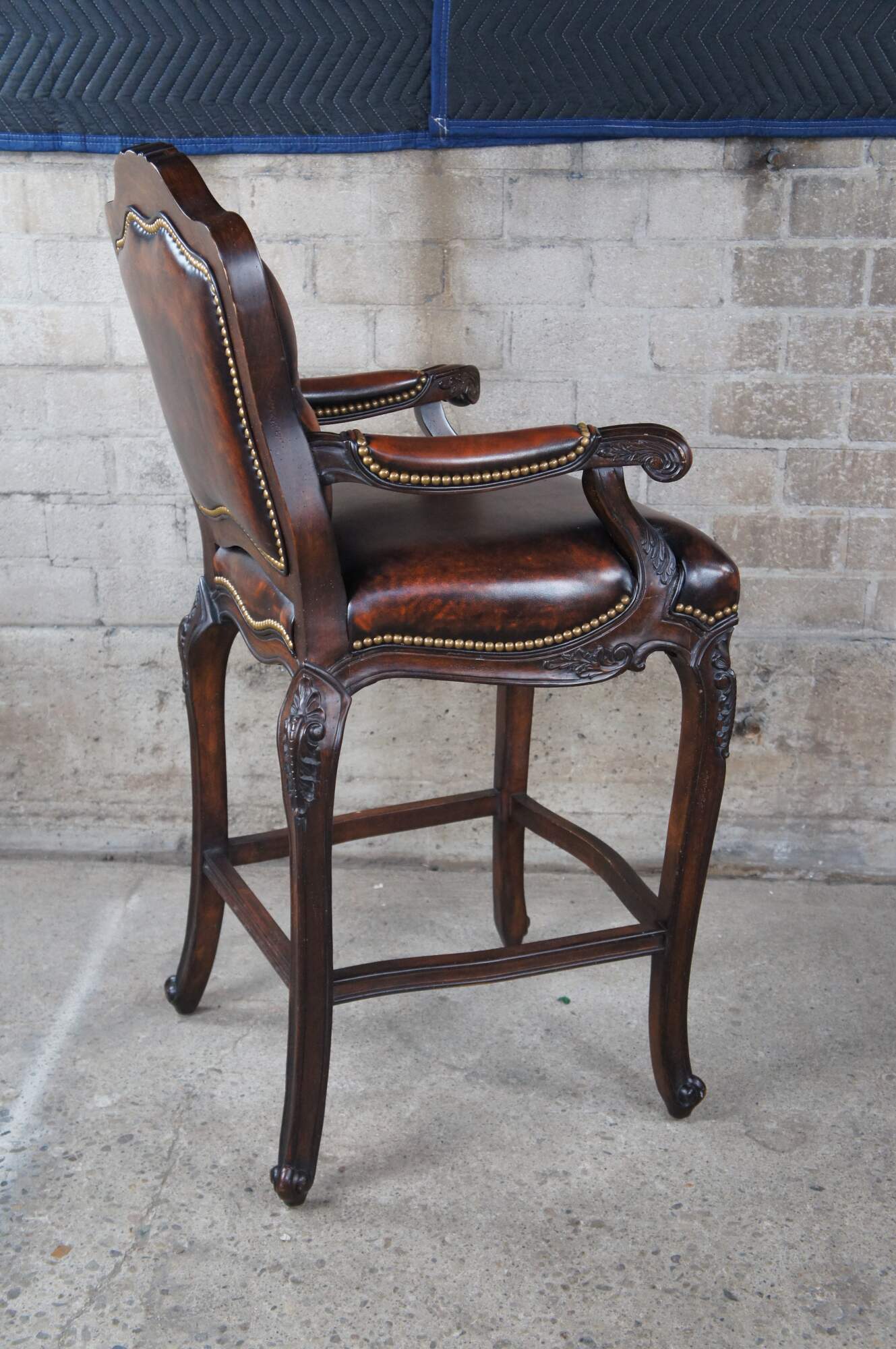 Pair of Hancock & Moore French Country / Louis XV style bar stools. Features a carved and scalloped frame with brown leather seats and tufted back. Accented by brass nail head trim over long cabriole legs with scrolled feet. MSRP $4,000+/per