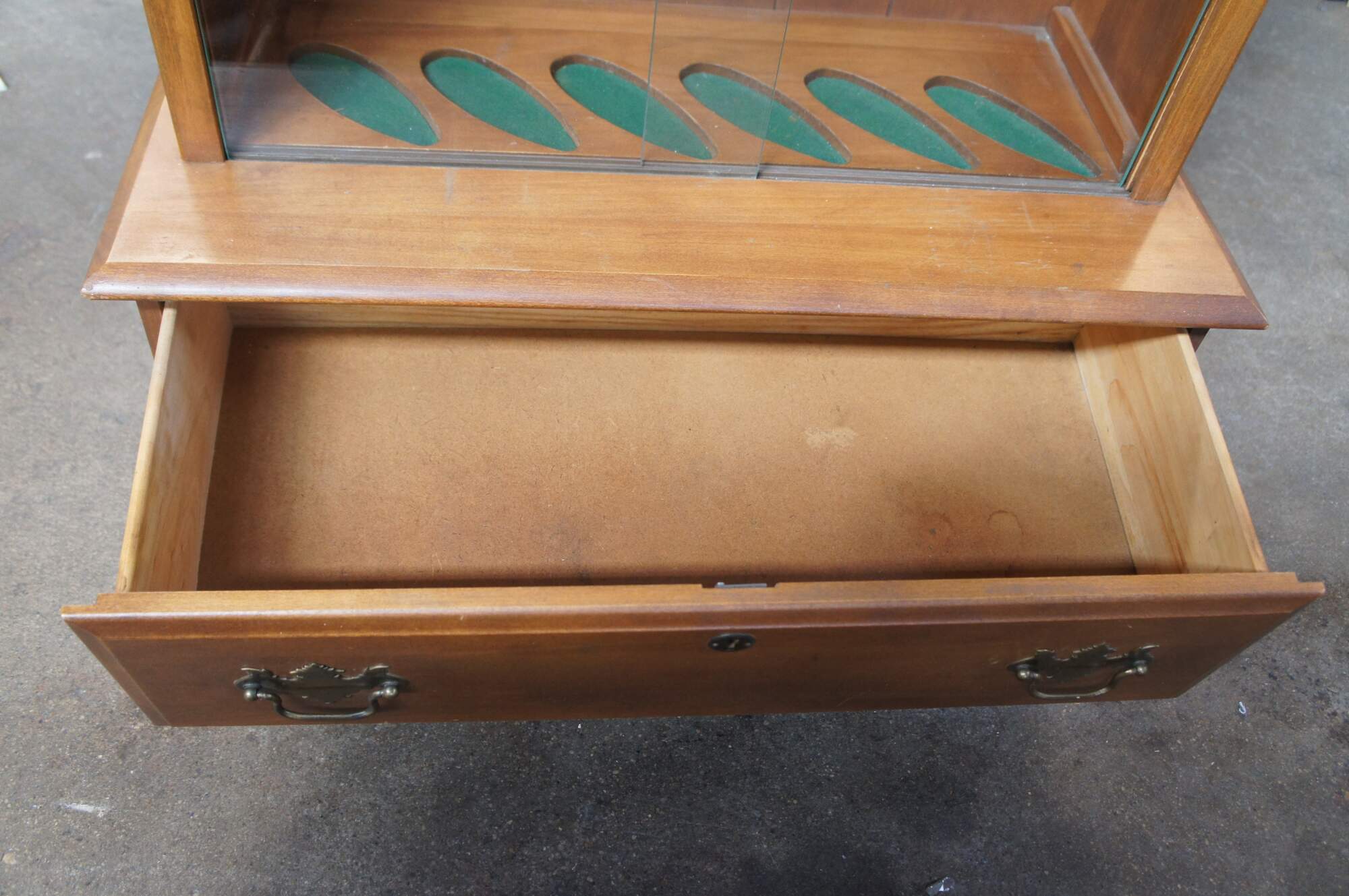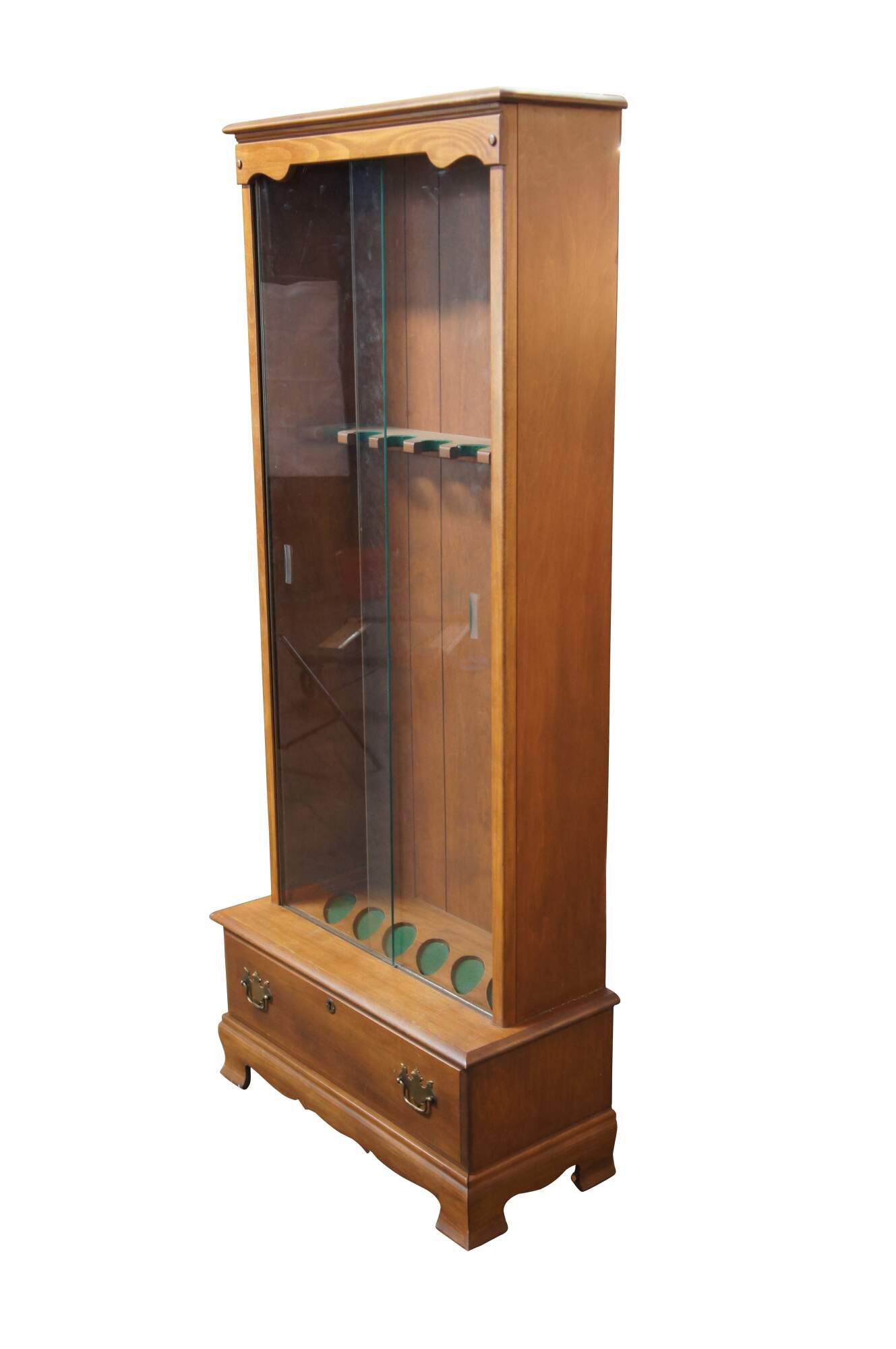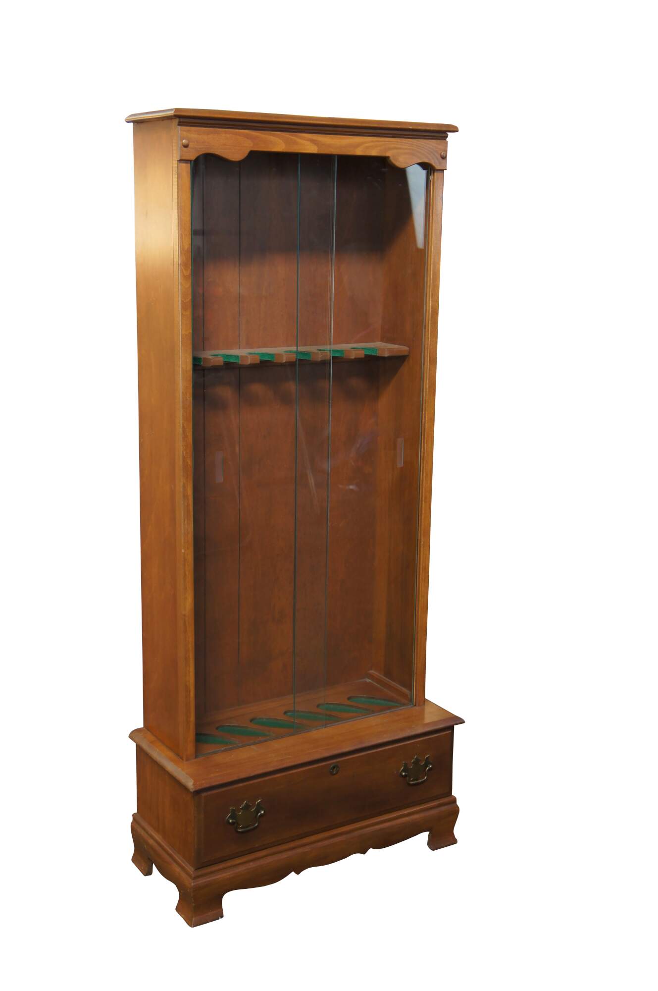 American Country maple gun cabinet. Features a step-back frame with glass front and space for six rifles. Lower section has a drawer for ammunition / supplies. Drawers is fitted with two colonial brass batwing drawer pulls.