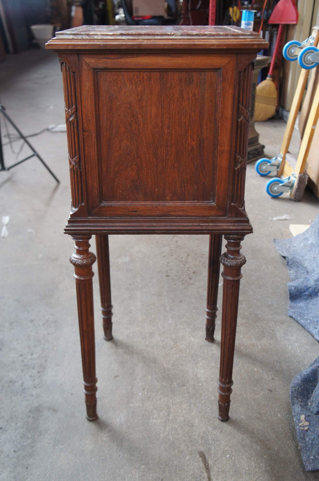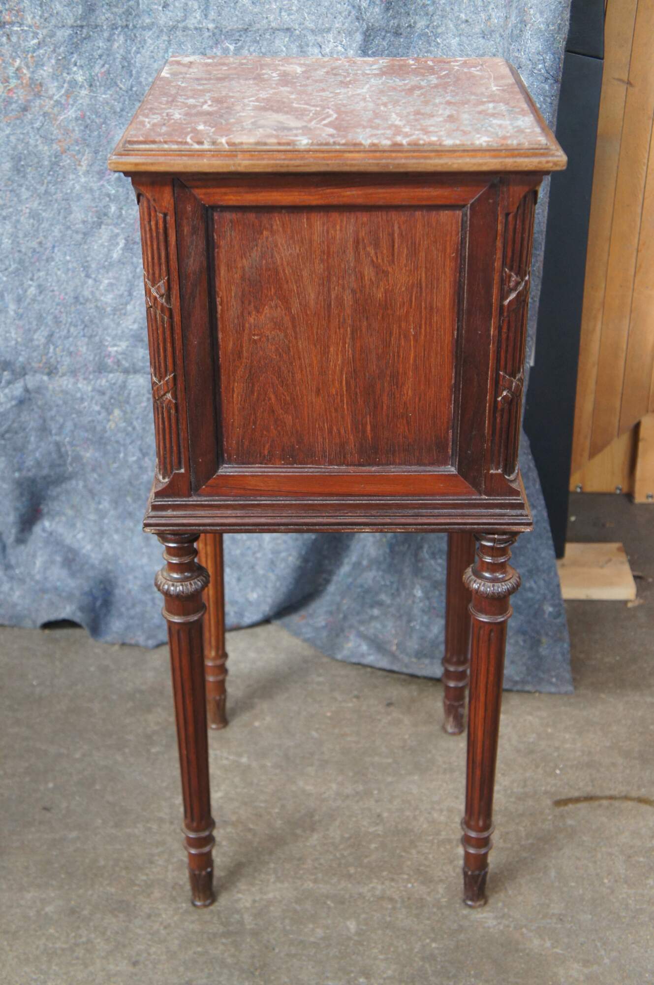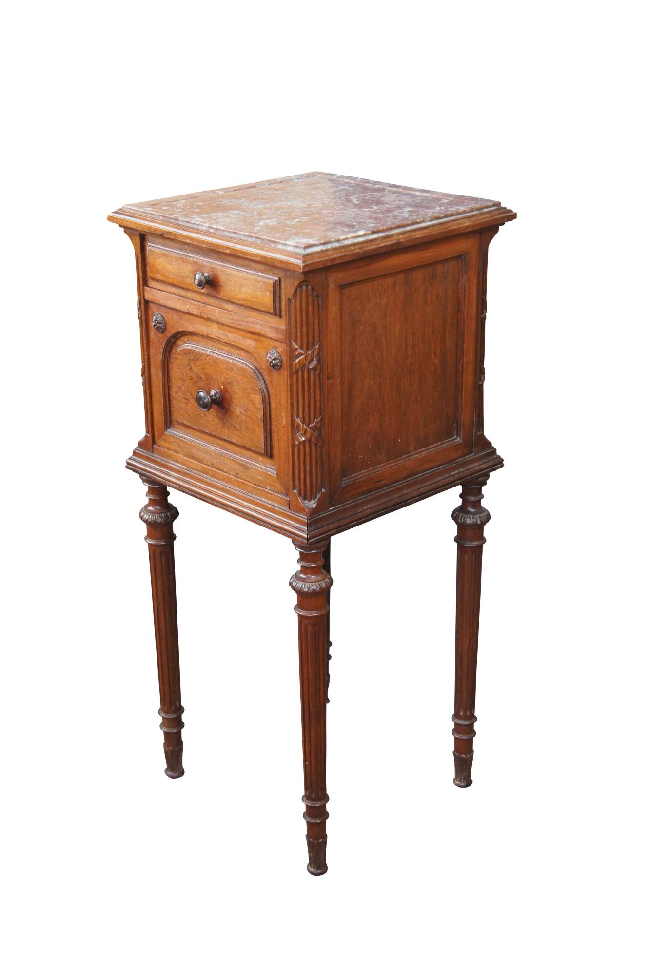 An antique late 19th Century French bedside table. Features a square frame made from walnut with inset rouge marble top. The case is accented by French medallions and ornate reeded and ribboned stiles. Includes one upper hand dovetailed drawer and a marble lined interior. The marble lined interior allows for use as a humidor. The cabinet is set over turned, fluted tapering legs with foliate carved feet.