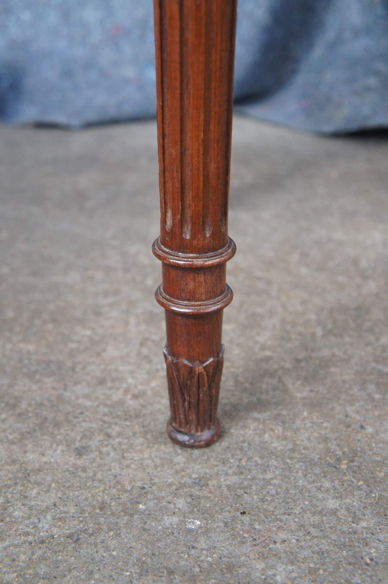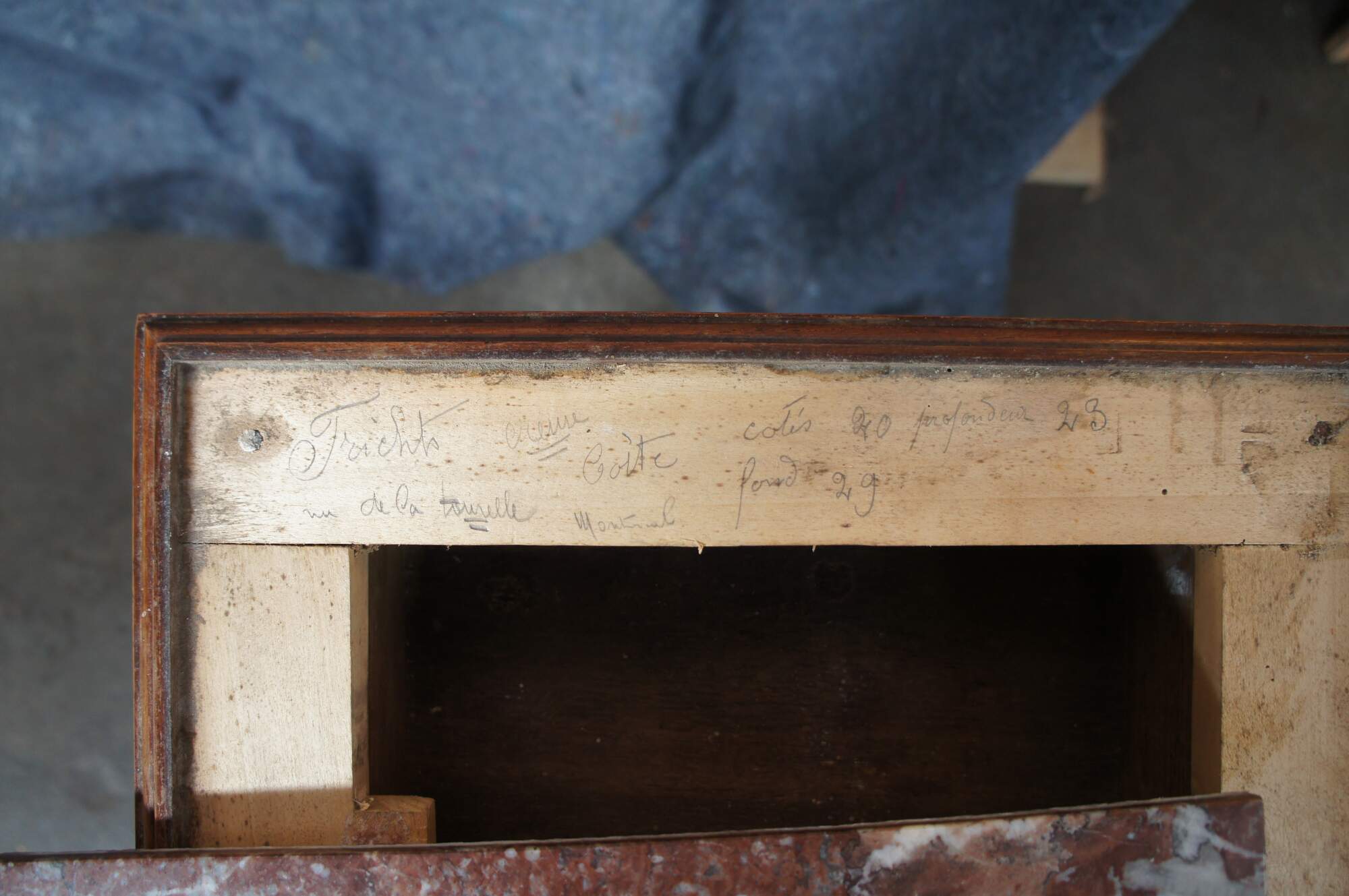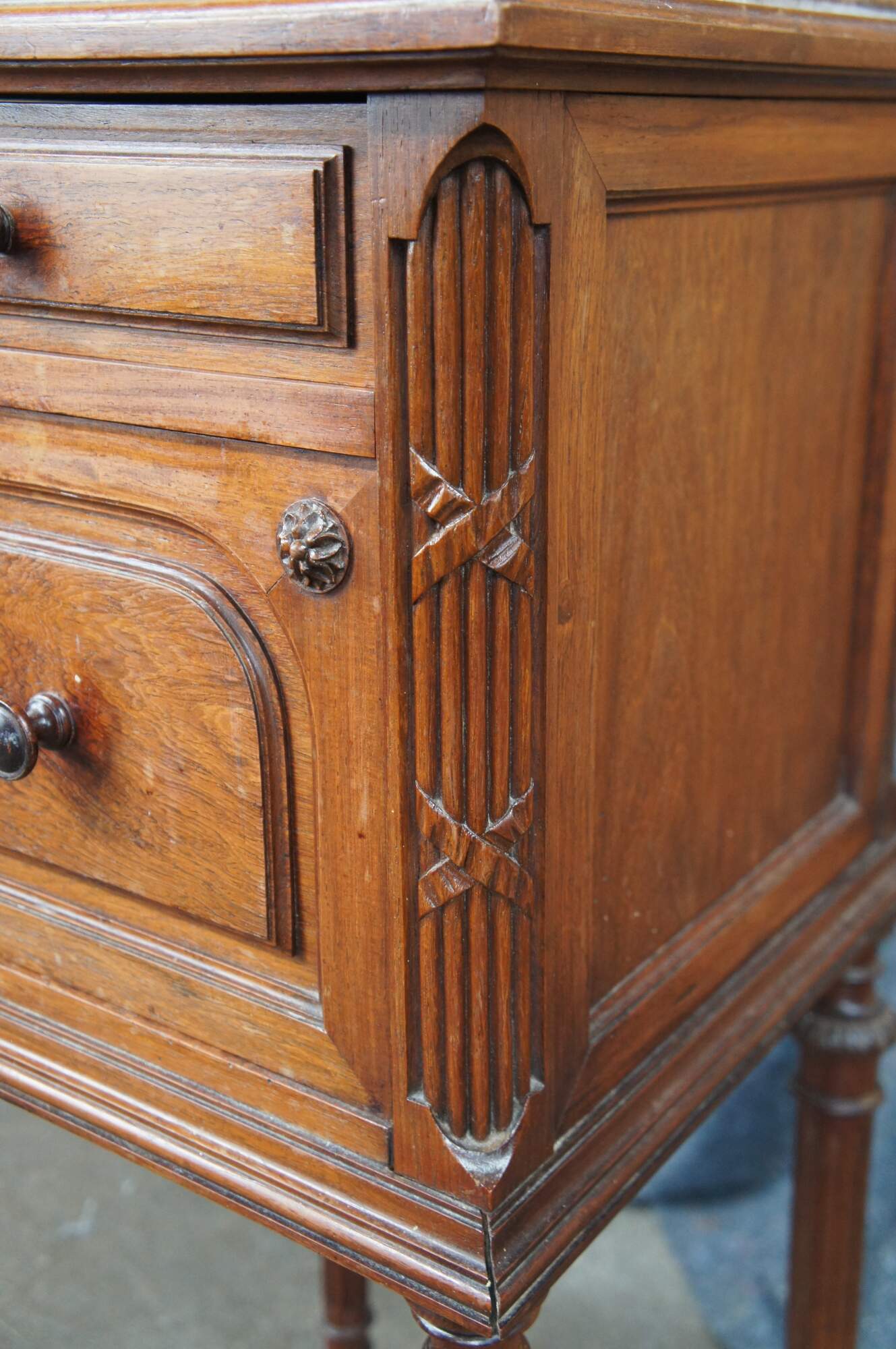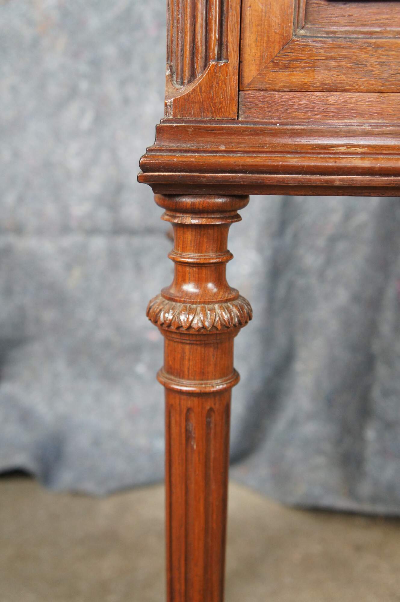 An antique late 19th Century French bedside table. Features a square frame made from walnut with inset rouge marble top. The case is accented by French medallions and ornate reeded and ribboned stiles. Includes one upper hand dovetailed drawer and a marble lined interior. The marble lined interior allows for use as a humidor. The cabinet is set over turned, fluted tapering legs with foliate carved feet.