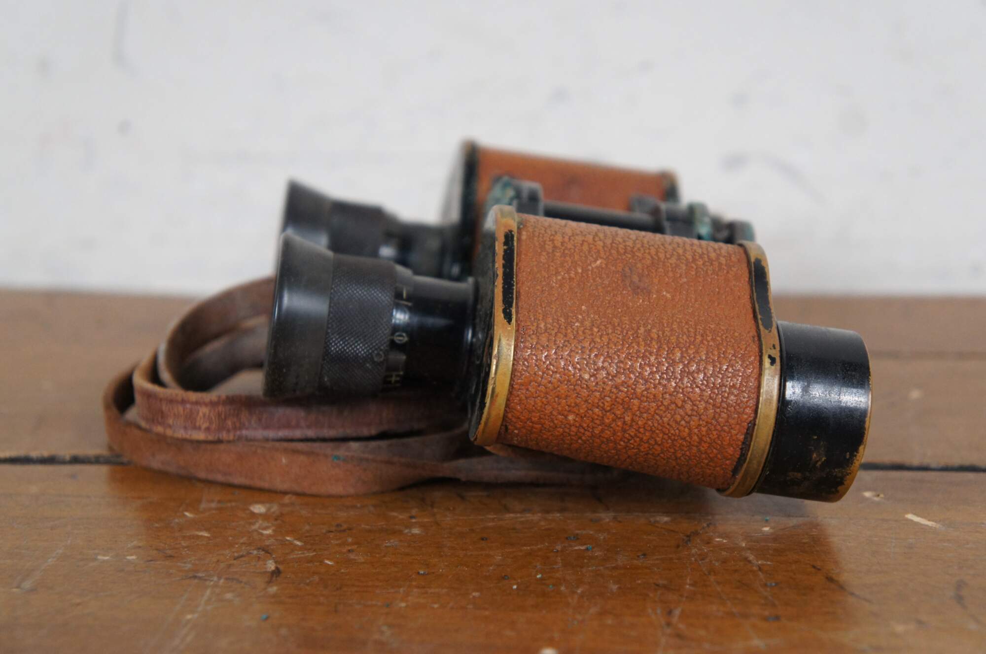 Antique 1940's / World War II US Army / Military Signal Corps binoculars, manufactured by Bausch & Lomb Optical Co. Black painted brass with brown leather grips. Brown leather carrying case with compass in lid. Serial No. EE 21977. Made in USA. Interior of case marked "EMBecher Dayton 6 Ohio.
