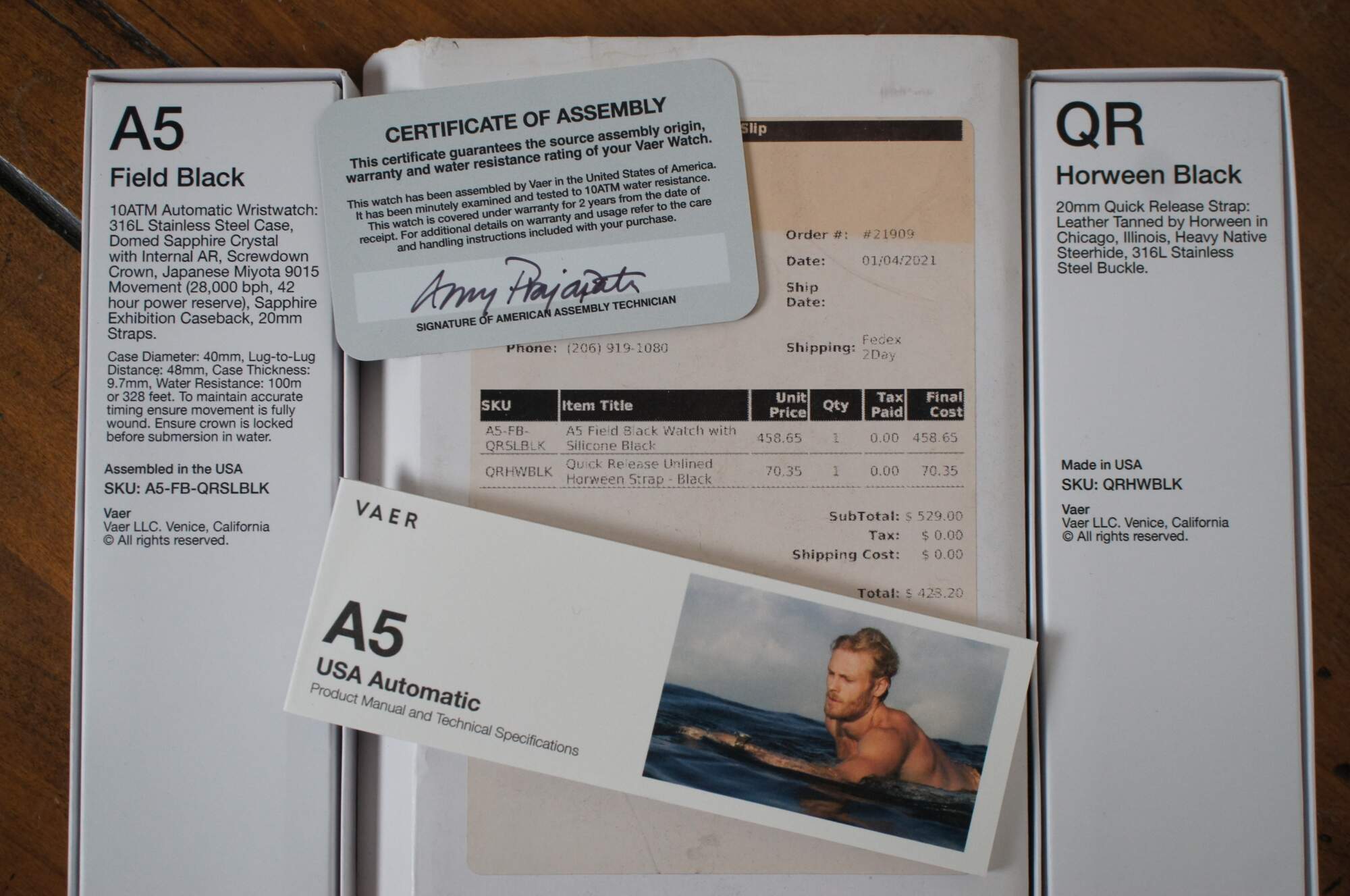 Vaer A5 Field Black 10ATM Automatic Wristwatch - 316L Stainless Steel Case, Domed Sapphire Crystal with Internal AR, Screwdown Crown, Japanese Miyota 9015 Movement, Sapphire Exhibition Caseback, 20mm Straps. SKU: A5-FB-QRSLBLK. Assembled in the USA. Black silicone band. QR Horween Black 20mm Quick Release Strap - Leather Tanned by Horween in Chicago, Illinois, Heavy Native Steerhide, 316L Stainless Steel Buckle. SKU: QRHWBLK. Made in USA.