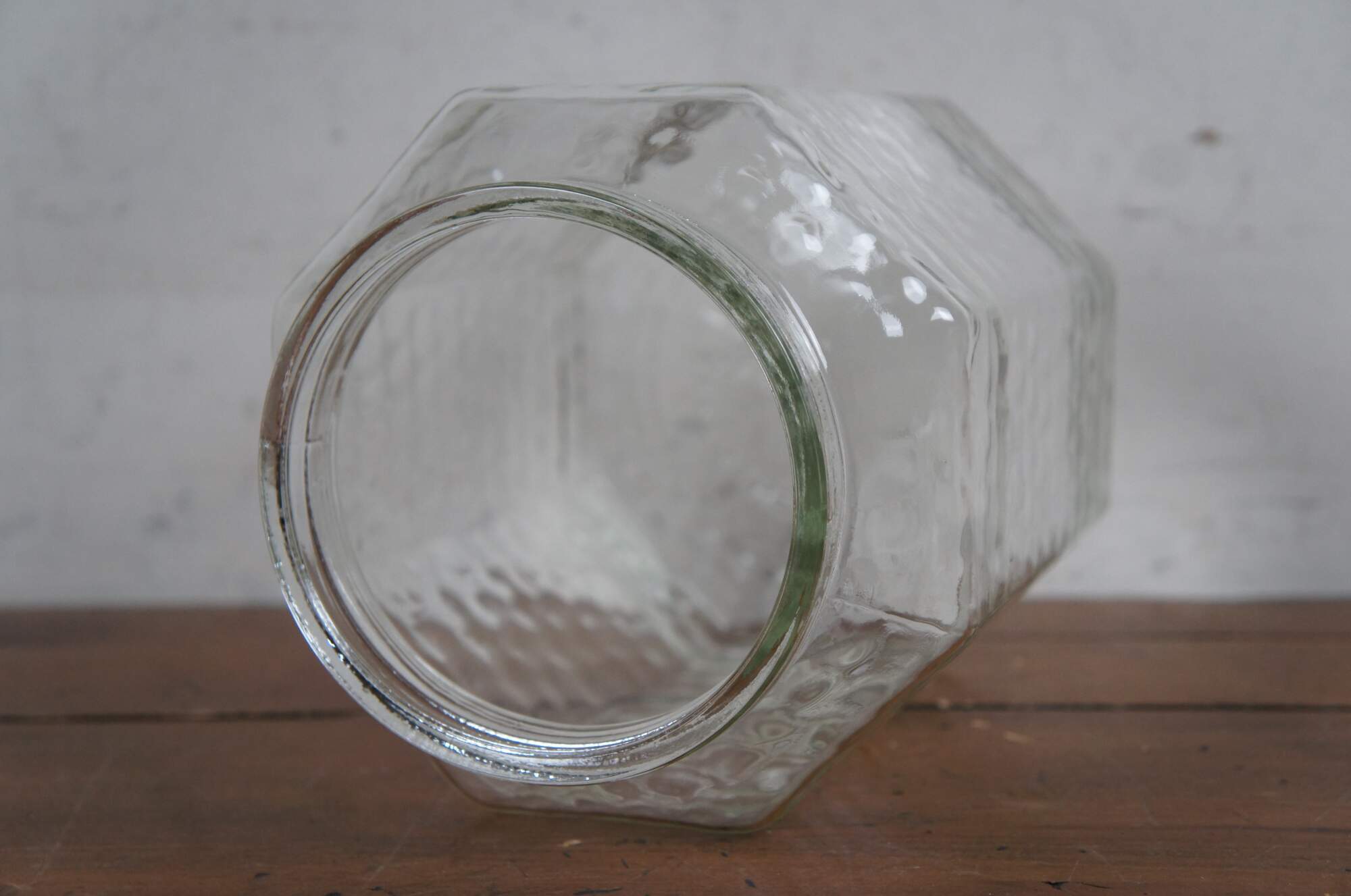 Vintage 2002 Arthur Court kitchen canister featuring an octagonal dimpled glass jar with a brightly polished cast aluminum grapevine lid. Retired design.