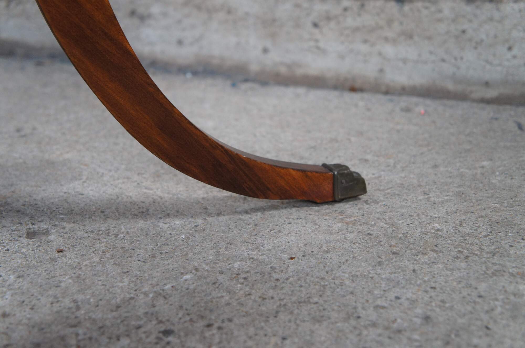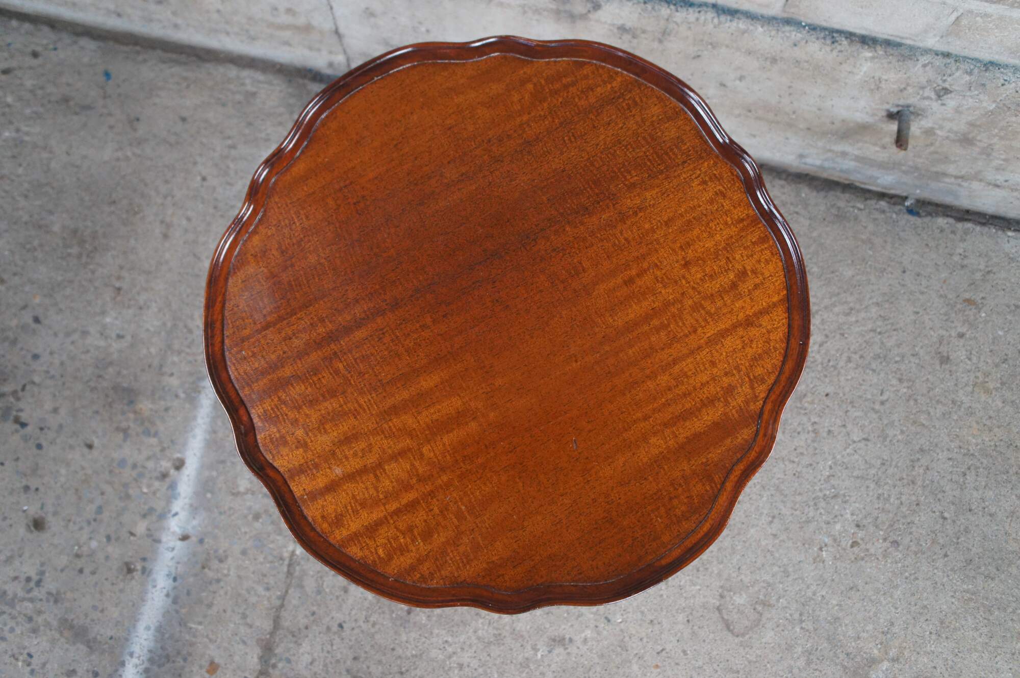 Antique Duncan Phyfe pie crust tea table. Made of mahogany, featuring scalloped gallery top supported by tri foot pedestal base with brass capped feet.