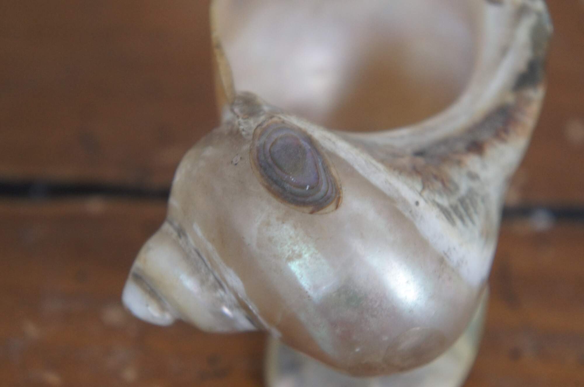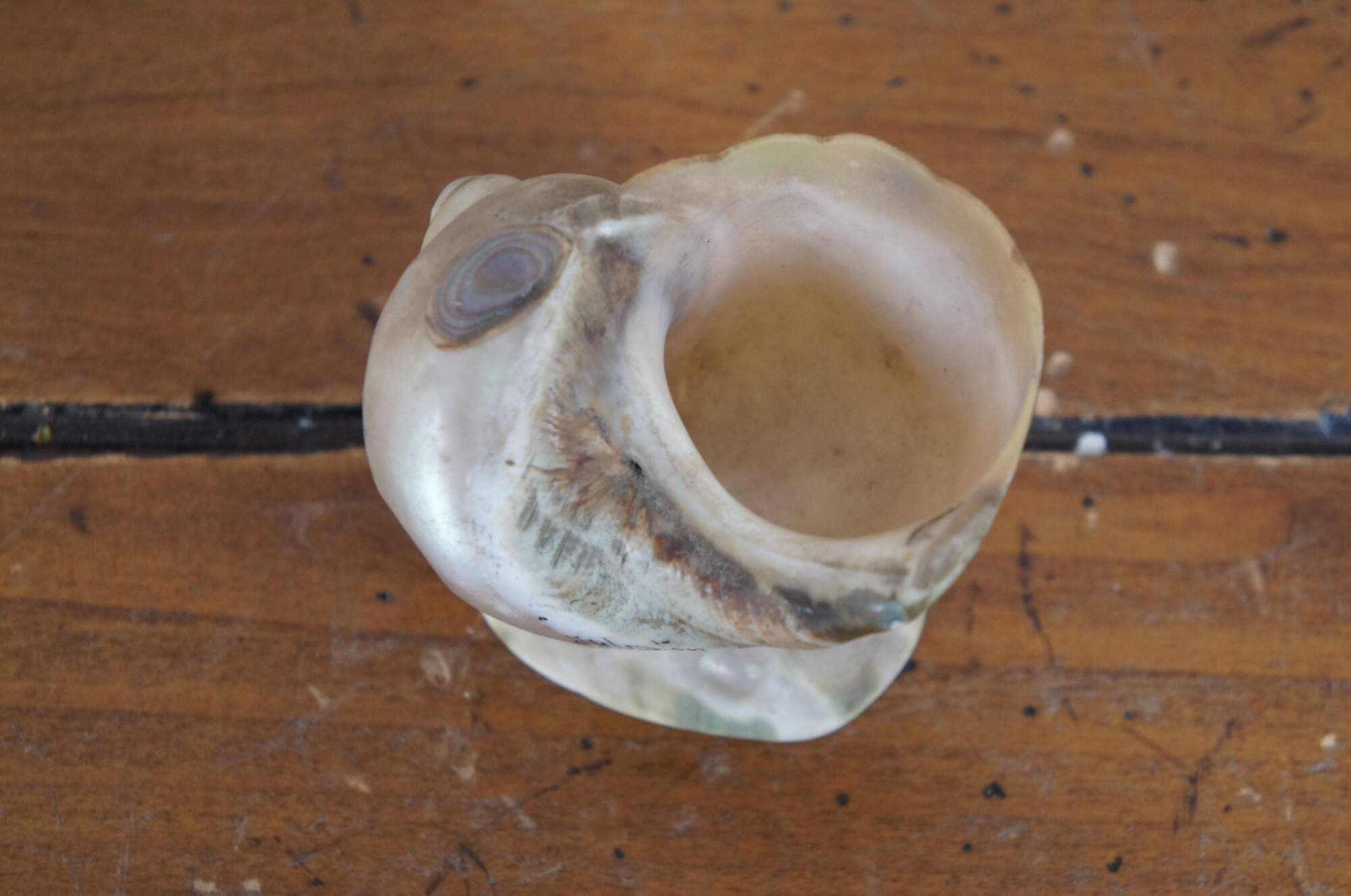 Antique polished mother or pearl spiral nautical sea shell with scalloped edge mounted to a matching base, painted with the worn name of the place it was from. Petite size perfect for use as a bud vase or ashtray / inkwell / petite compote.