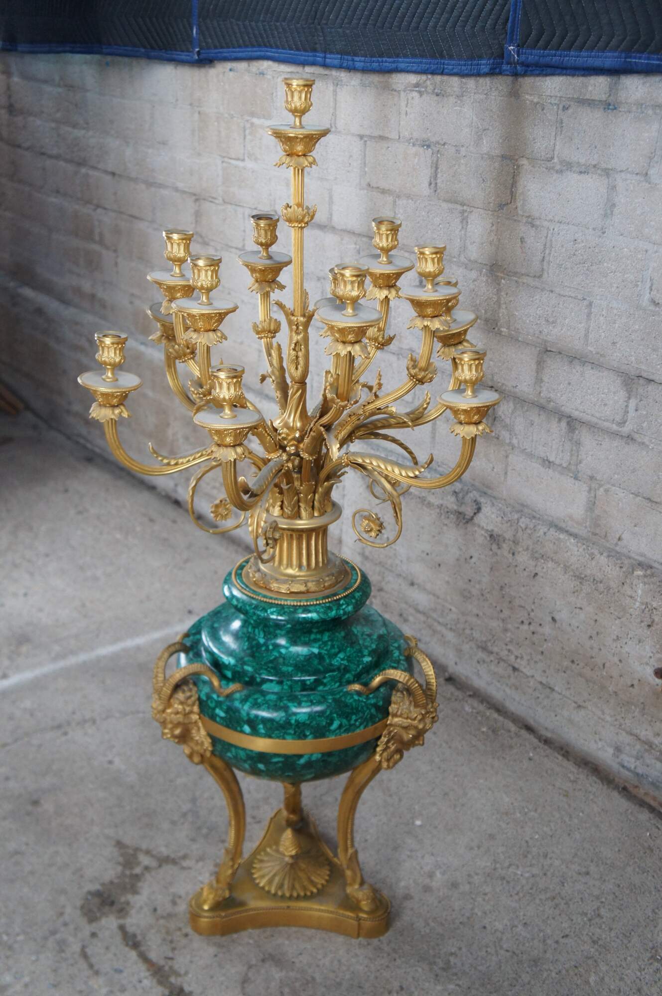 A magnificent French Napoleon III style 24 gold-plated (dor'e) vase and candelabra with saytrée heads and floral themes by Eric Stepniewski. The exquisite malachite base contrasting beautifully with the floral and satirical gilded bronze theme is simply stunning. This is an absolutely decadent and imposing product in its presence and size.