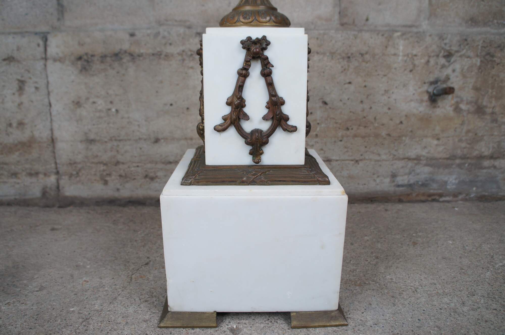 An Antique French Neoclassical Pedestal or Stand, Circa 1900s. Made from white marble with a sandwiched top over a round tapered column with ornate bronze detail. The stand is supported by a stepped and footed plinth base with ormolu mounts.