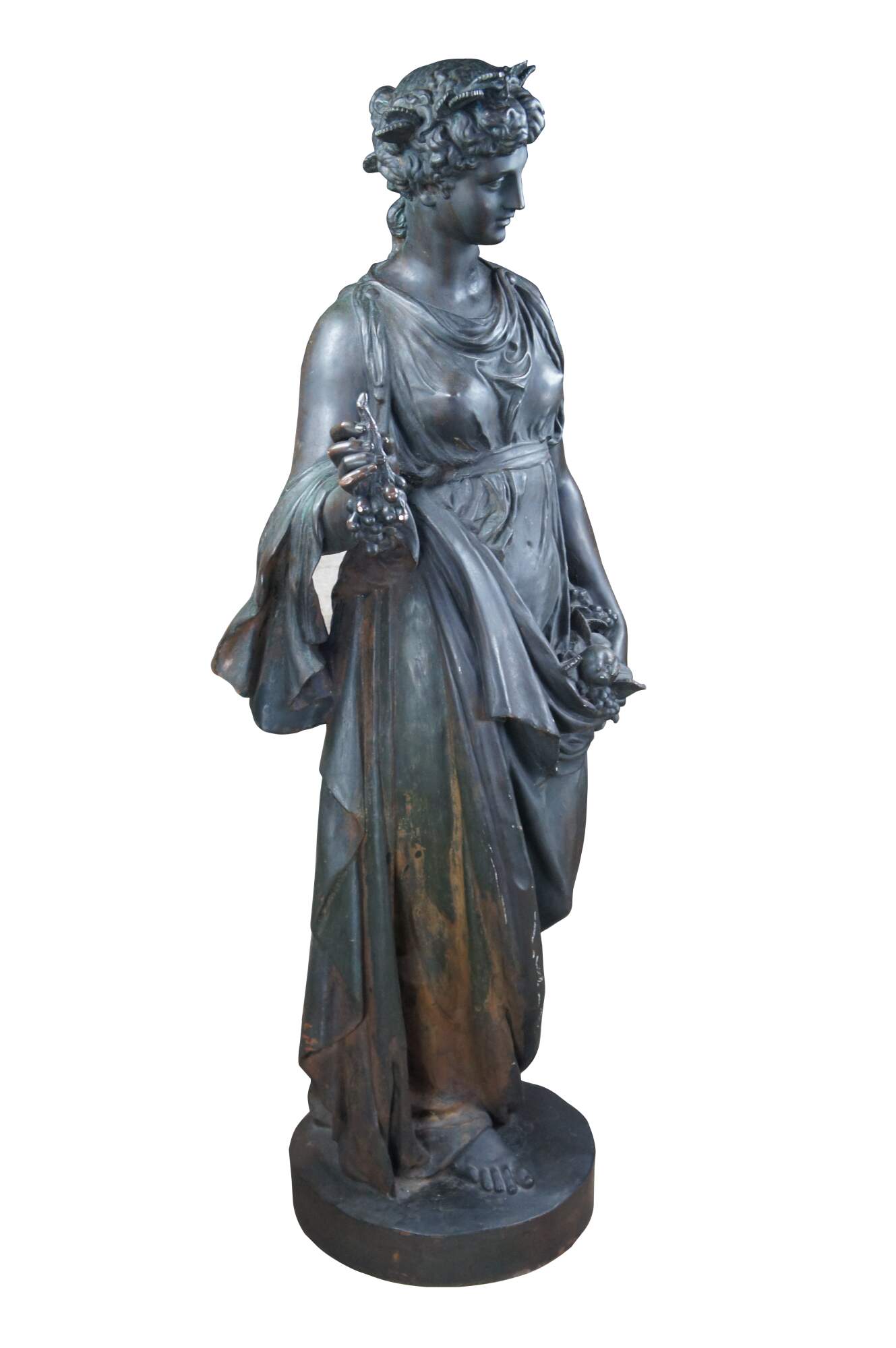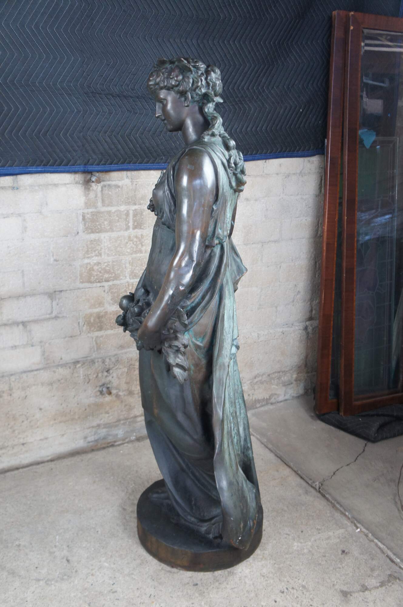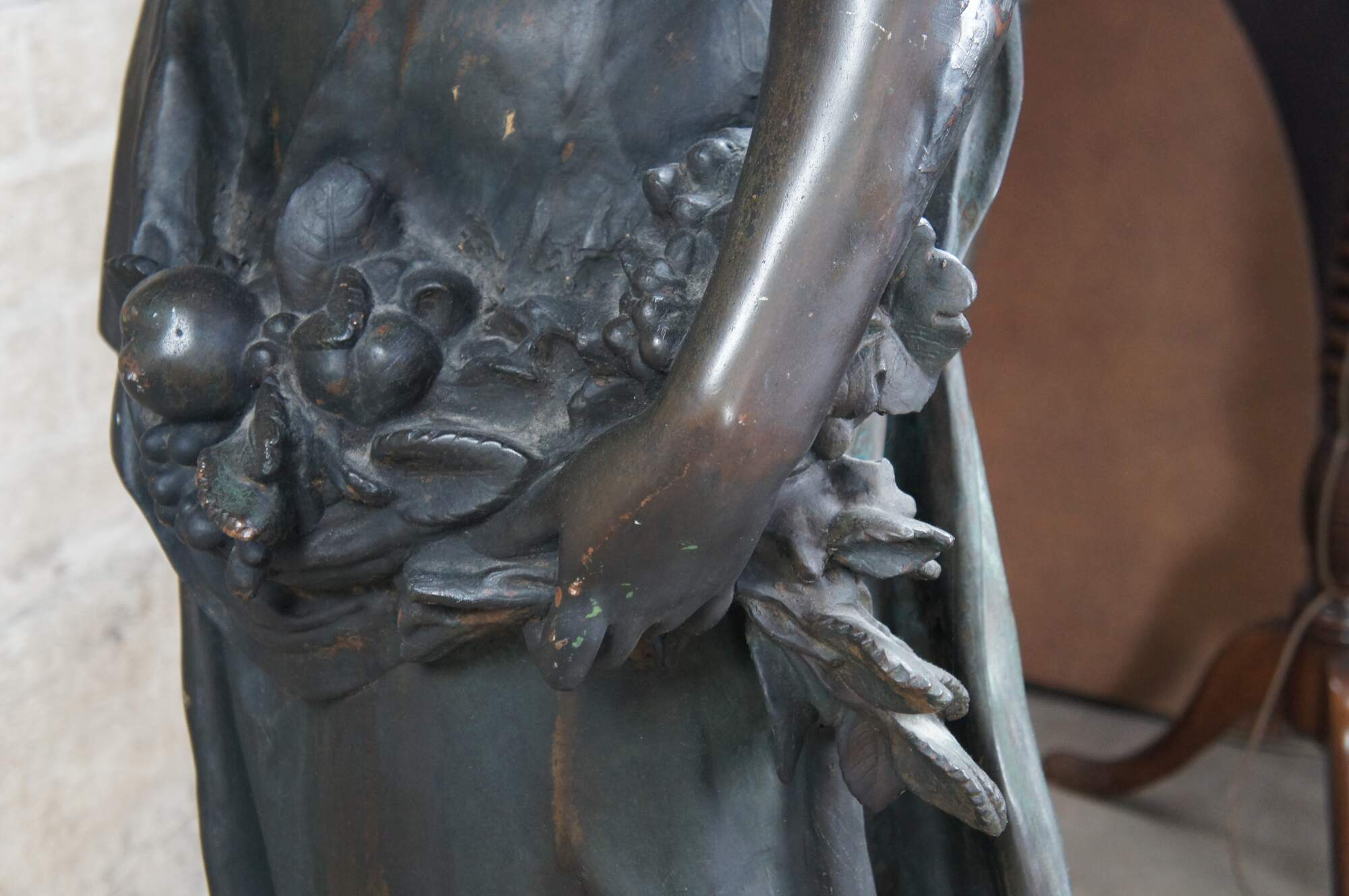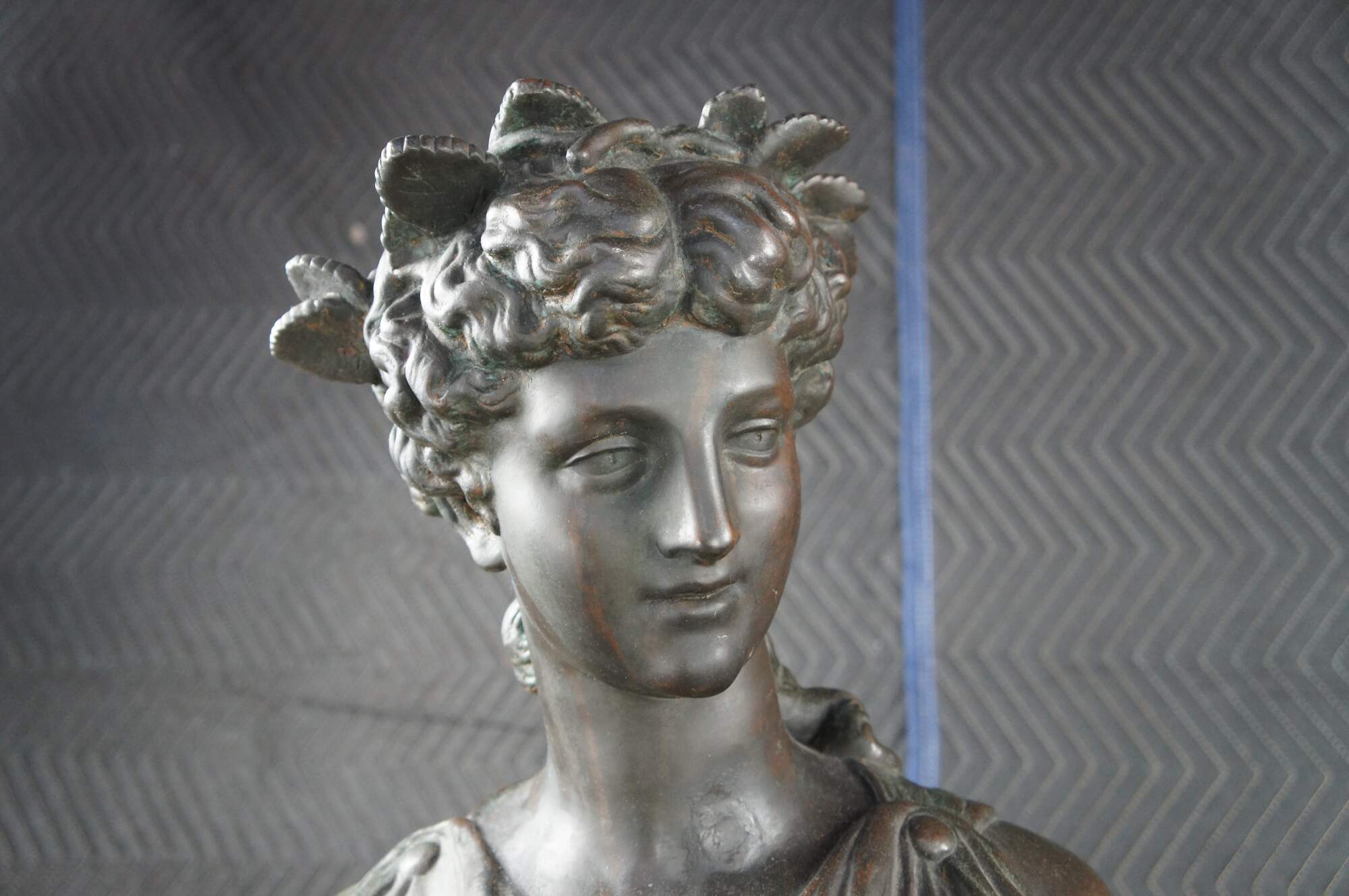 A rare and Impressive solid bronze sculpture of Demeter, The Goddess of Harvest, Circa late 18 to early 19th Century. She's is shown standing with tunic, grapes in one hand and a wreath with fruit in the other. Cast in a dark bronze with green verdigris patina.