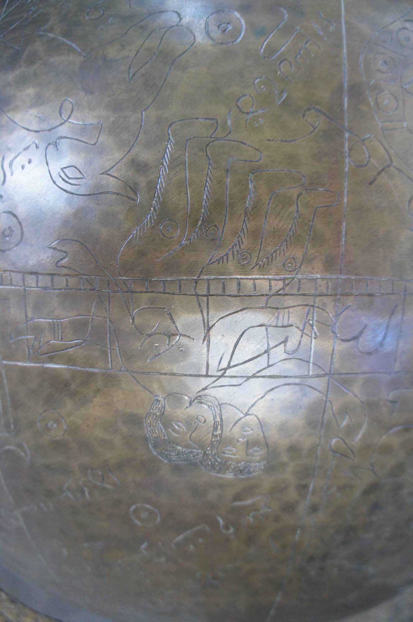 An exceptional large brass Islamic Celestial Globe. The hammered brass sphere constructed from two hemispheres with engraved scales and constellations, pivoted within horizontal ring engraved with the twelve signs of the zodiac, raised on four turned brass legs and stretcher with central finial,