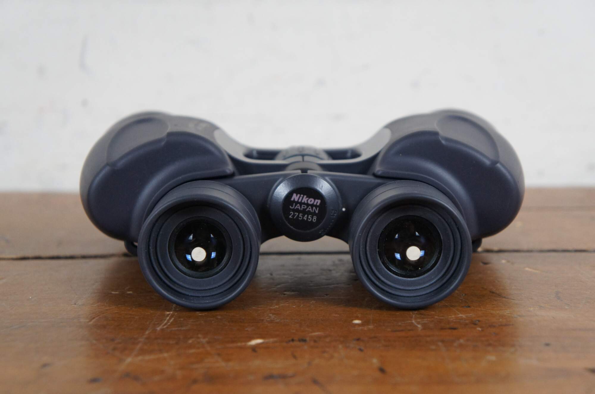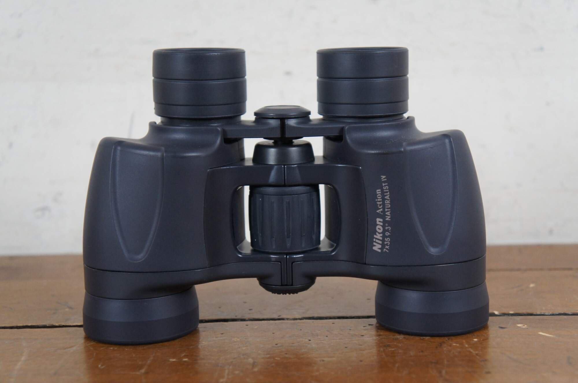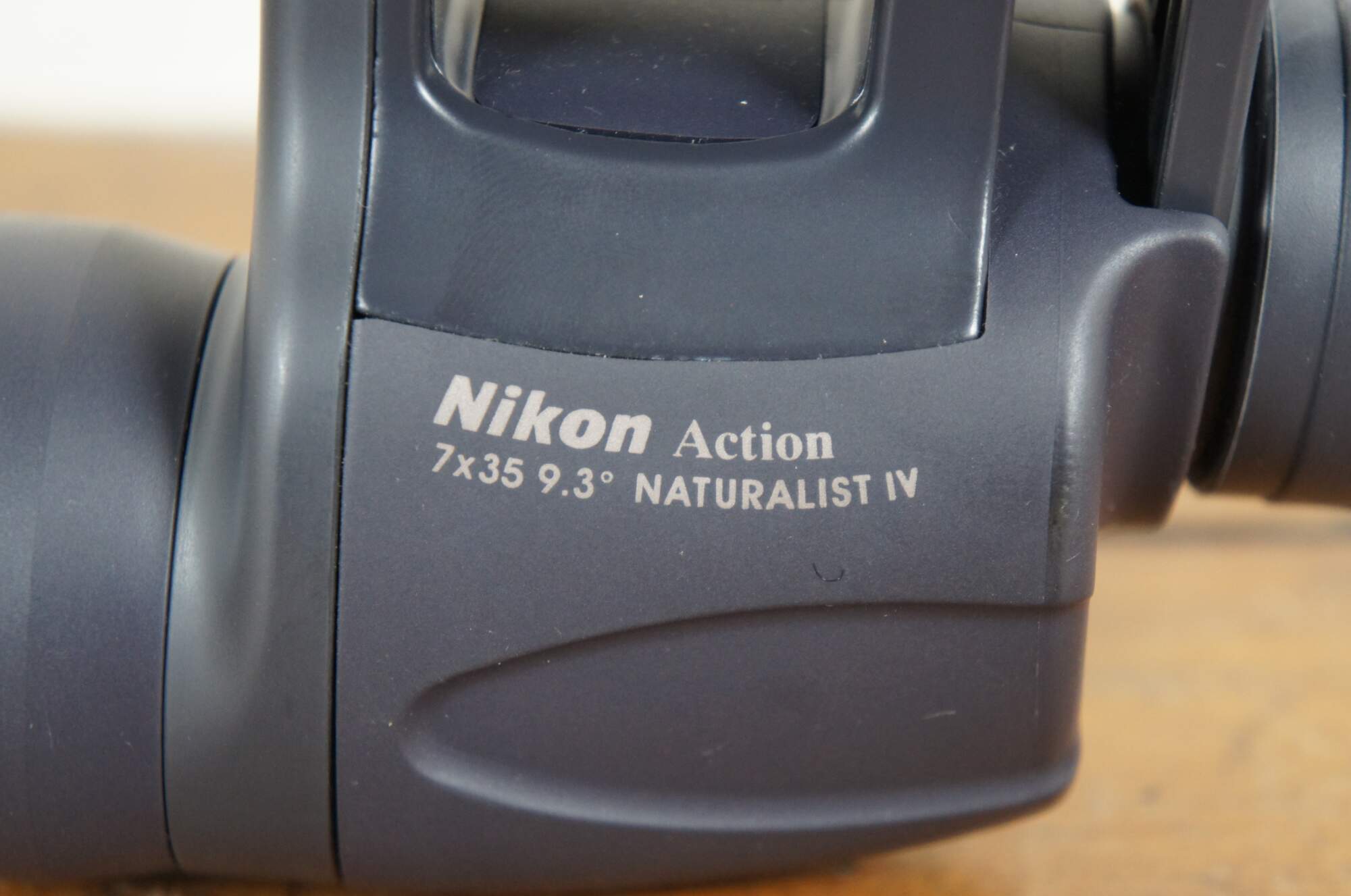 Late 20th century Nikon Action 7x35 9.3 degrees Naturalist IV binoculars and Number 275458. Made in Japan / China. Includes black nylon case / bag.