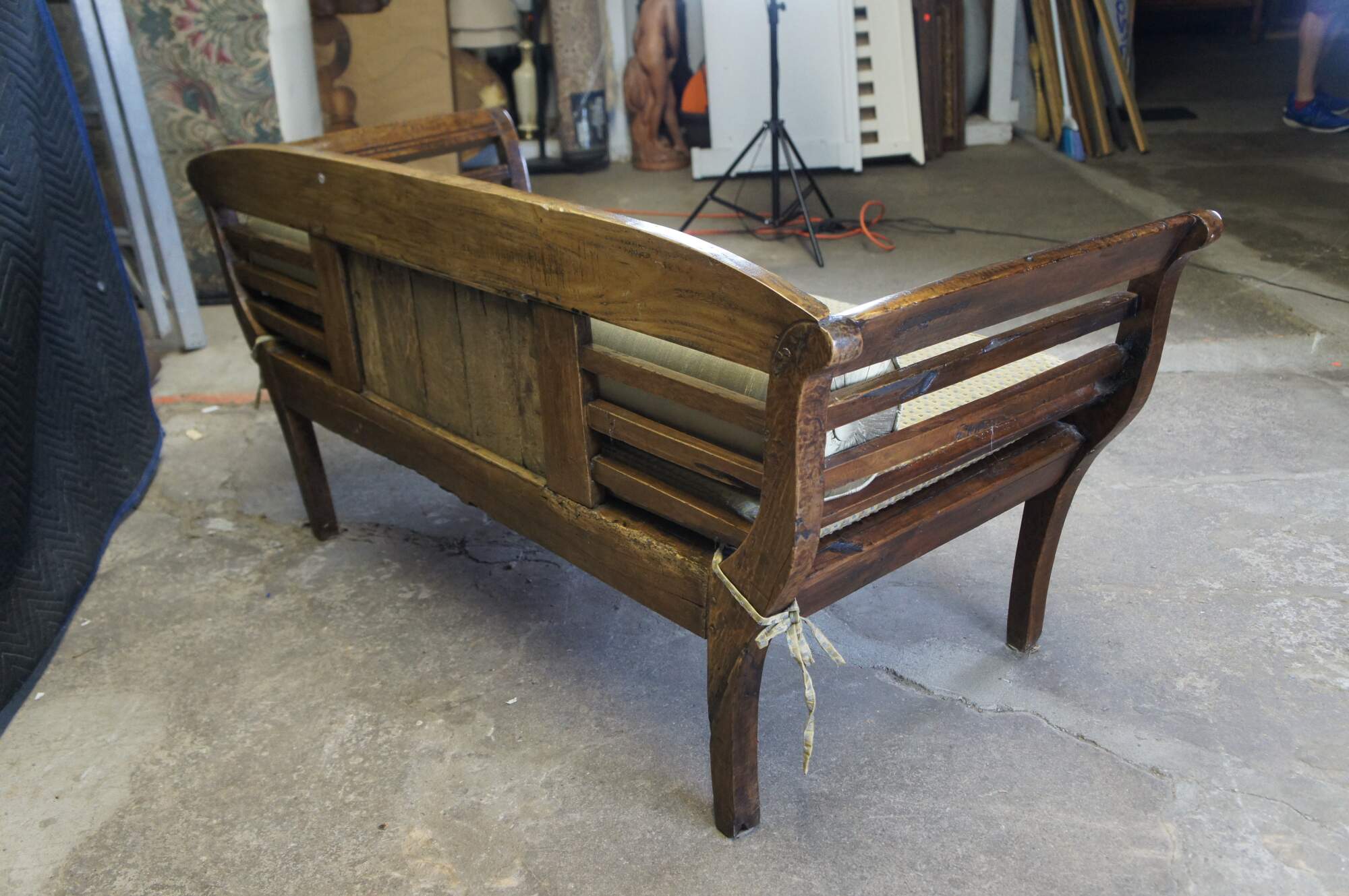 Antique primitive Indonesian / Indian country / farmhouse / colonial bench seat or settee. Made of teak featuring ladderback design with carved floral acanthus paneled back and Jim Thompson silk upholstered cushions.