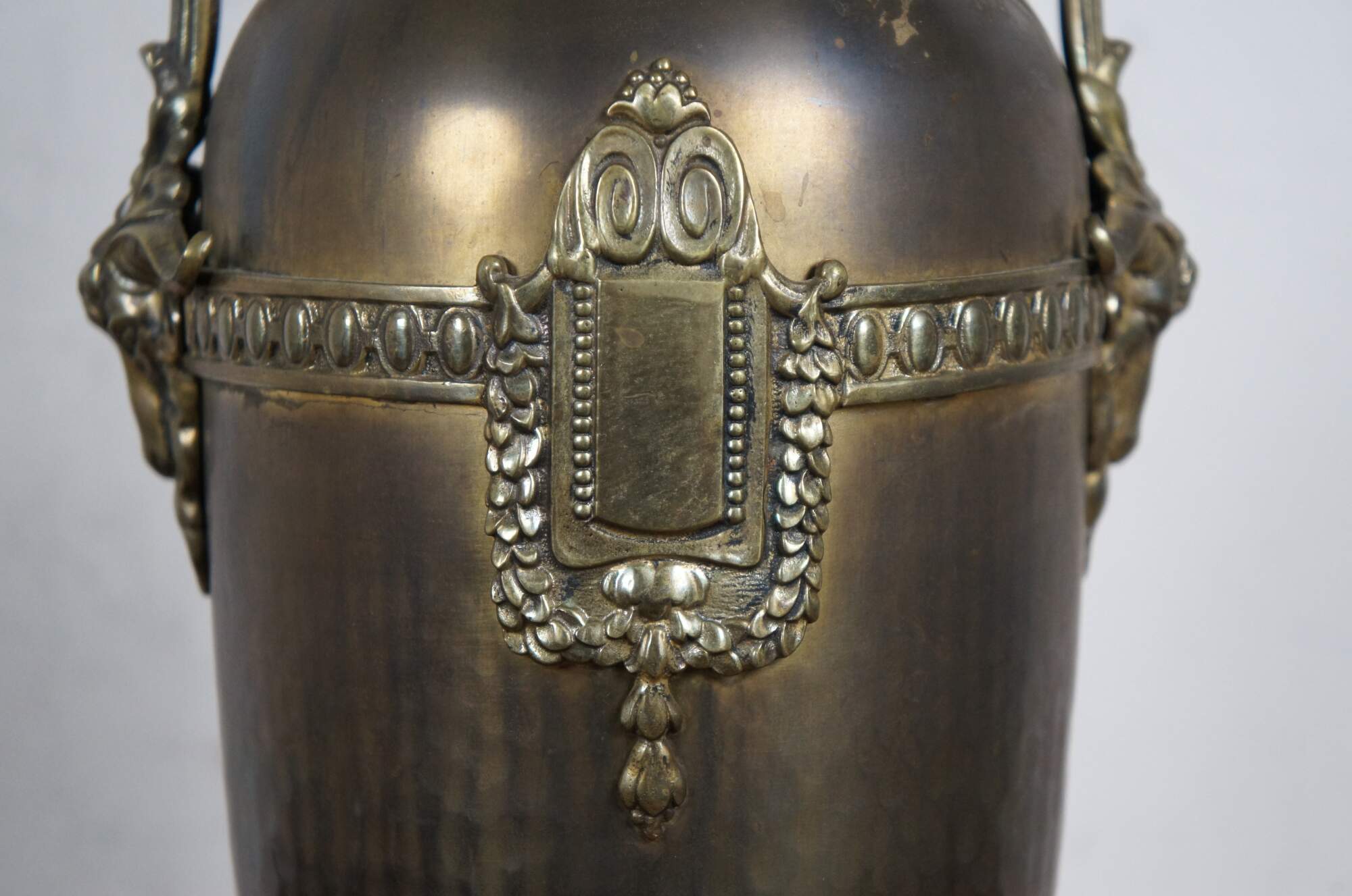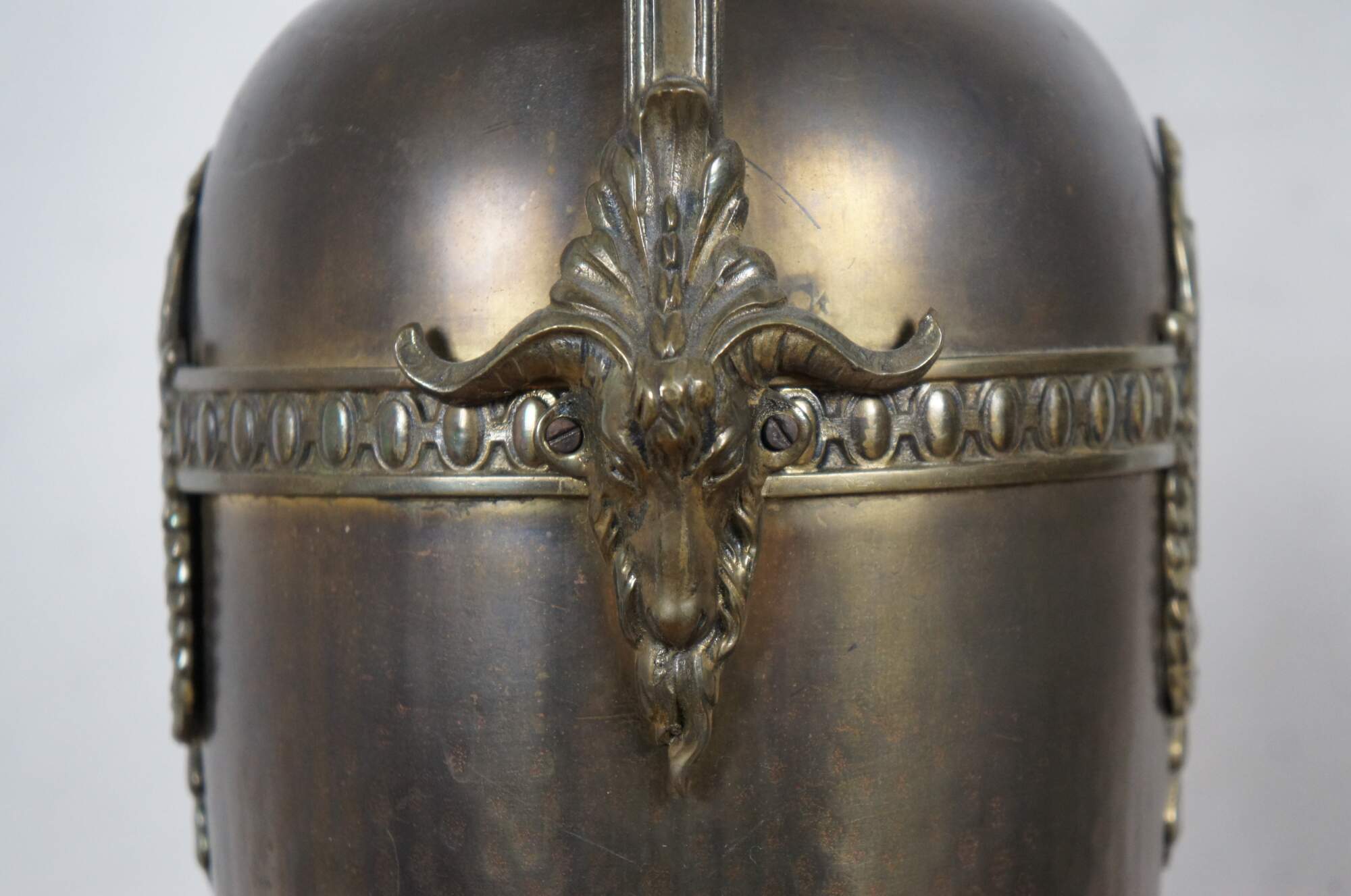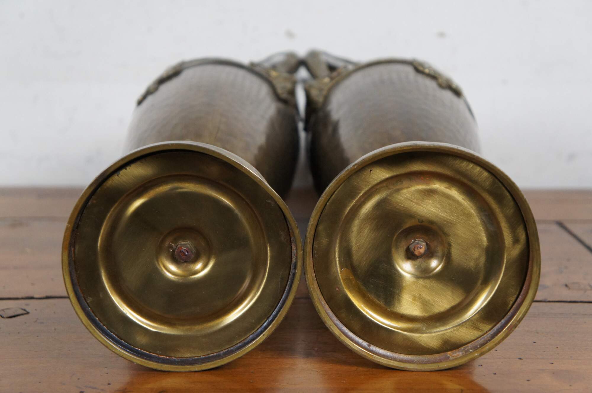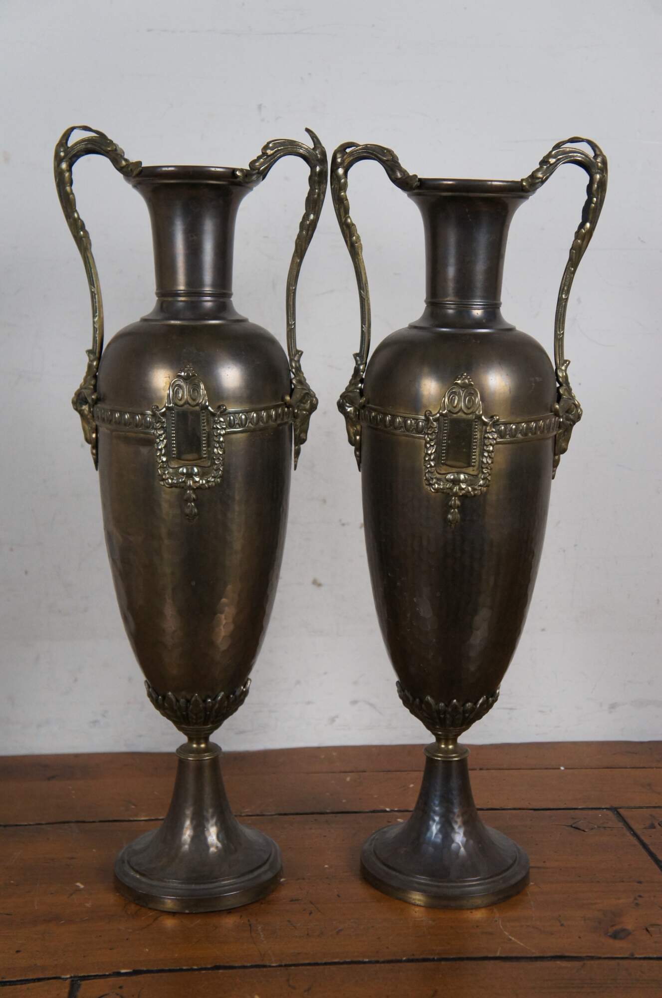 Pair of antique hammered brass mantel vases / trophy urns. Made of brass featuring Neoclassical and Louis XVI styling with round pedestal bases, double scrolled foliate handles, acanthus leaves, framed shields, and rams heads.