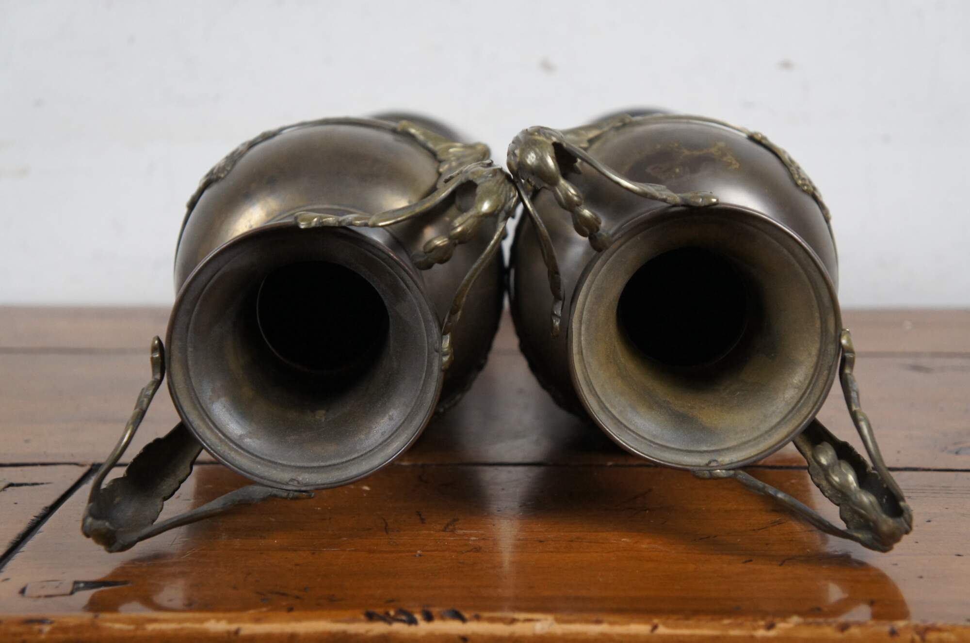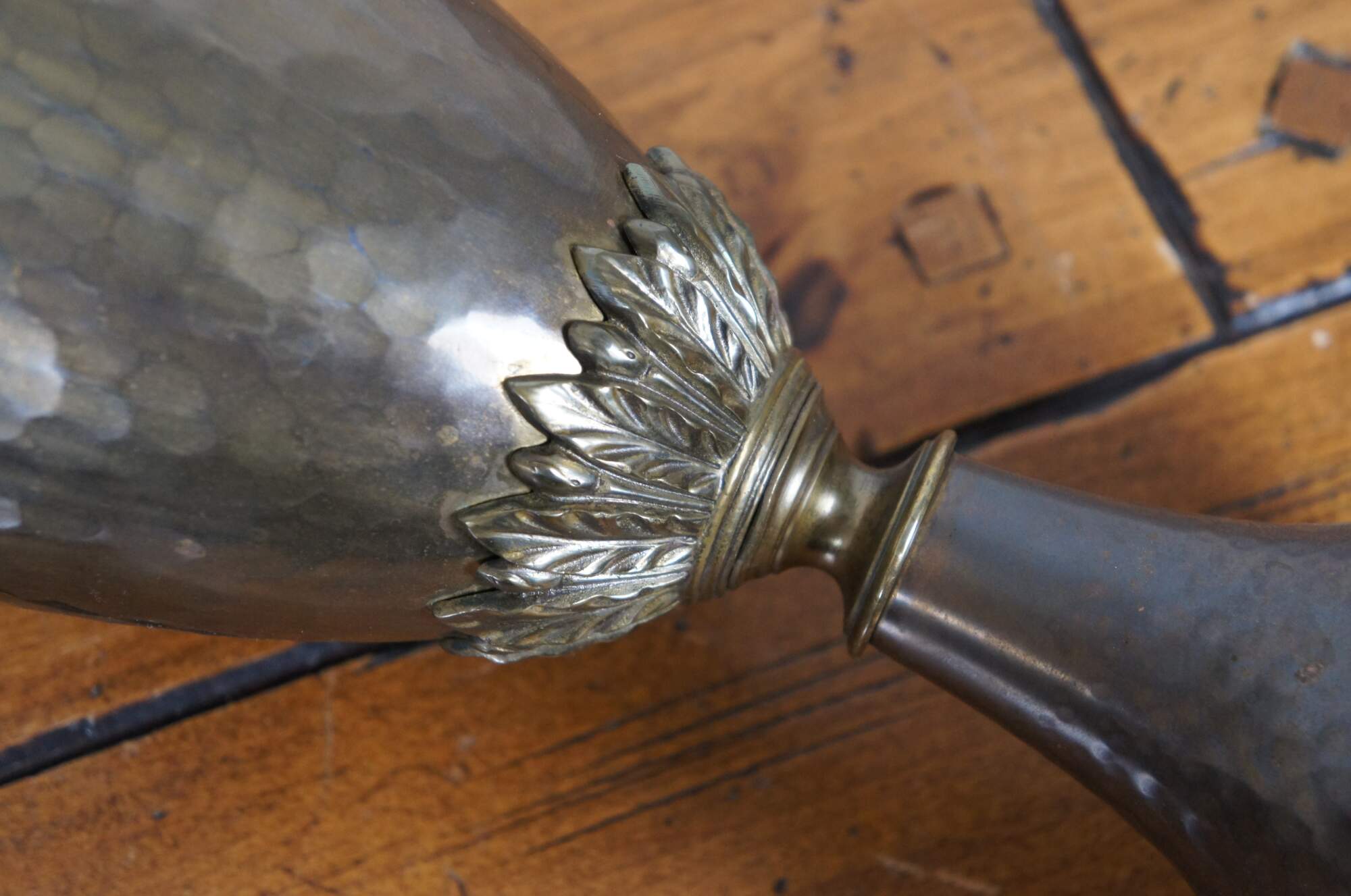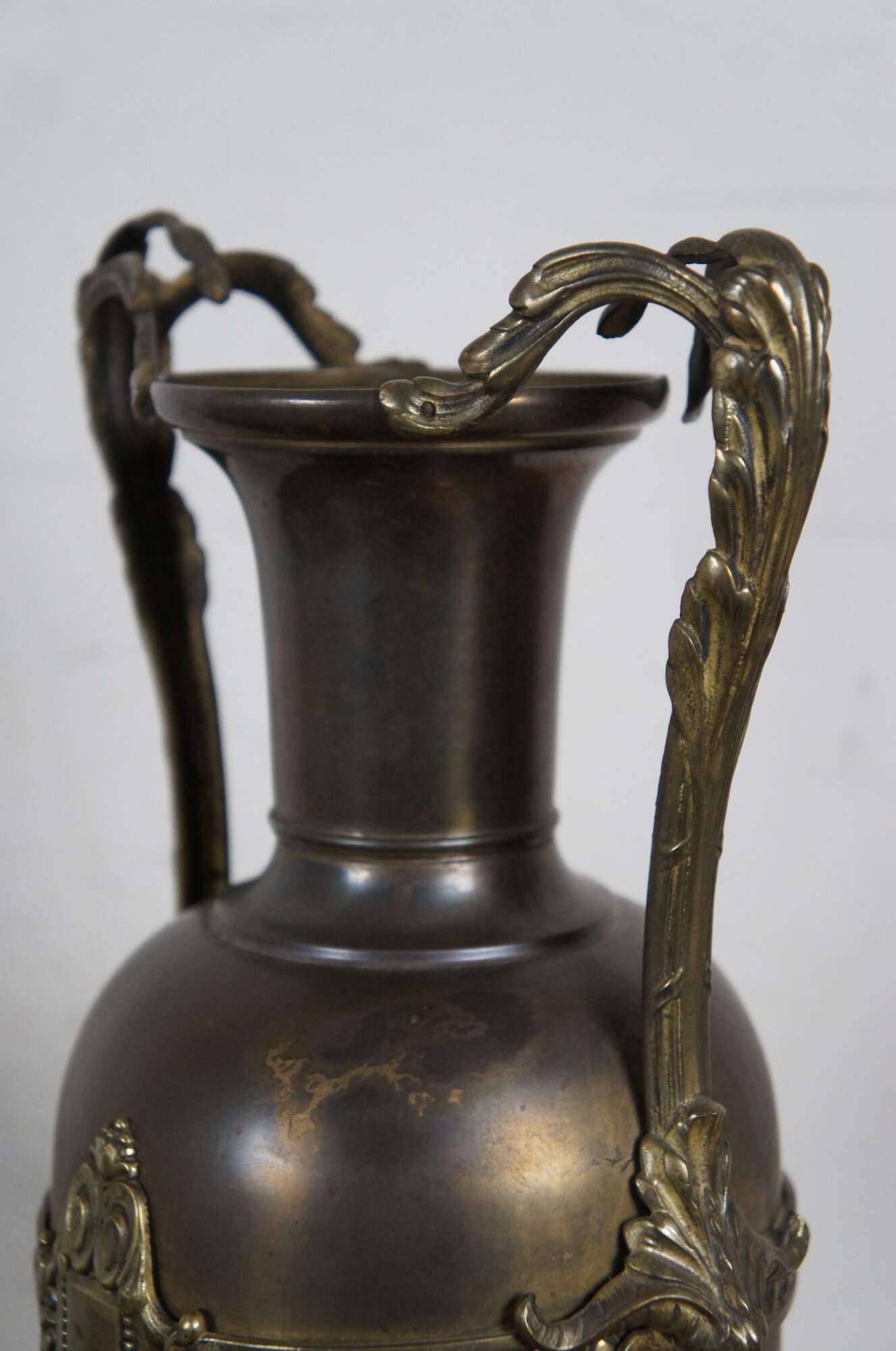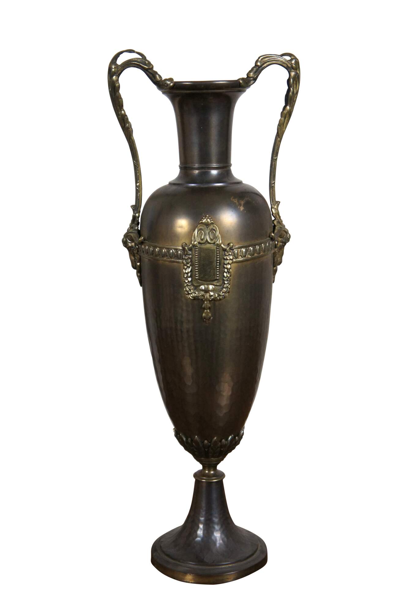 Pair of antique hammered brass mantel vases / trophy urns. Made of brass featuring Neoclassical and Louis XVI styling with round pedestal bases, double scrolled foliate handles, acanthus leaves, framed shields, and rams heads.