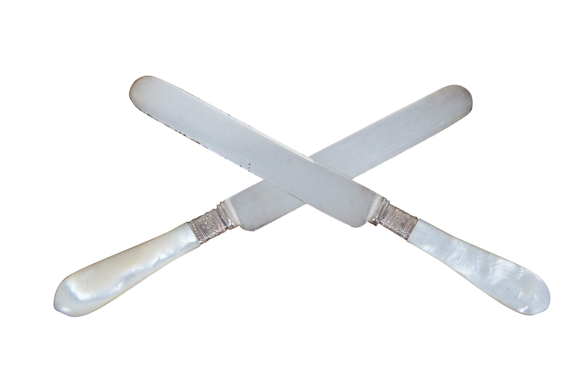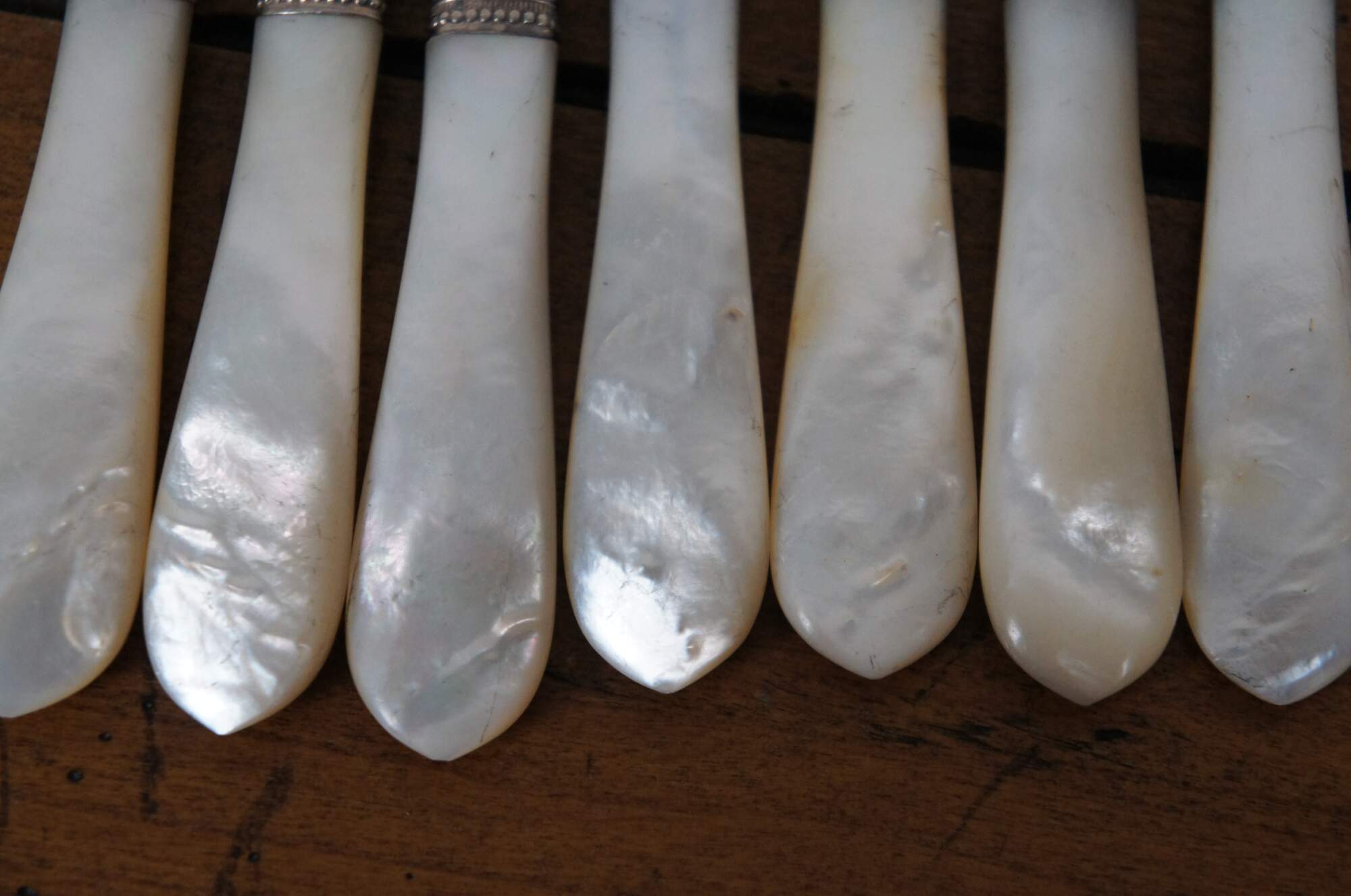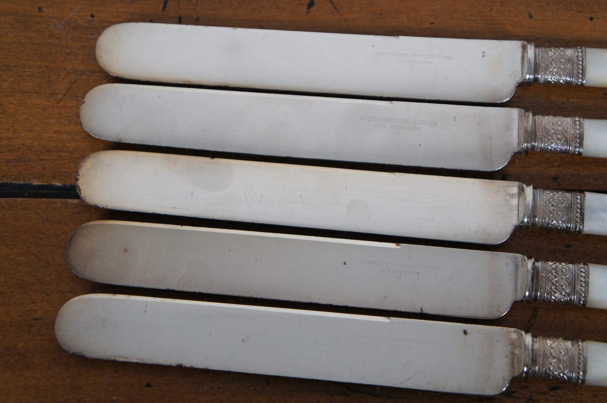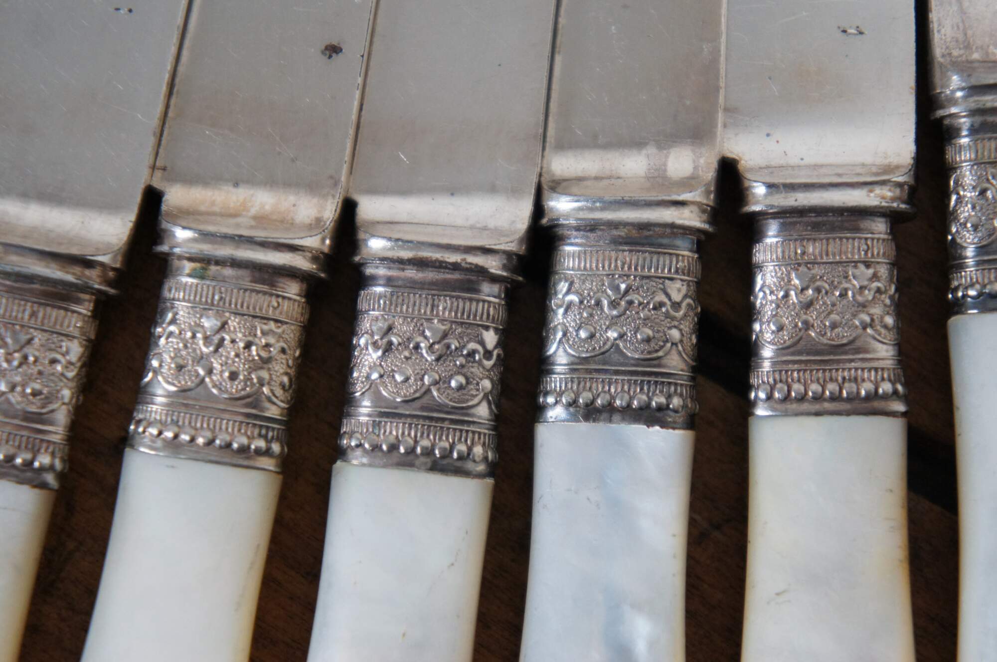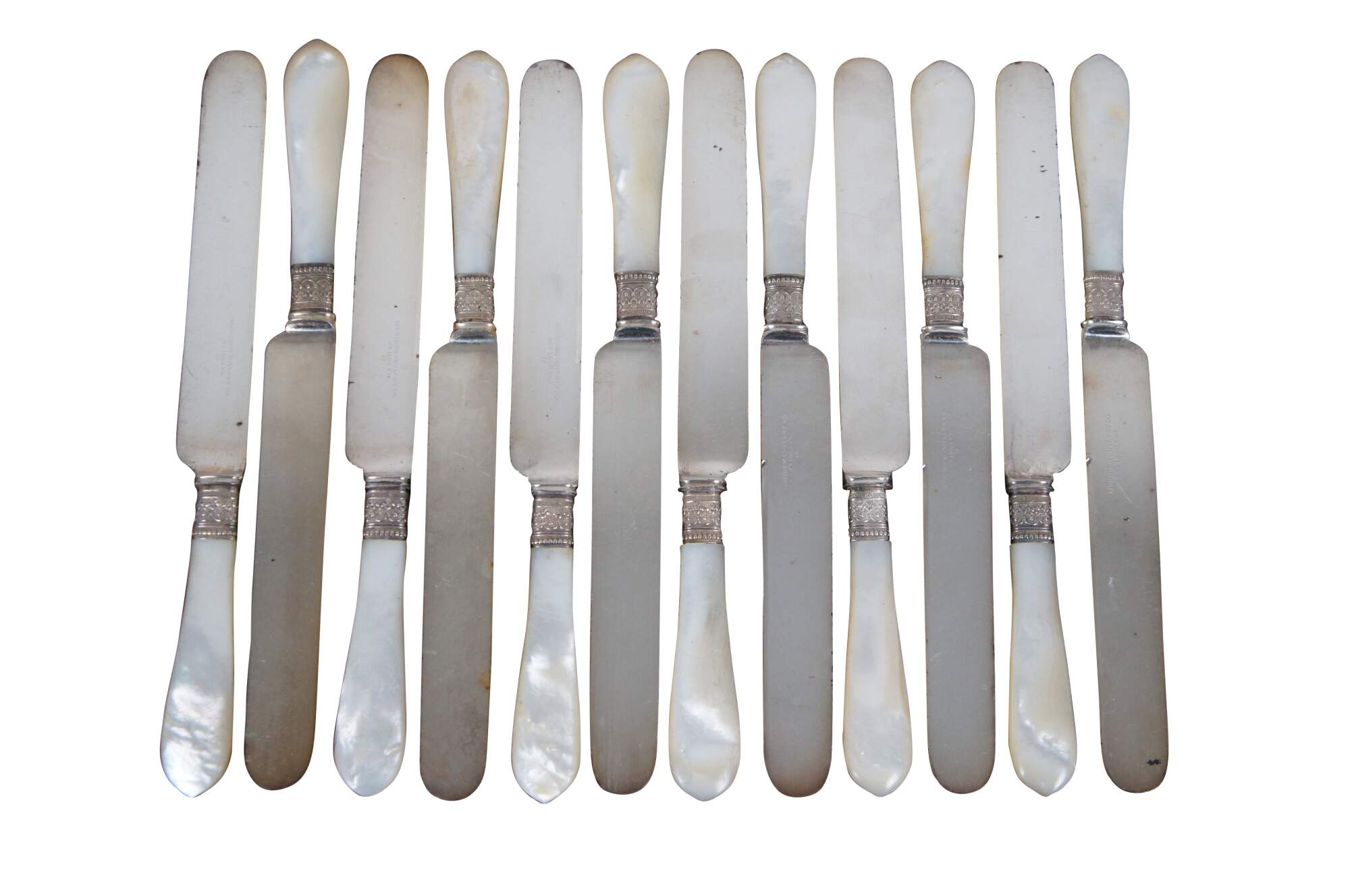 Set of 12 mother of pearl handled table knives by Meriden Cutlery Co. Blades marked with number 12. Beaded and floral repousse silver collars. Includes felt wrapper (not original to knives).