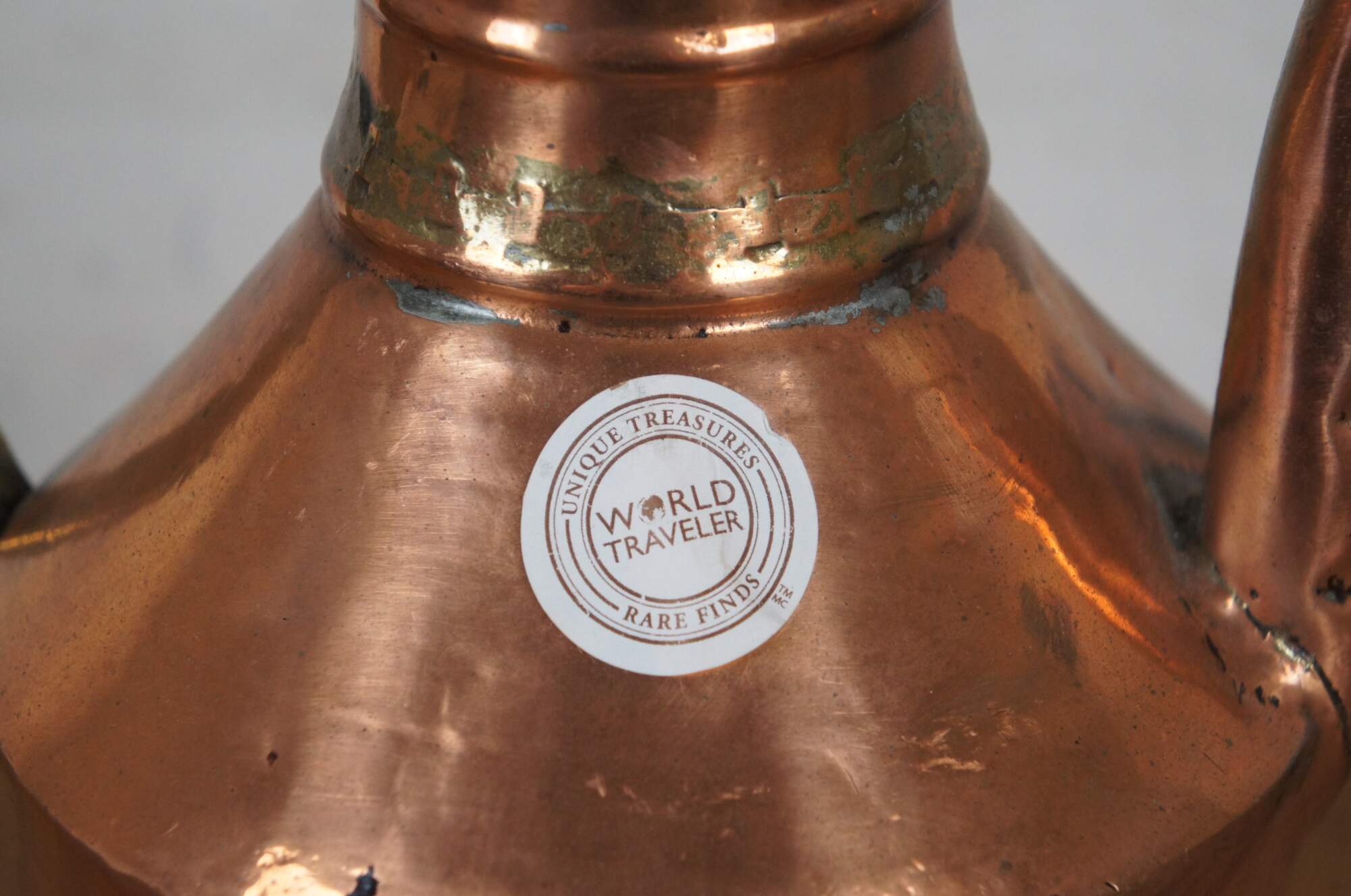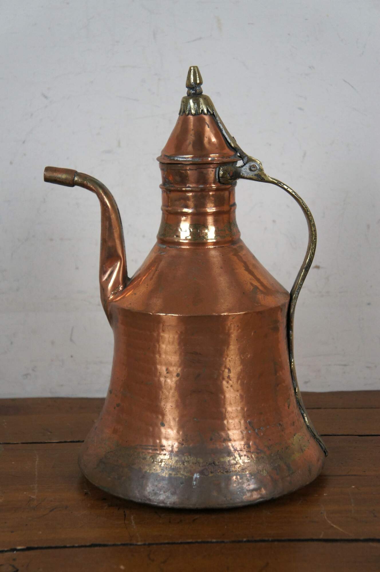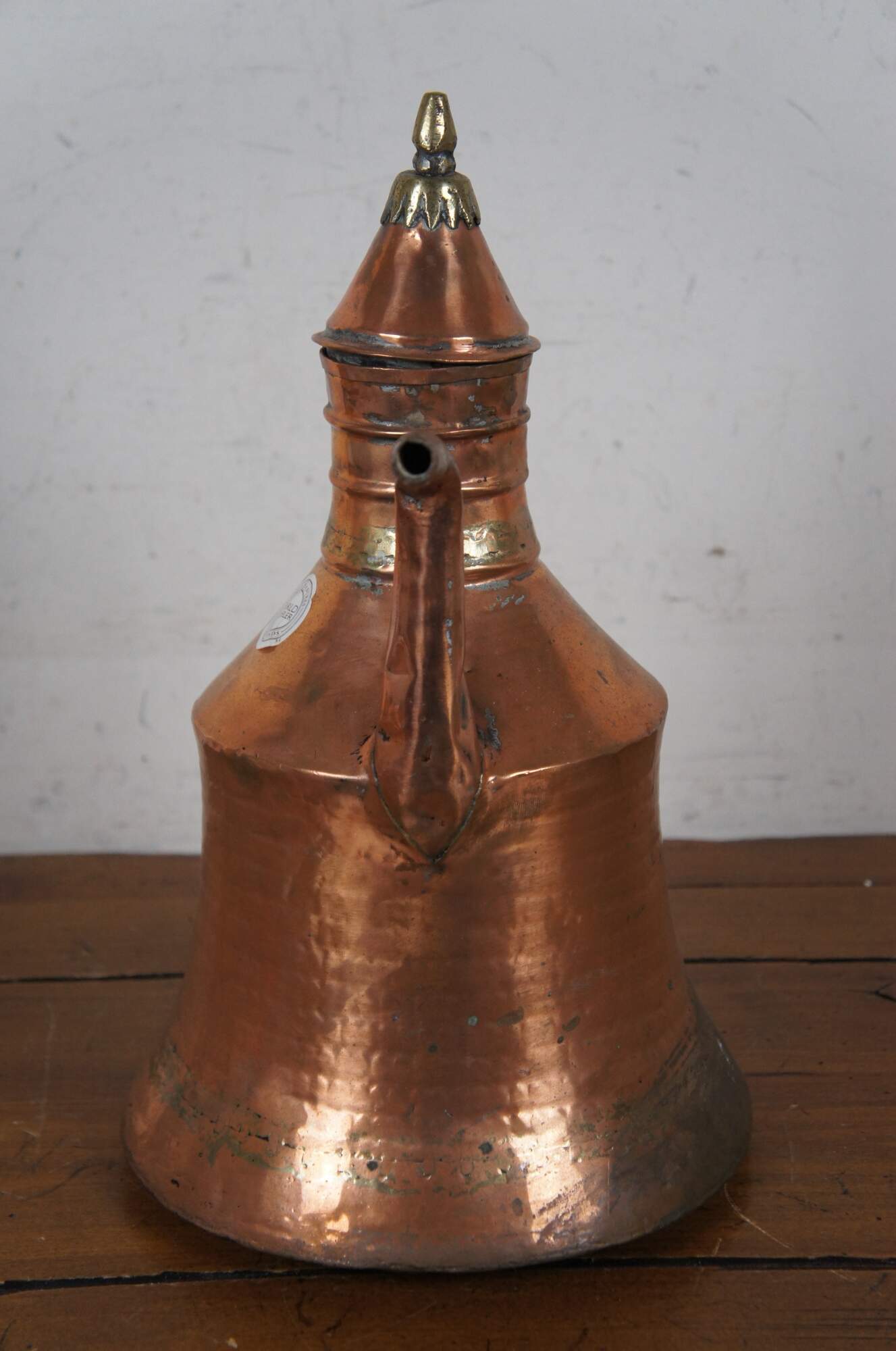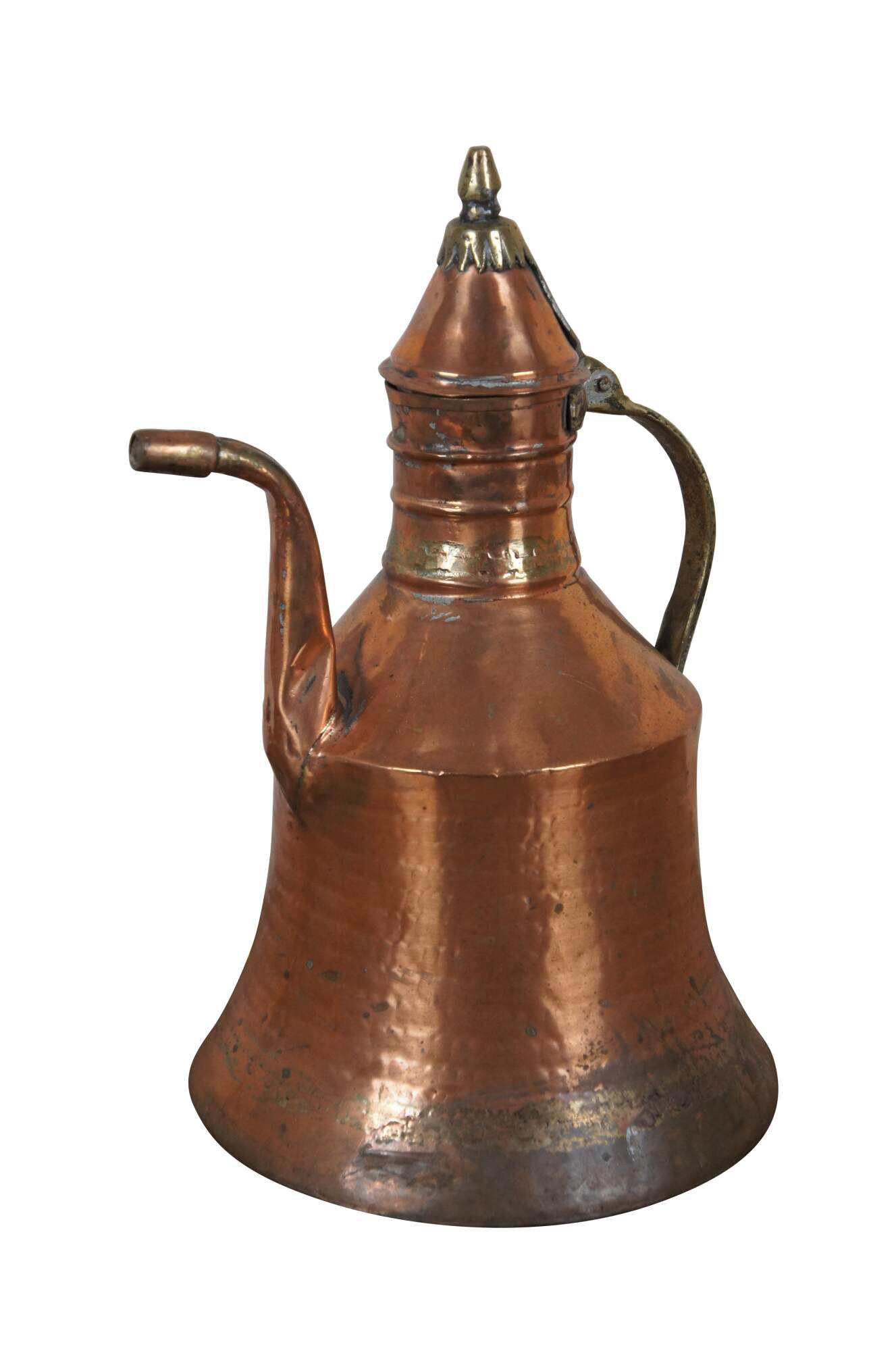 Early 20th century primitive hammered copper and brass Turkish style farmhouse coffee pot / kettle / lidded jug / pitcher / samovar. Round cinched waist body with brass bands, gooseneck spout, fixed brass handle and finial / cap on lid.