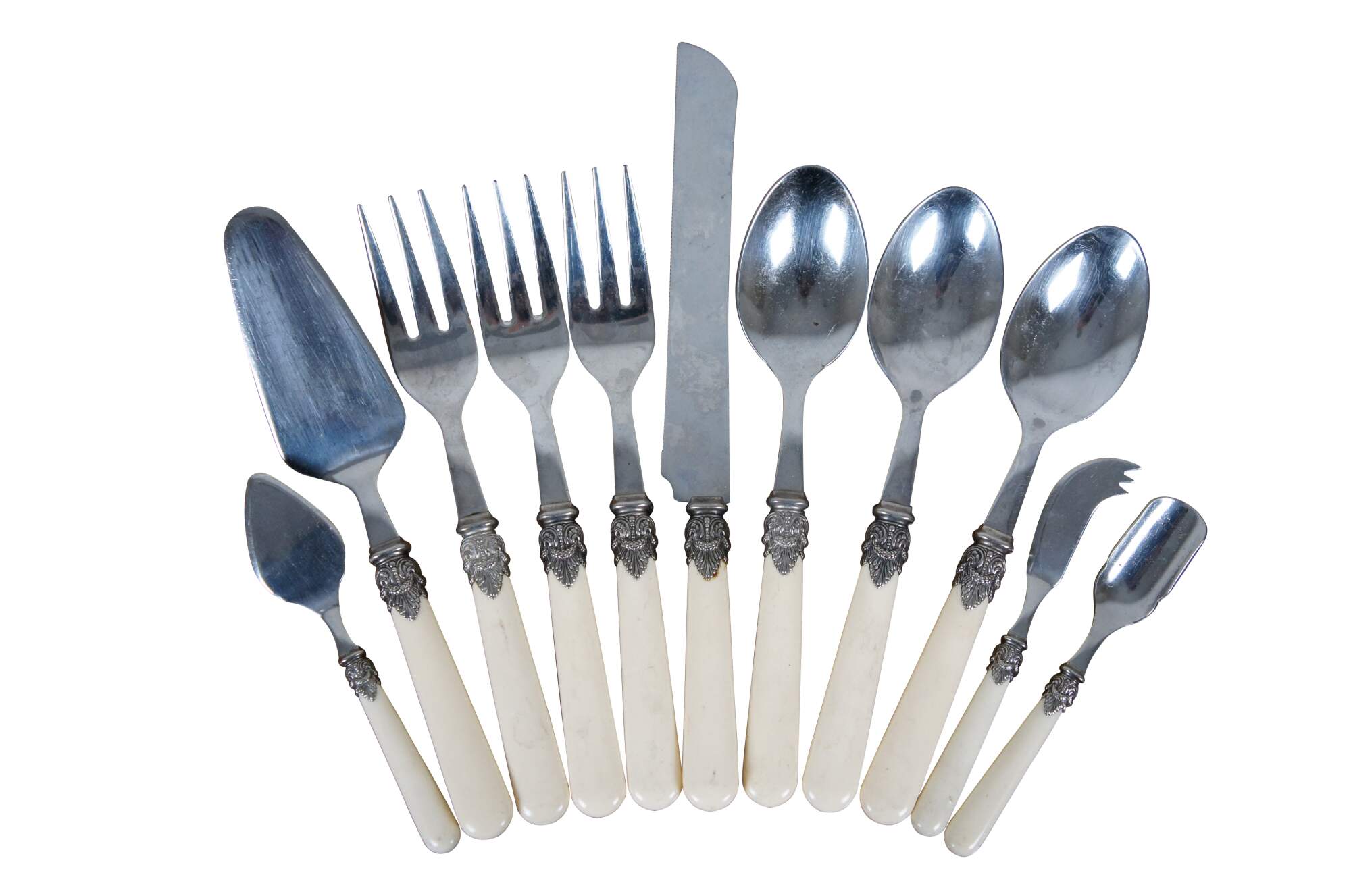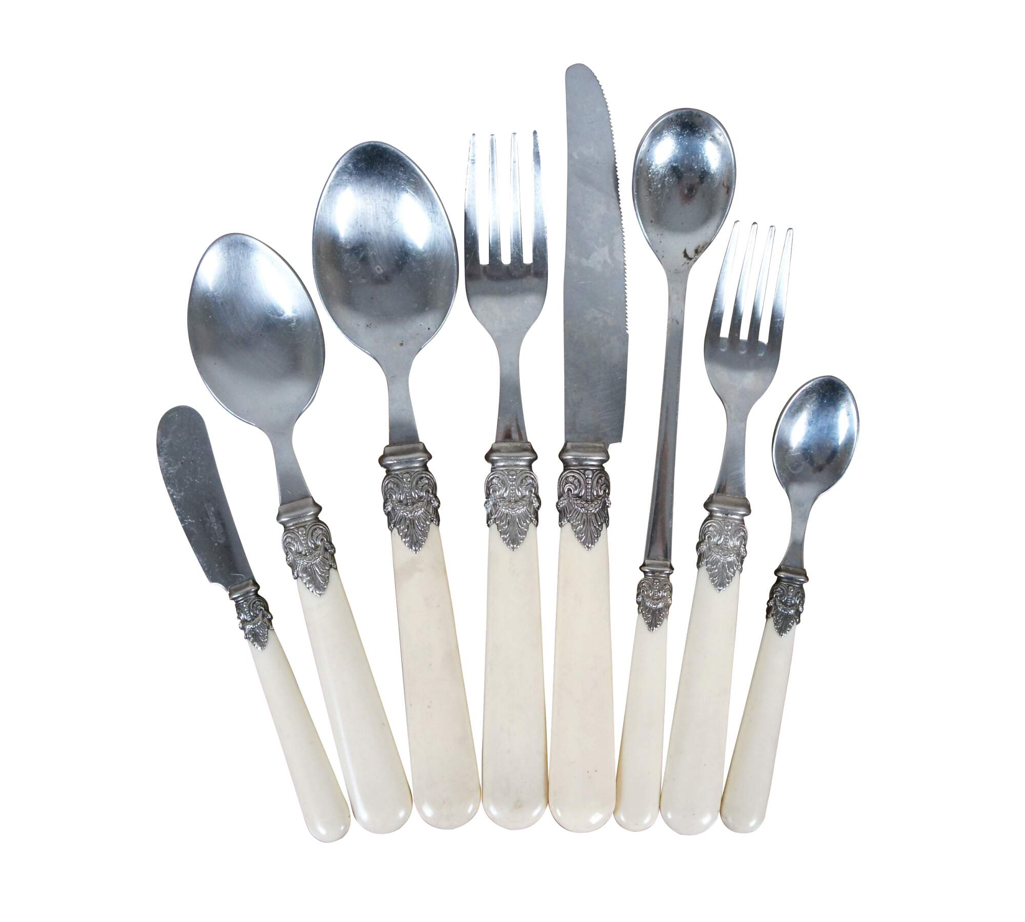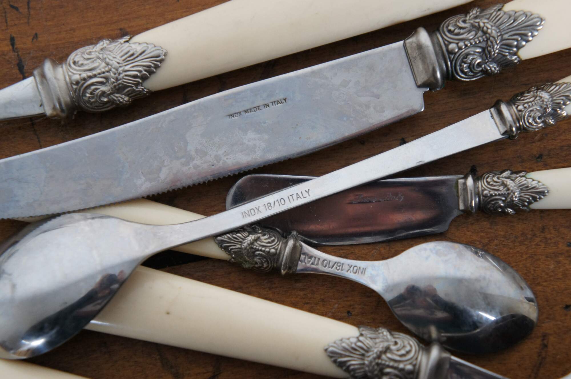 Mid to late 20th century 102 piece set of EME Napoleon style / pattern inox 18/10 (stainless steel) cutlery with faux ivory handles and foliate swag collars. Set includes: 3 types of cheese knife, pie server, 3 serving forks, cake knife, three serving spoons, 13 table knives, 13 dinner forks, 14 table spoons, 13 salad forks, 5 tea spoons, 14 coffee spoons, 15 spreaders, 4 iced tea spoons. Made in Italy.